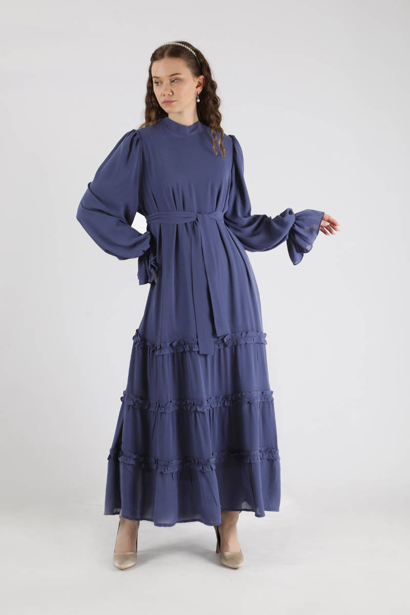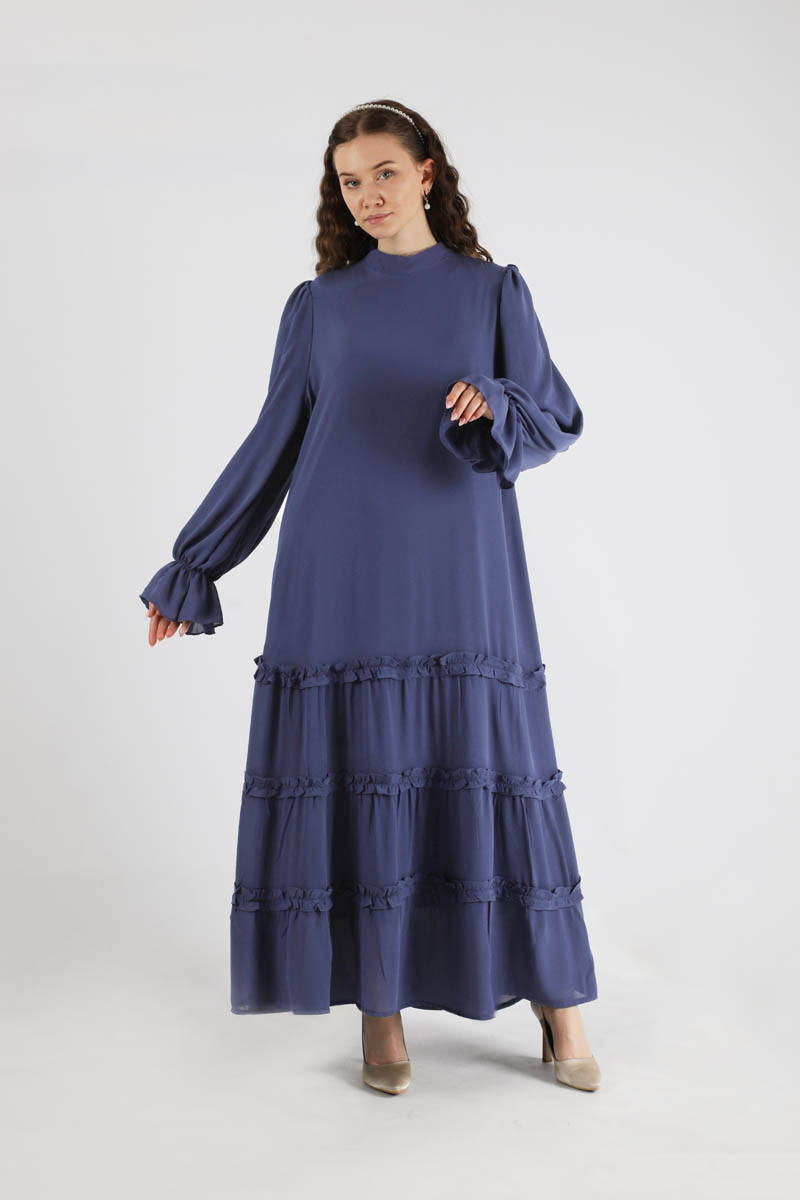 Dökümlü Fırfırlı Elbise Lacivert. Hakim yakalıdır. Omuz tepesi büzgü detaylıdır. Etek kısmı fırfırlıdır. Manşeti lastiklidir. Arkadan fermuarlıdır. Astarlıdır. Günlük kullanım ve özel günlerinizde tercih edebilirsiniz.