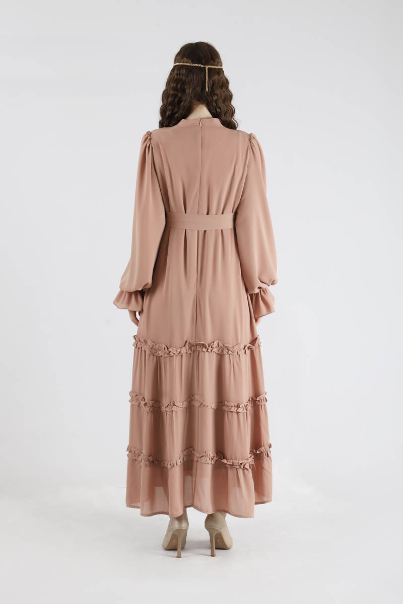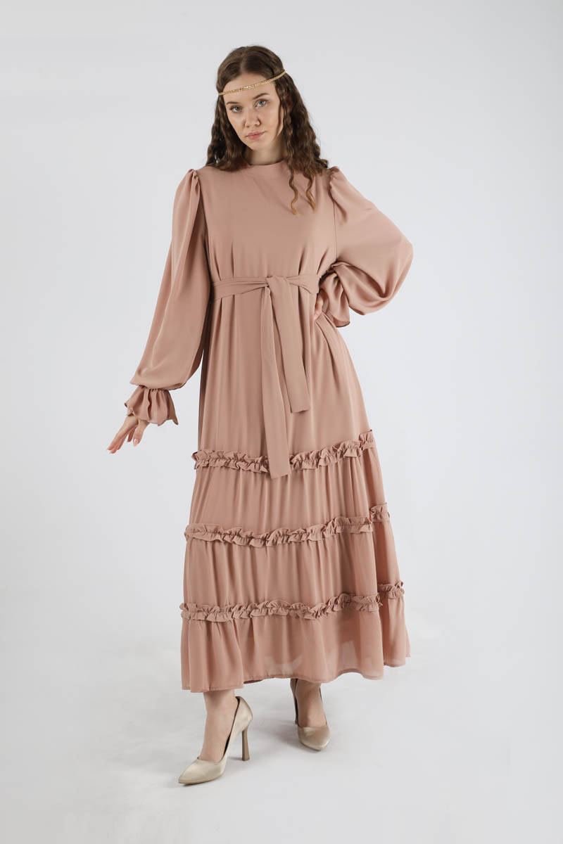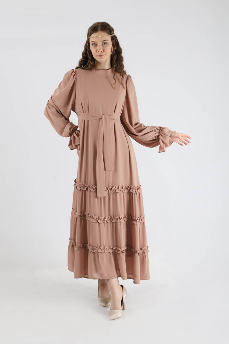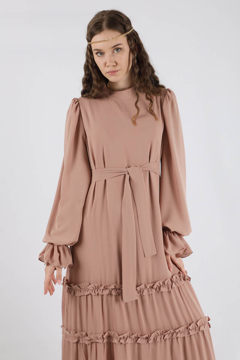 Dökümlü Fırfırlı Elbise Vizon