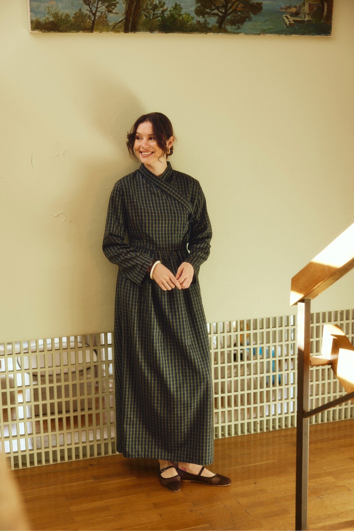 Double-Breasted Plaid Dress Khaki brings the classic plaid pattern into a modern silhouette with its double-breasted neckline and waist-accentuating cut. The wrap detail on the bodice adds character, while the gathered waist and tie belt create a balanced, feminine look. The flowing skirt offers ease of movement, and with its long sleeves and plaid pattern, it is a timeless piece suitable for styling across all seasons. It offers versatile wear from everyday city looks to more refined outfits.