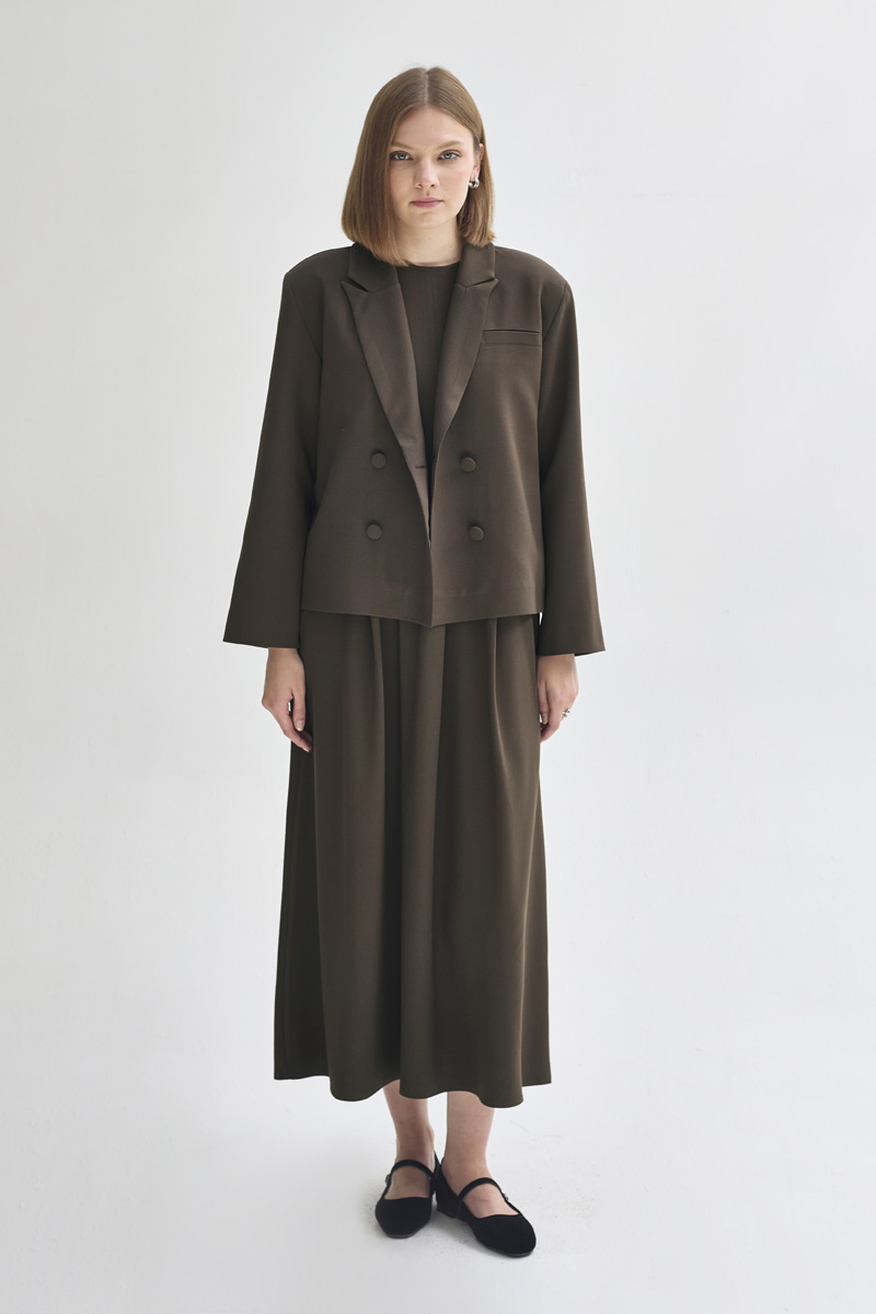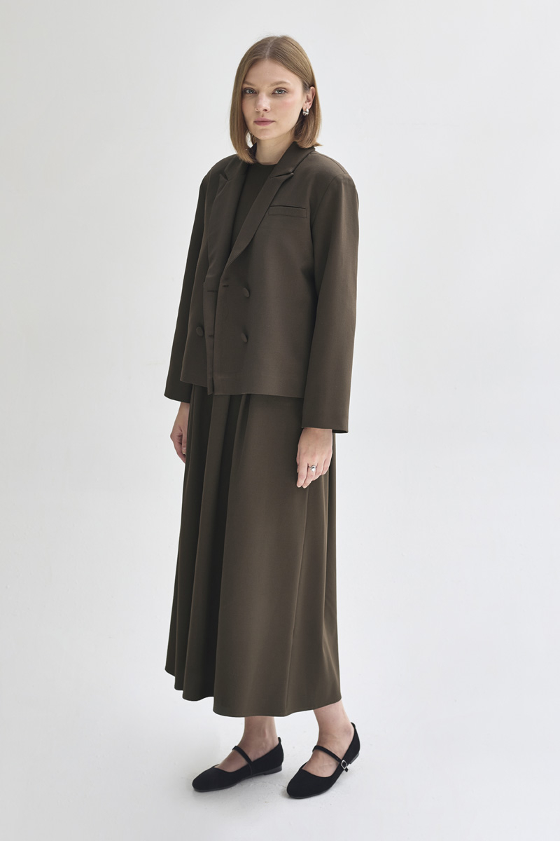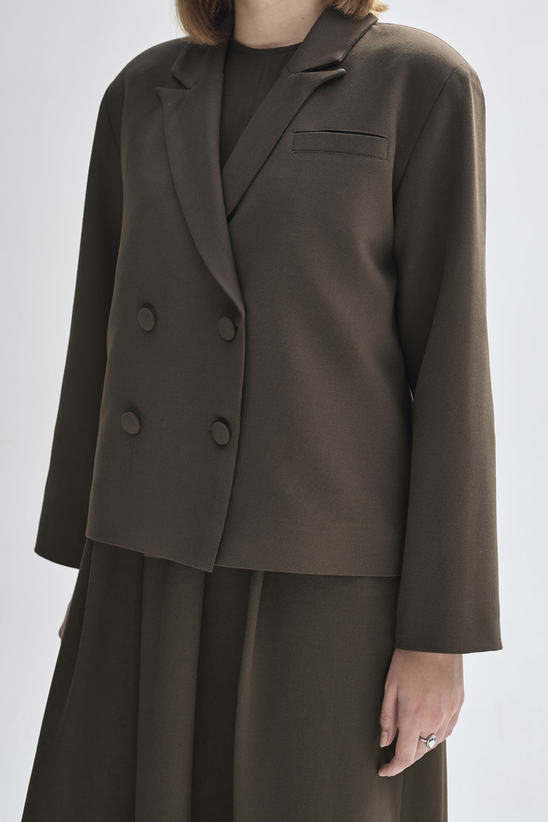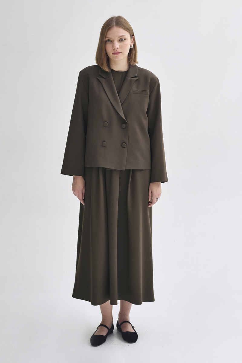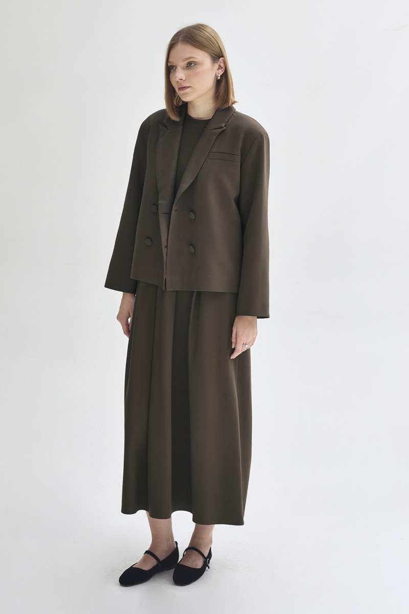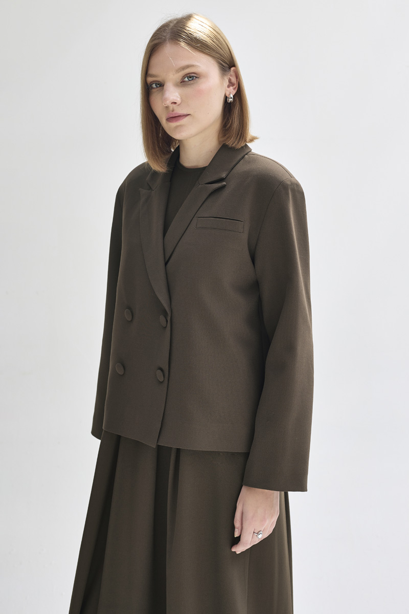 With its minimal and elegant design, this short blazer reflects a modern sense of sophistication. The double-breasted lapel detail and front button closure bring a classic blazer look, while the cropped length makes it easy to pair with both skirts and trousers. Its fully lined structure ensures a comfortable wearing experience.