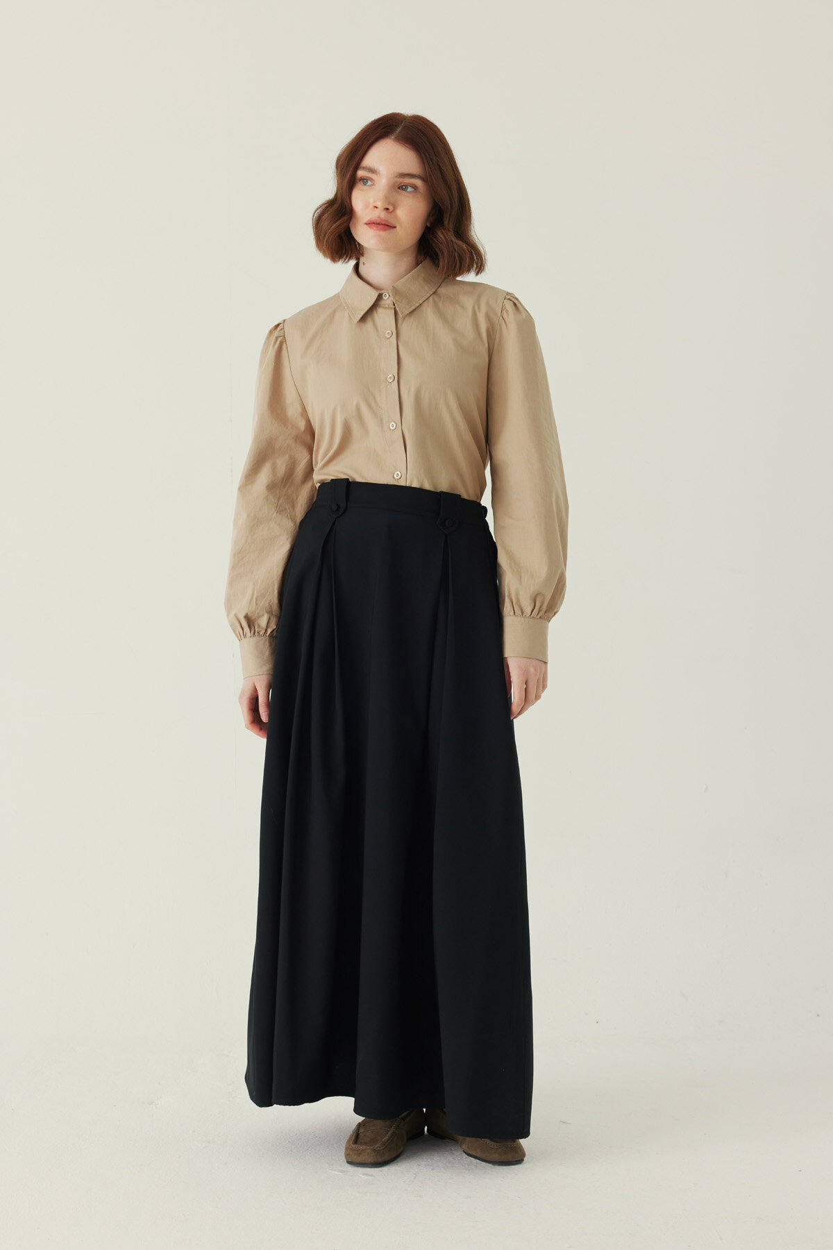 Double Pleated Tencel Skirt Black offers a timeless silhouette with its simple yet strong form. The high-waisted cut shapes the waist in a balanced way, while the double pleat detail on the front adds natural volume and a fluid drape to the skirt. Thanks to its Tencel-textured fabric, it provides comfortable wear throughout the day and maintains its shape with movement. A versatile wardrobe essential that transitions effortlessly from everyday city outfits to more refined looks.