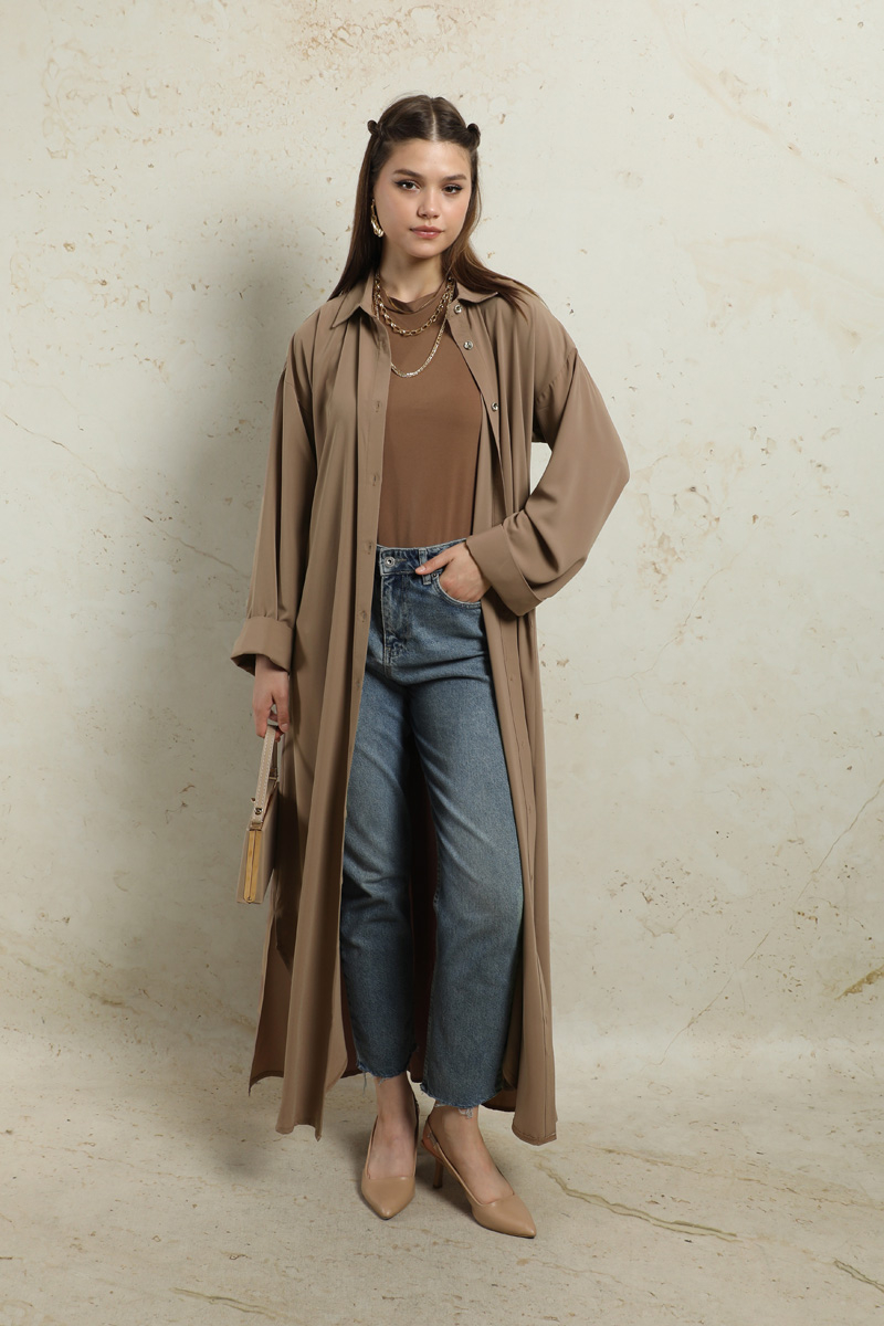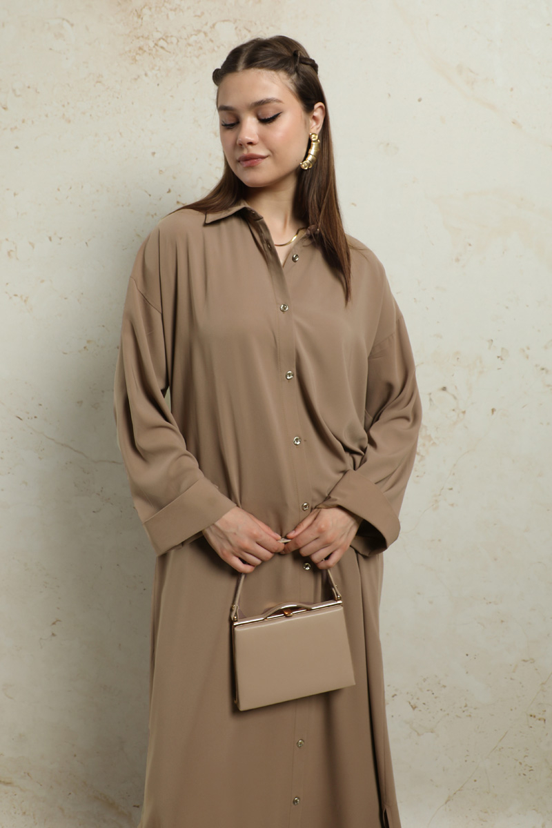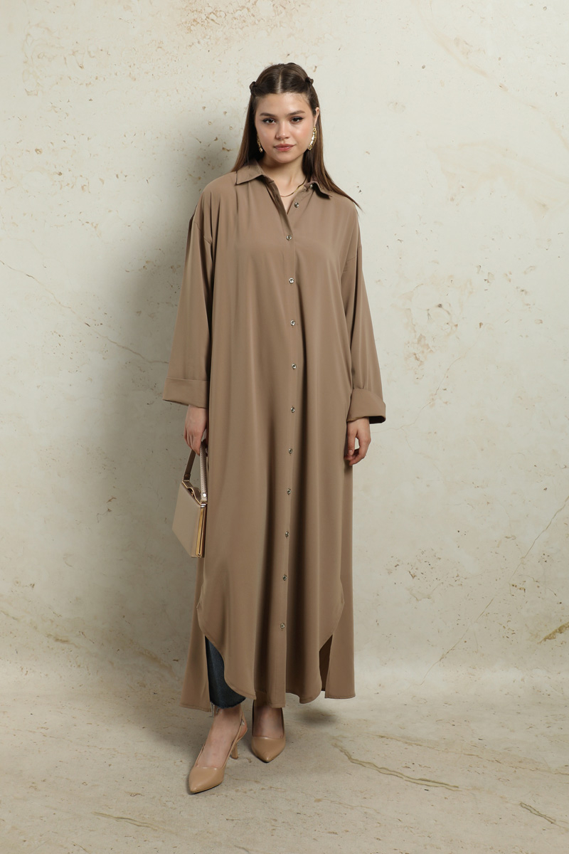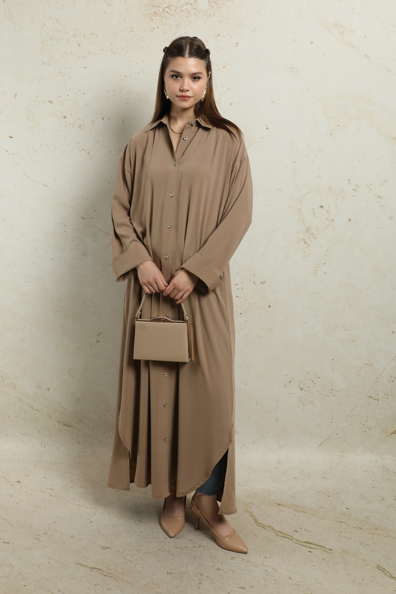 Duble Kol Salaş Gömlek Taba. Gömlek yakalıdır. Düşük omuzludur. Duble koldur. Önü düğmelidir. Yandan ceplidir. Eteği oval kesimdir. Yandan yırtmaçlıdır. Günlük ve özel günlerinizde kullanabilirsiniz.