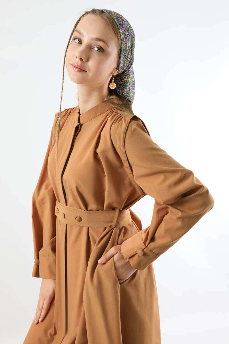 Düğme Detaylı Gömlek Elbise Açık Taba. Hakim yakalıdır. Gizli düğmelidir. Manşeti pile detaylıdır. Omuz tepesi büzgülüdür. Arka yaka altında büzgü detayı mevcuttur. Kuşaklıdır (Kuşağı ilik düğmelidir). Astarsızdır. Günlük kullanım ve özel günlerinizde tercih edebilirsiniz.
