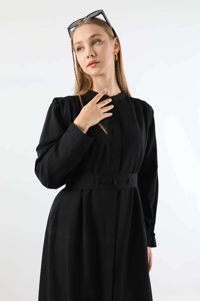 Button Detailed Shirt Dress Black. The judge has a collar. It has a hidden button. The cuff has pleat detail. The top of the shoulder is gathered. There is a gather detail under the back collar. It is belted (The belt is buttoned). It is unlined. You can choose it for daily use and special occasions.