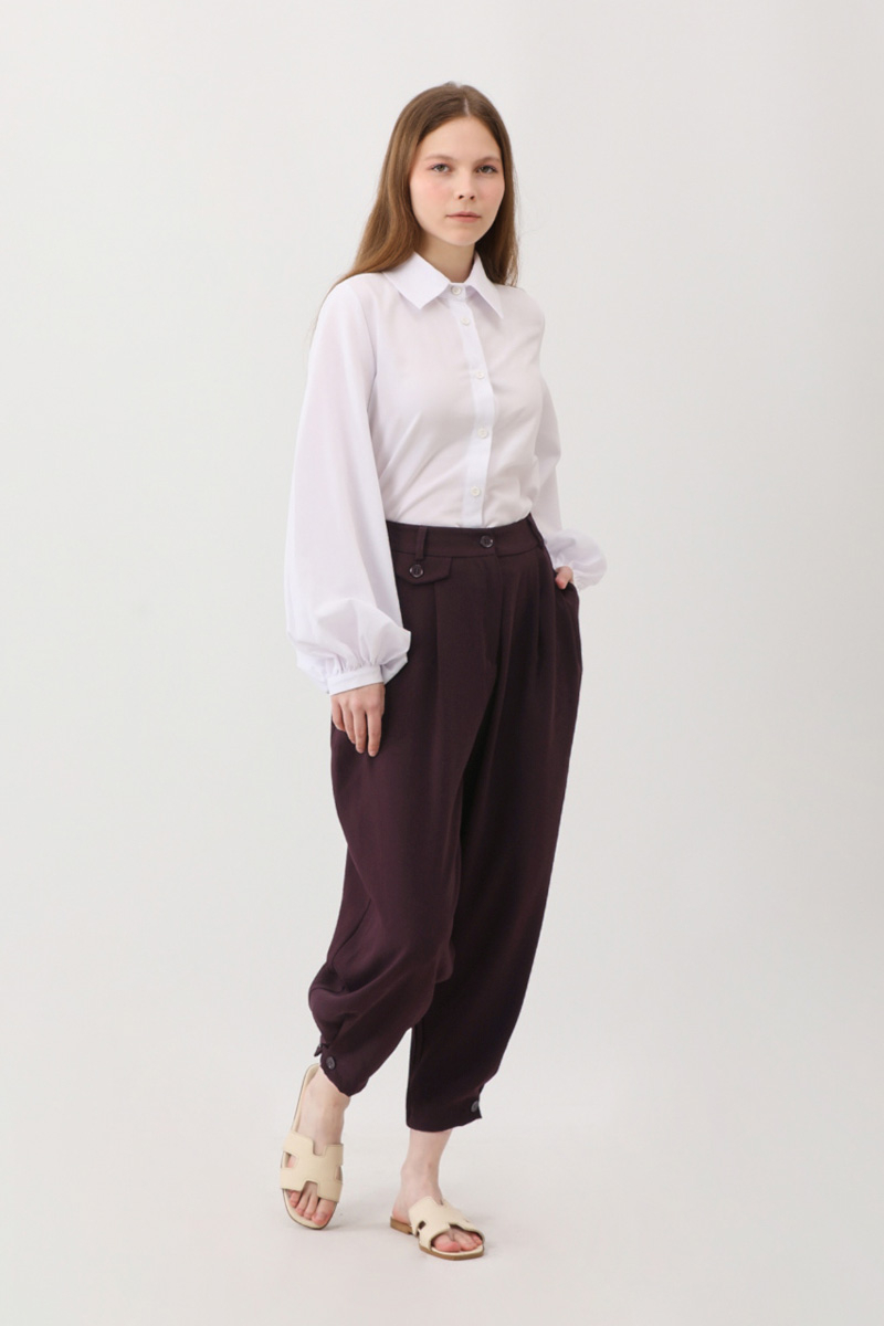 Düğme Detaylı Pantolon Mürdüm. Önden pilelidir, yandan ceplidir, Havuç kesimdir, bel ve paçadan düğme detaylıdır, fermuarlı ve düğmelidir, astarsızdır. Günlük kullanım için uygundur.