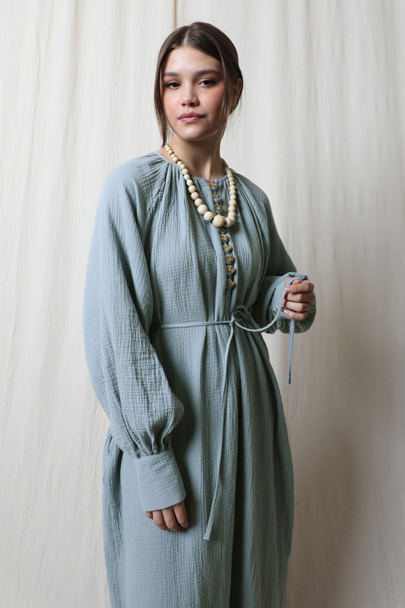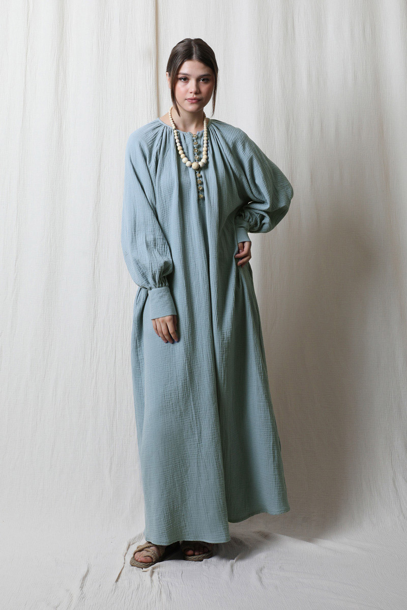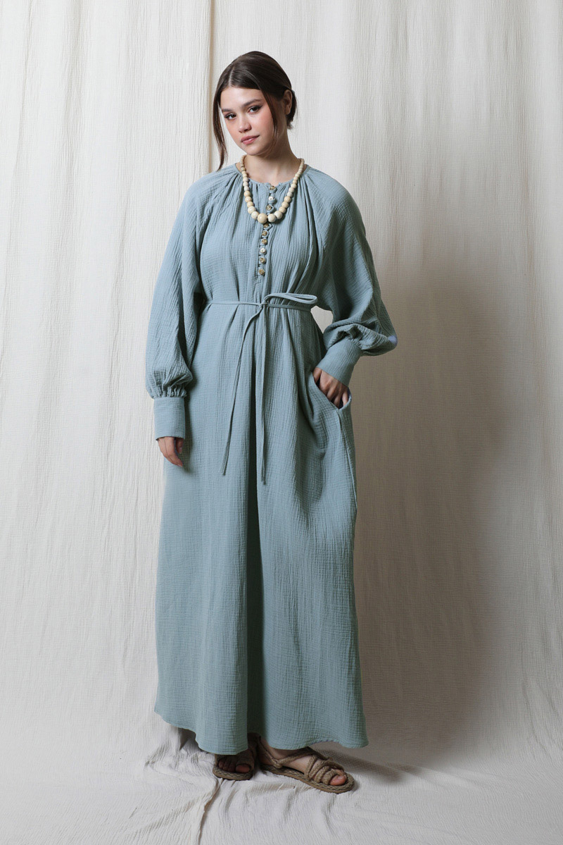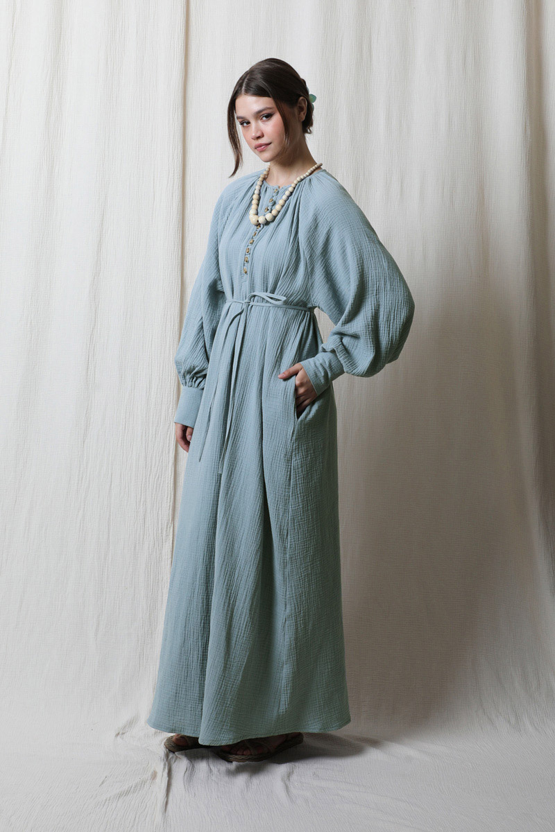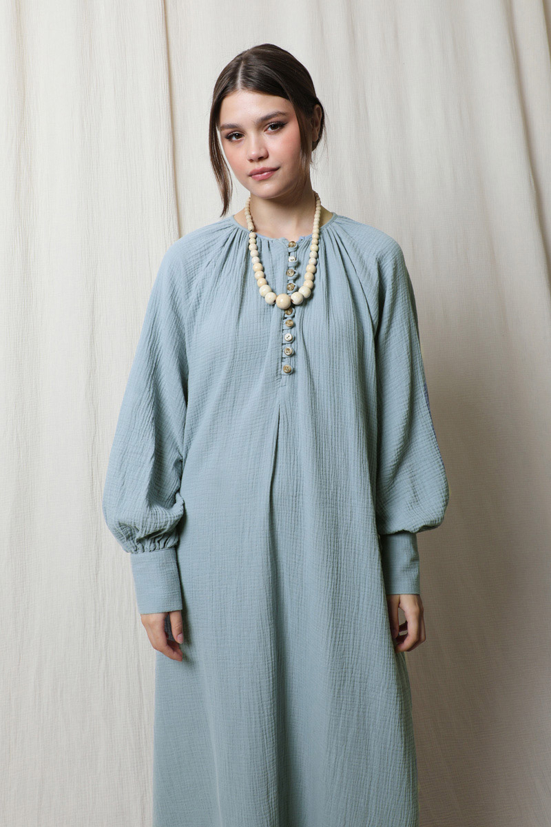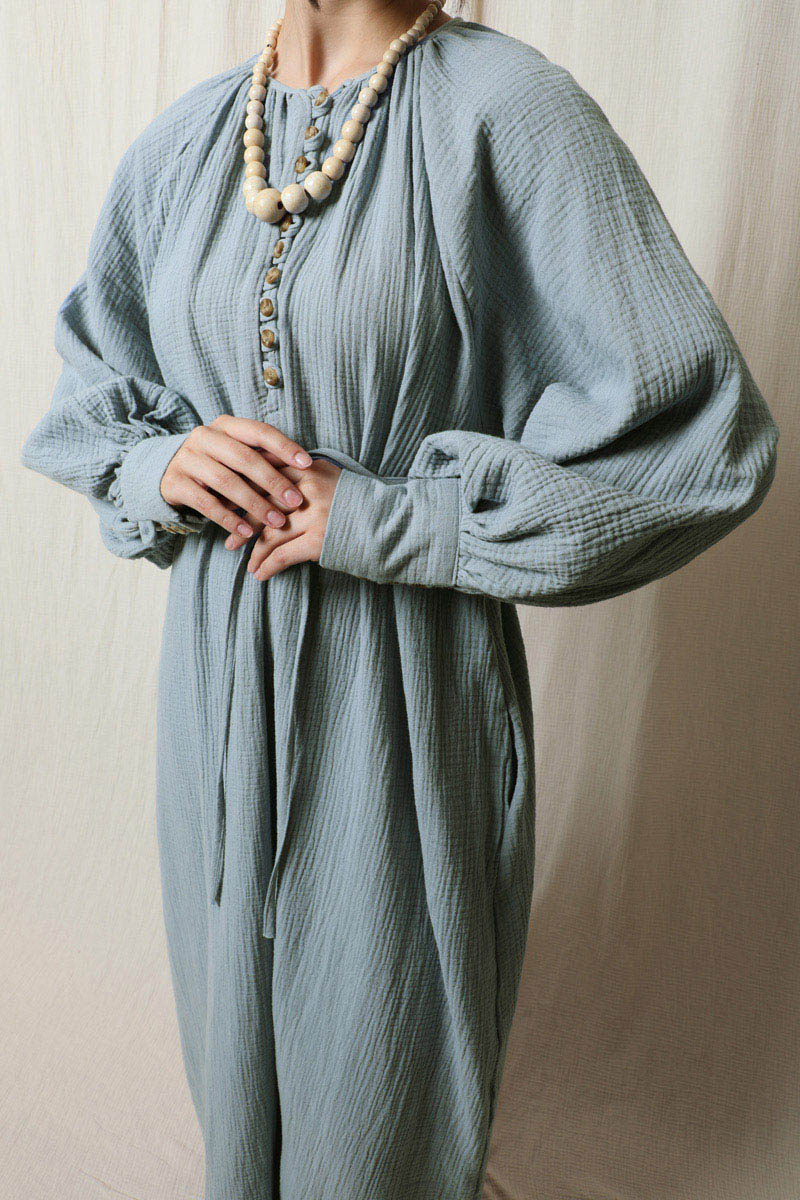 Düğme Yaka Müslin Elbise Lacivert. Bisiklet büzgülü yaka, önden yarım birit düğmeli, yandan gizli cepleri mevcut, ince biye kuşaklı (kuşak için köprü yok), manşetleri kalın ve birit düğmelidir. Astarsızdır müslin kumaş olduğu için iç gösterebilir ürün içine içlik ürünlerimizden tercih edebilirsiniz. Yazlık ve günlük kullanım için uygundur.