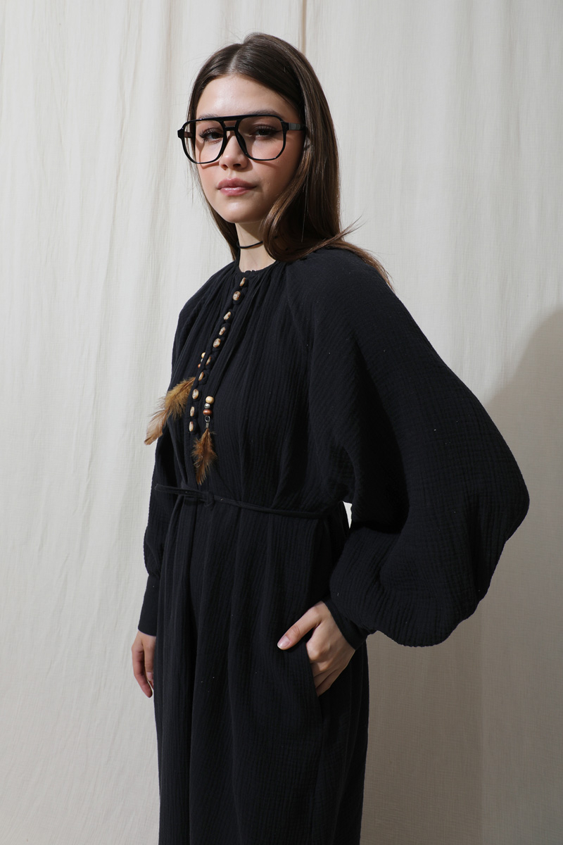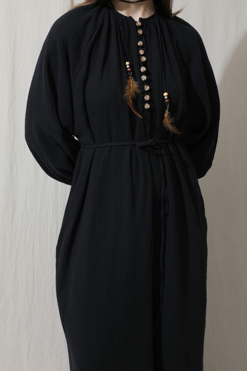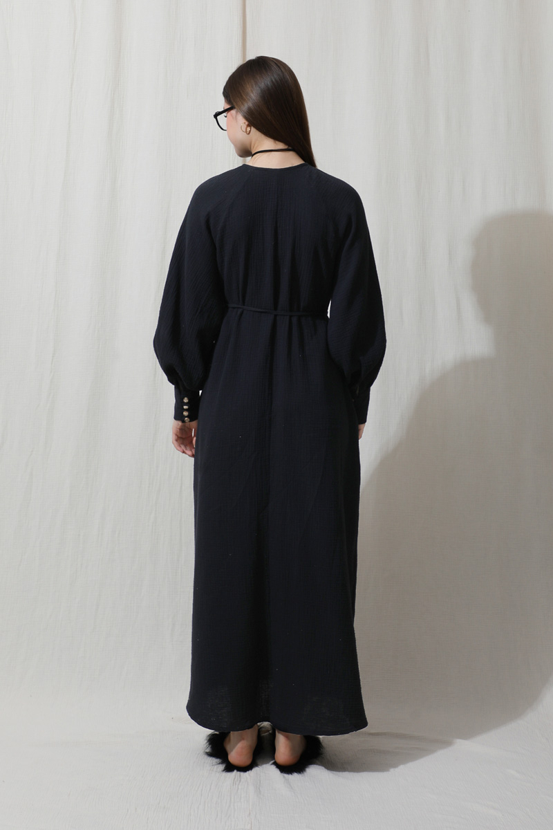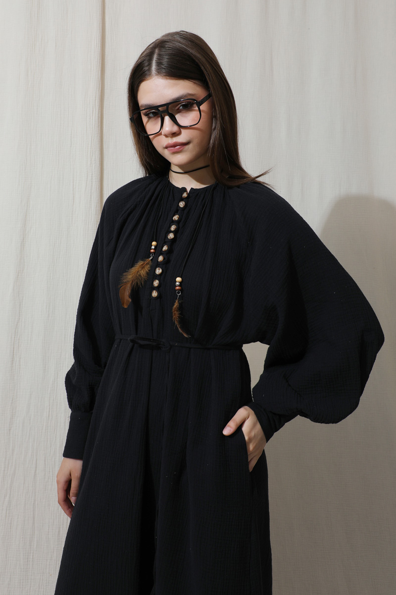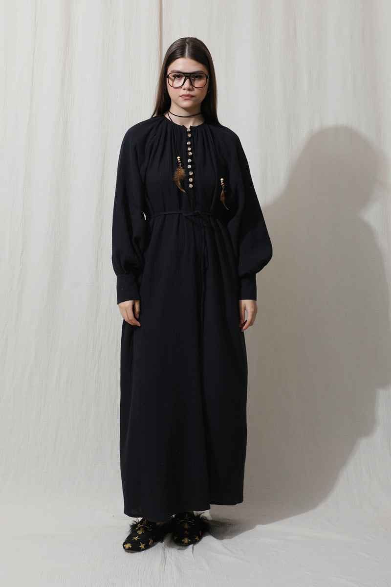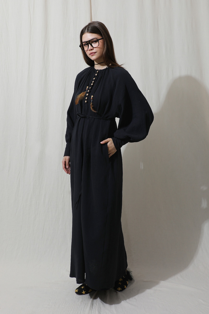 Düğme Yaka Müslin Elbise Lacivert. Bisiklet büzgülü yaka, önden yarım birit düğmeli, yandan gizli cepleri mevcut, ince biye kuşaklı (kuşak için köprü yok), manşetleri kalın ve birit düğmelidir. Astarsızdır müslin kumaş olduğu için iç gösterebilir ürün içine içlik ürünlerimizden tercih edebilirsiniz. Yazlık ve günlük kullanım için uygundur.