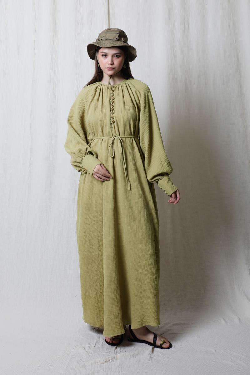 Düğme Yaka Müslin Elbise Yağ Yeşili. Bisiklet büzgülü yaka, önden yarım birit düğmeli, yandan gizli cepleri mevcut, ince biye kuşaklı (kuşak için köprü yok), manşetleri kalın ve birit düğmelidir. Astarsızdır müslin kumaş olduğu için iç gösterebilir ürün içine içlik ürünlerimizden tercih edebilirsiniz. Yazlık ve günlük kullanım için uygundur.