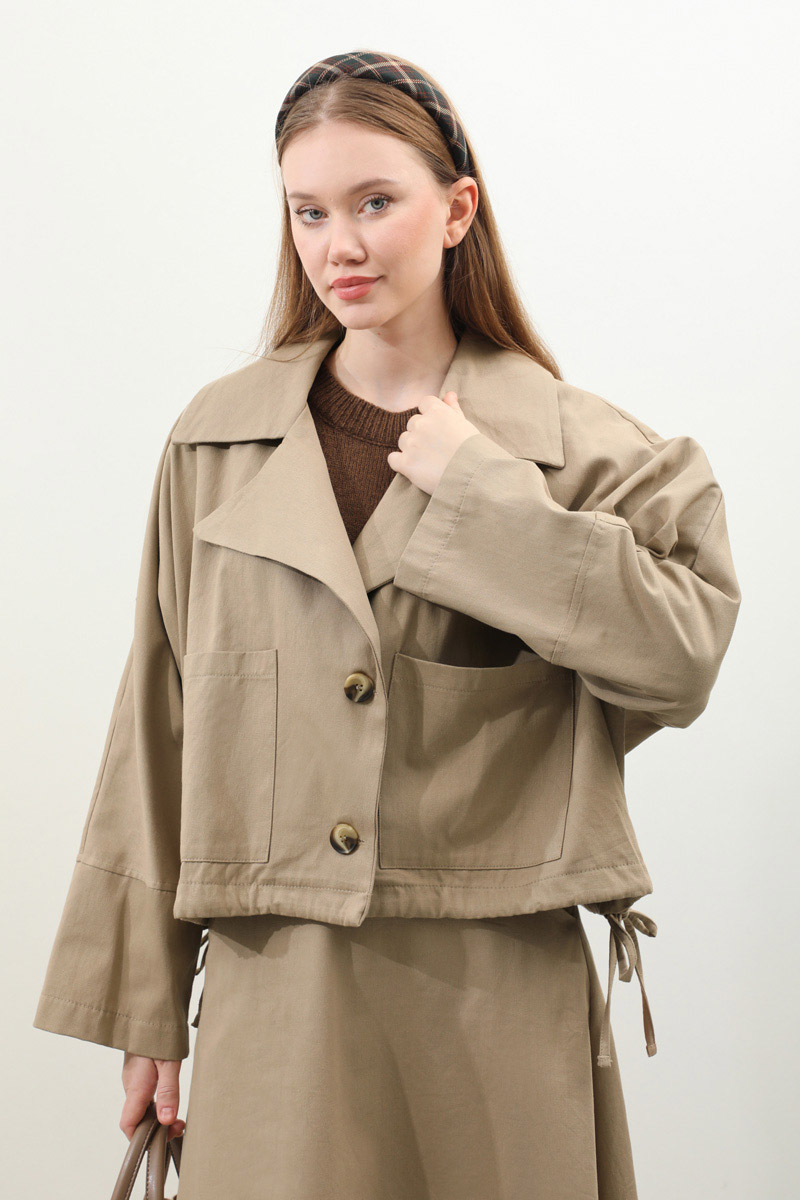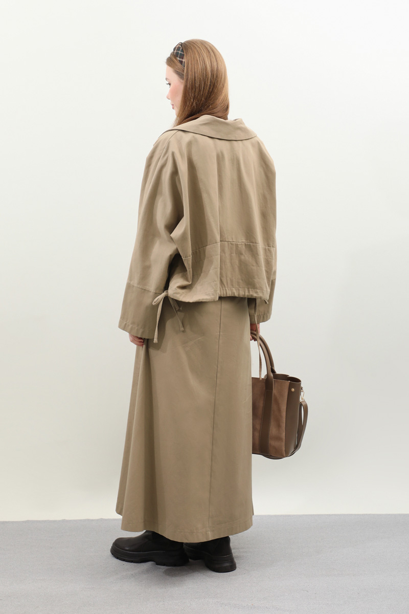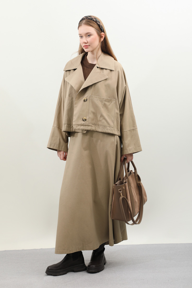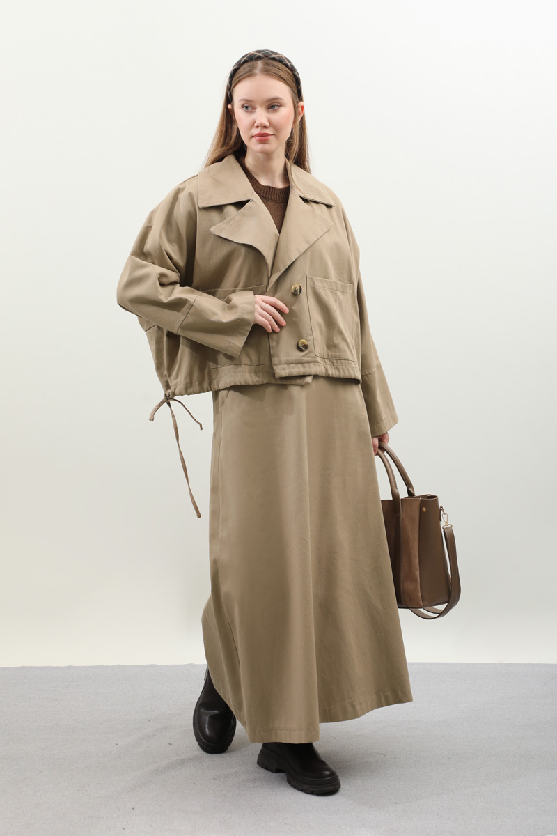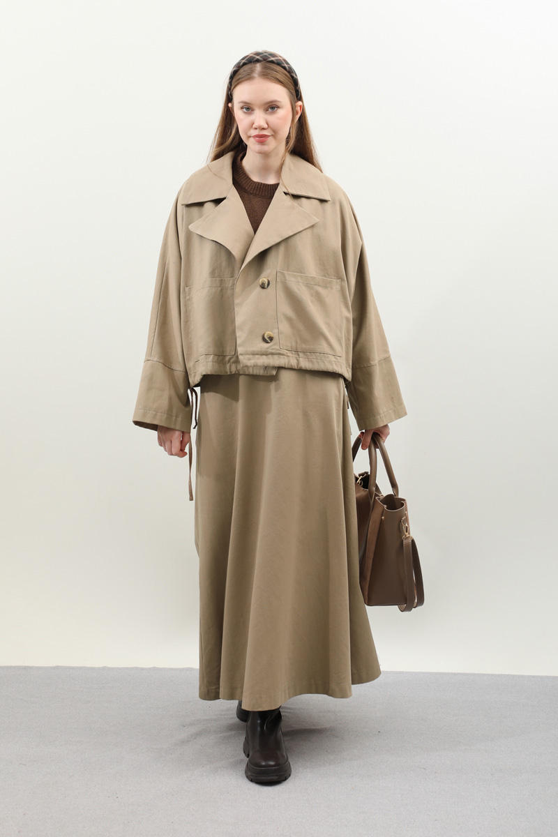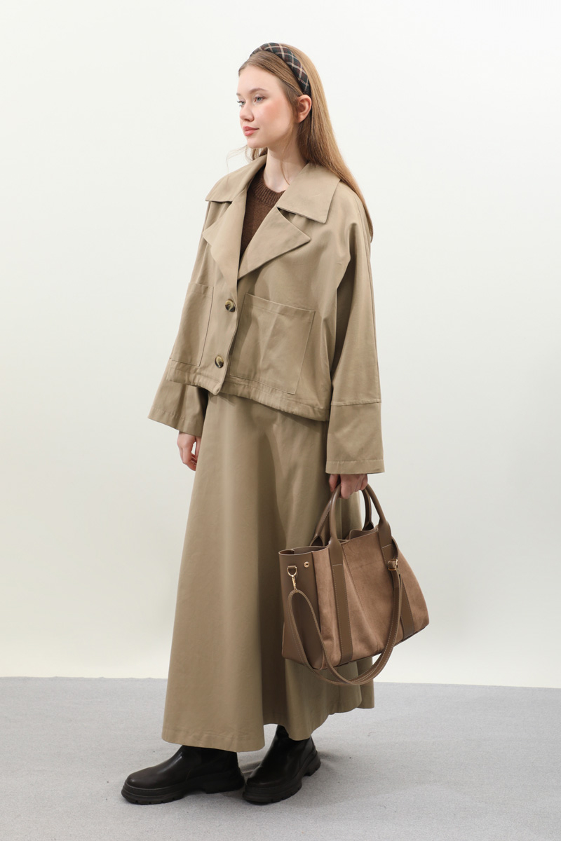 Düğmeli Ceket Etek Takım Camel. Ceket oversize kalıptır, geniş yakalıdır, düşük kolludur, yandan ayarlanabilir bağlamalıdır, önden düğmeli ve cep detaylıdır, arka beden dikiş detaylıdır, Etek aradan lastiklidir, yandan fermuarlıdır, ceplidir, astarsızdır. Günlük kullanım ve özel günlerinizde tercih edebilirsiniz.