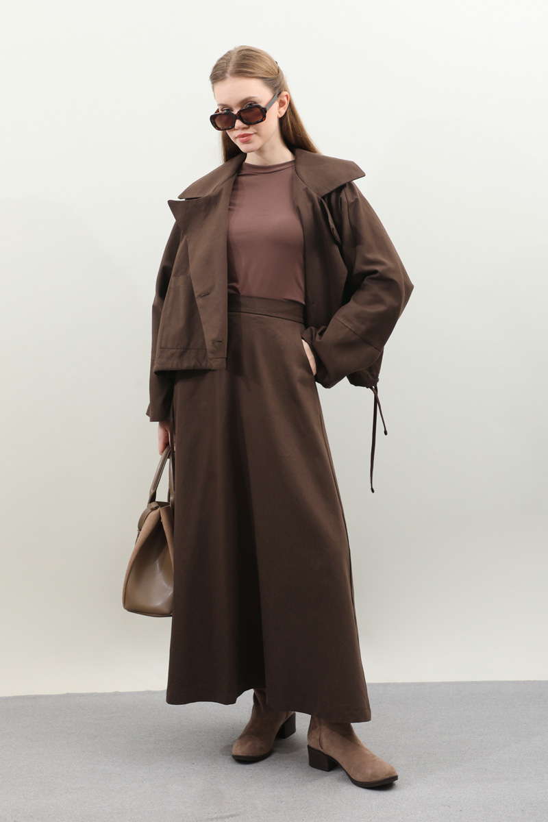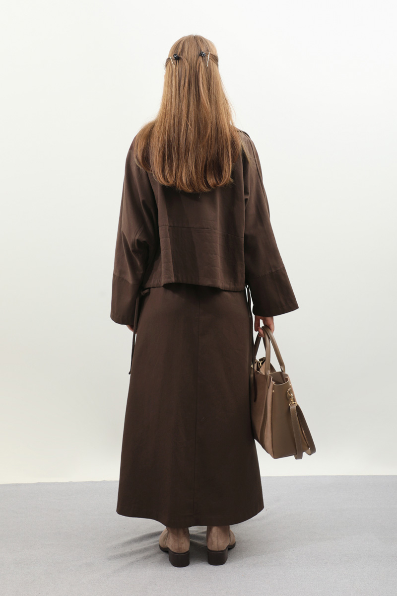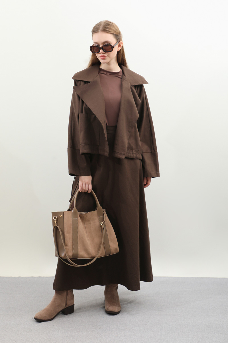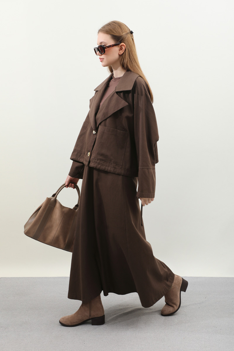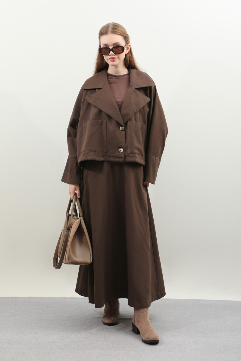Düğmeli Ceket Etek Takım Kahverengi. Ceket oversize kalıptır, geniş yakalıdır, düşük kolludur, yandan ayarlanabilir bağlamalıdır, önden düğmeli ve cep detaylıdır, arka beden dikiş detaylıdır, Etek aradan lastiklidir, yandan fermuarlıdır, ceplidir, astarsızdır. Günlük kullanım ve özel günlerinizde tercih edebilirsiniz.