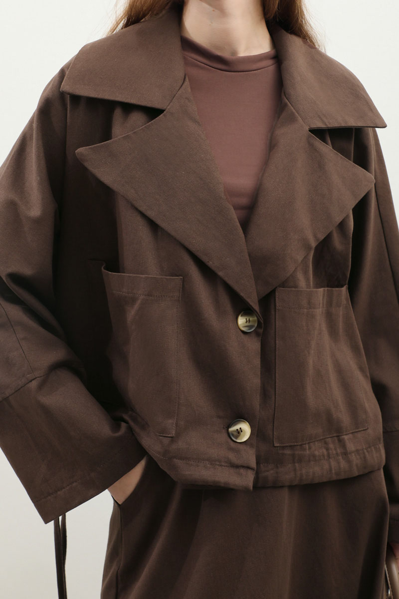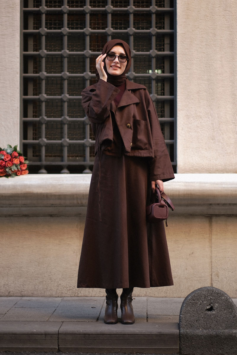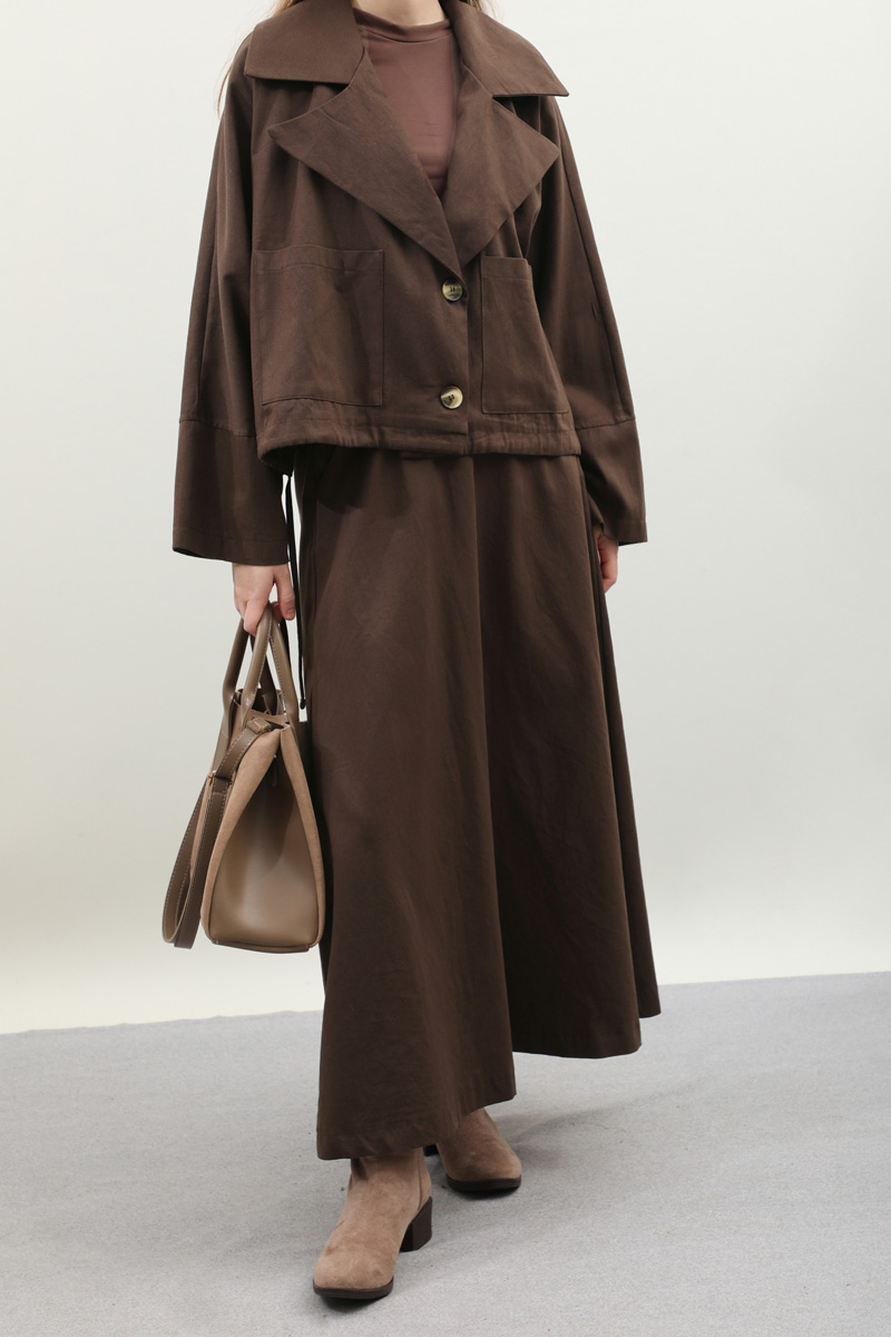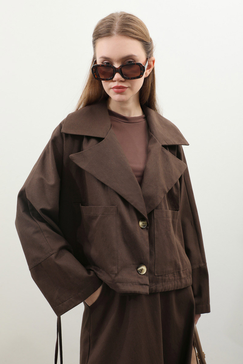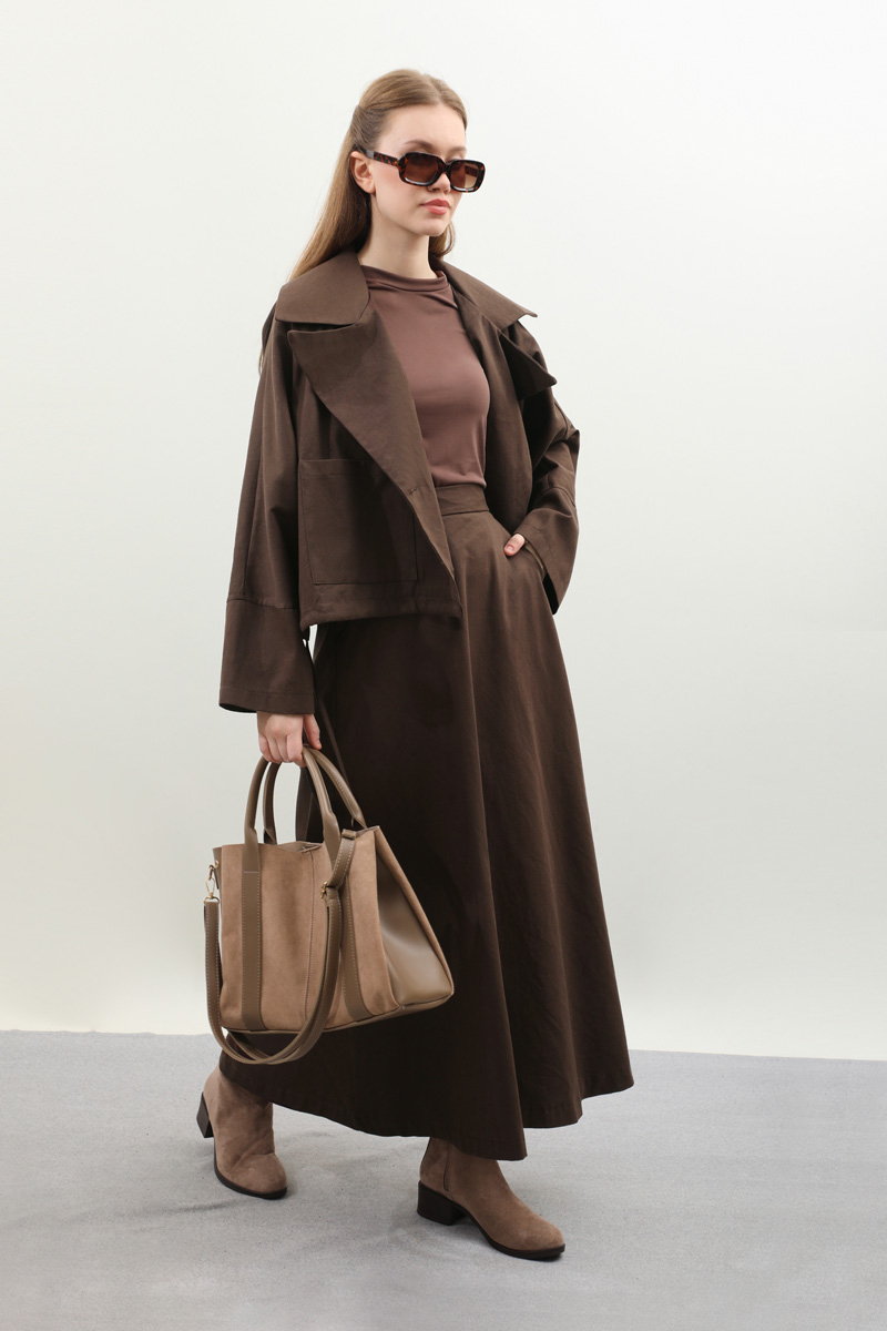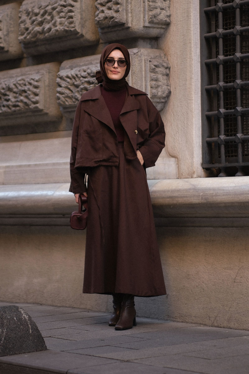 Düğmeli Ceket Etek Takım Kahverengi. Ceket oversize kalıptır, geniş yakalıdır, düşük kolludur, yandan ayarlanabilir bağlamalıdır, önden düğmeli ve cep detaylıdır, arka beden dikiş detaylıdır, Etek aradan lastiklidir, yandan fermuarlıdır, ceplidir, astarsızdır. Günlük kullanım ve özel günlerinizde tercih edebilirsiniz.