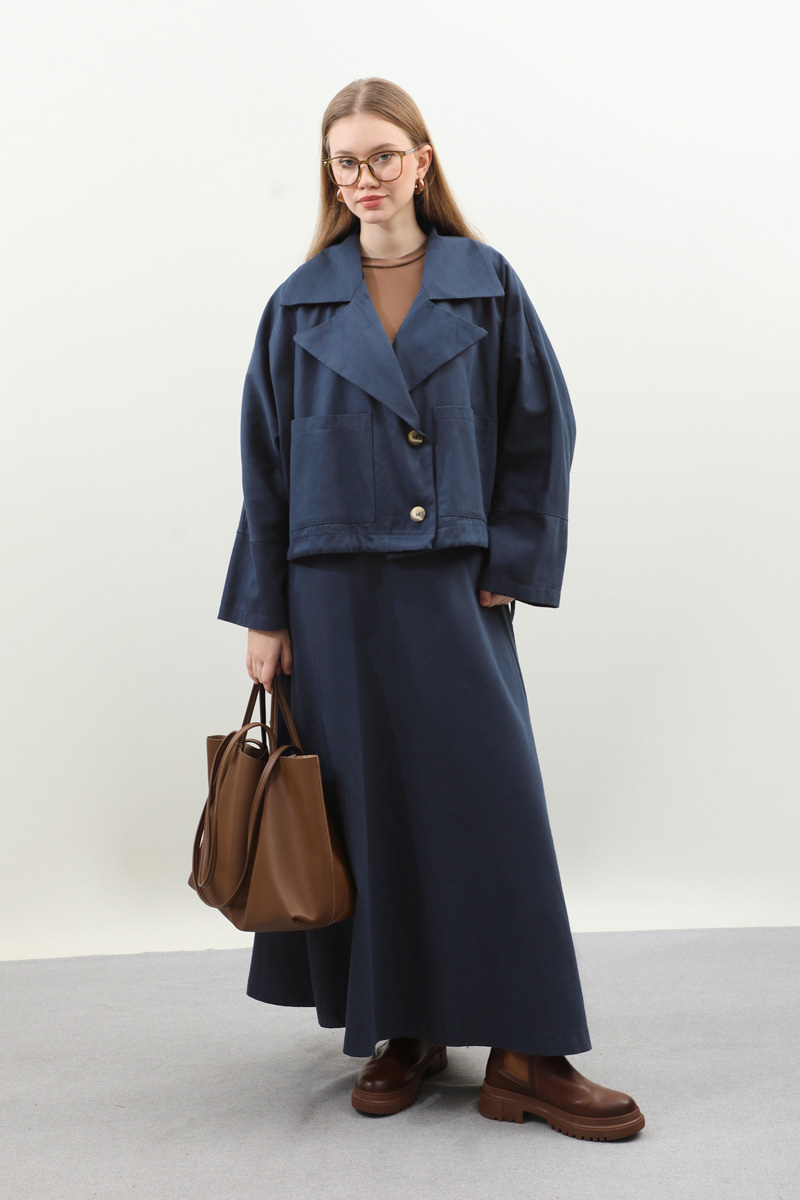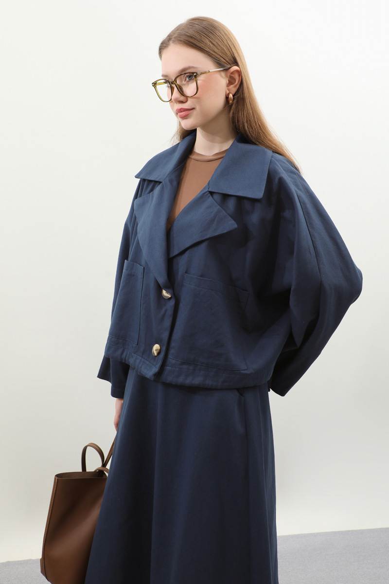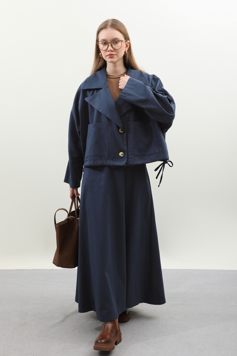 Düğmeli Ceket Etek Takım Lacivert. Ceket oversize kalıptır, geniş yakalıdır, düşük kolludur, yandan ayarlanabilir bağlamalıdır, önden düğmeli ve cep detaylıdır, arka beden dikiş detaylıdır, Etek aradan lastiklidir, yandan fermuarlıdır, ceplidir, astarsızdır. Günlük kullanım ve özel günlerinizde tercih edebilirsiniz.