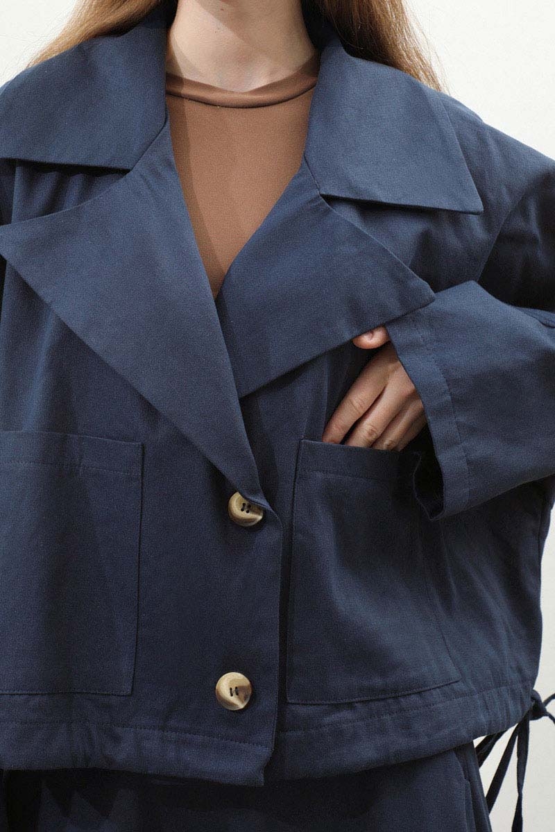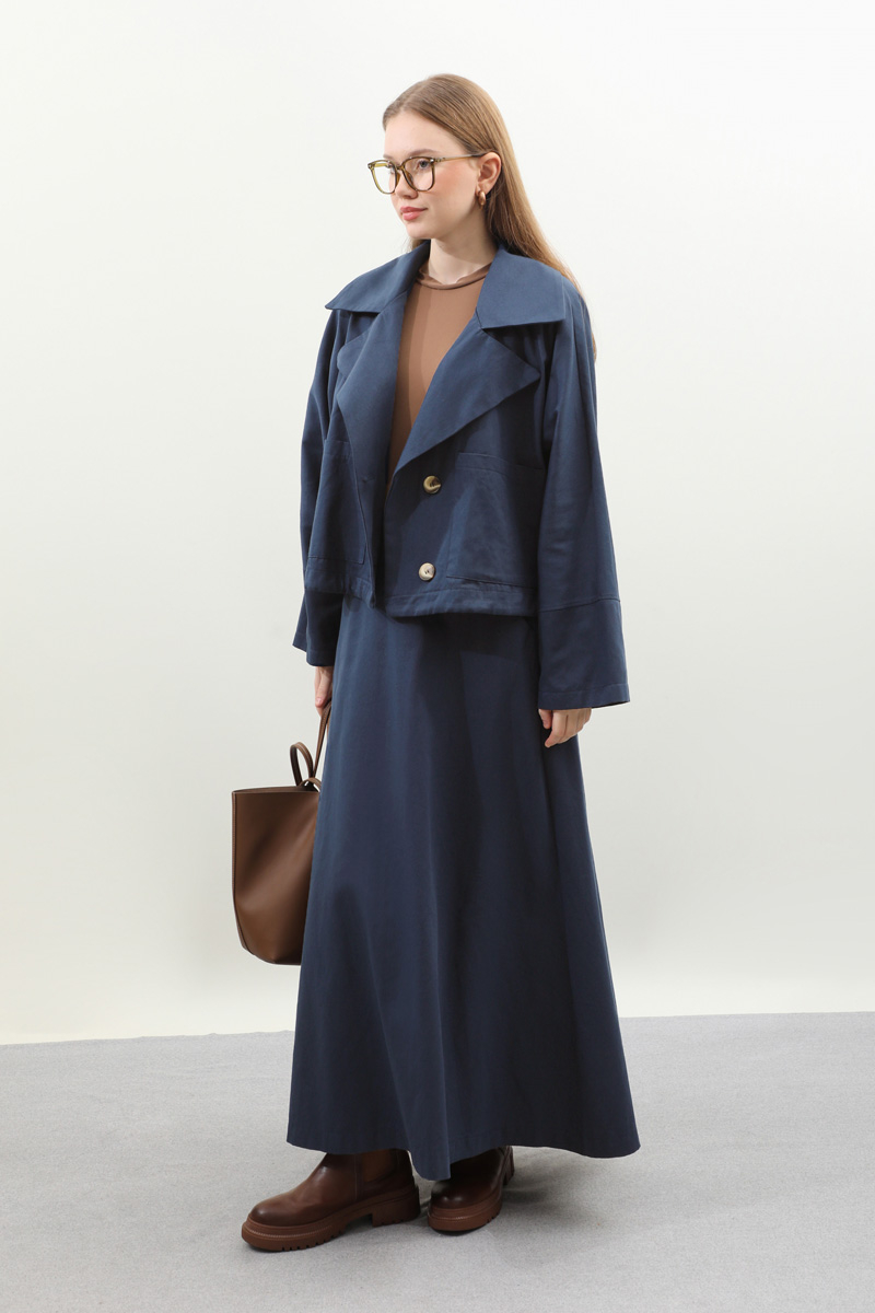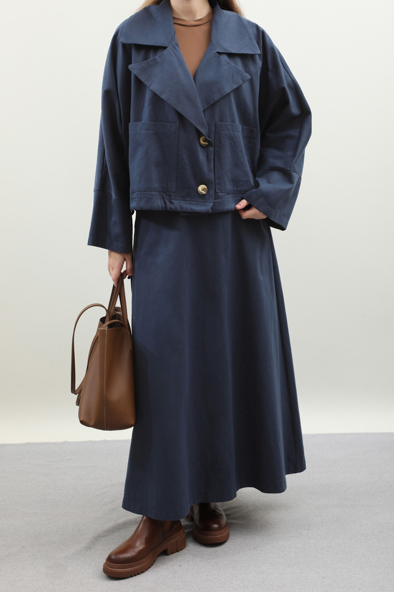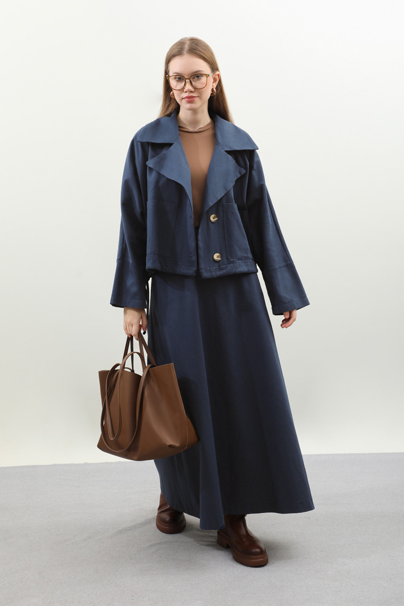 Düğmeli Ceket Etek Takım Lacivert. Ceket oversize kalıptır, geniş yakalıdır, düşük kolludur, yandan ayarlanabilir bağlamalıdır, önden düğmeli ve cep detaylıdır, arka beden dikiş detaylıdır, Etek aradan lastiklidir, yandan fermuarlıdır, ceplidir, astarsızdır. Günlük kullanım ve özel günlerinizde tercih edebilirsiniz.
