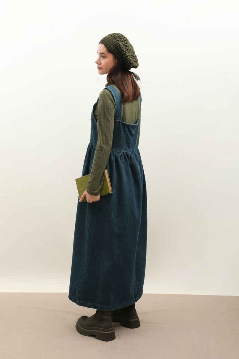 Düğmeli Denim Jile Koyu Mavi. Kalın askılıdır, kare yakadır, önden çin düğmelidir, belden büzgülüdür, sırtı kup detaylıdır arka etek iki parçadır, yandan ceplidir, astarsızdır. Günlük kullanım ve özel günlerinizde tercih edebilirsiniz.