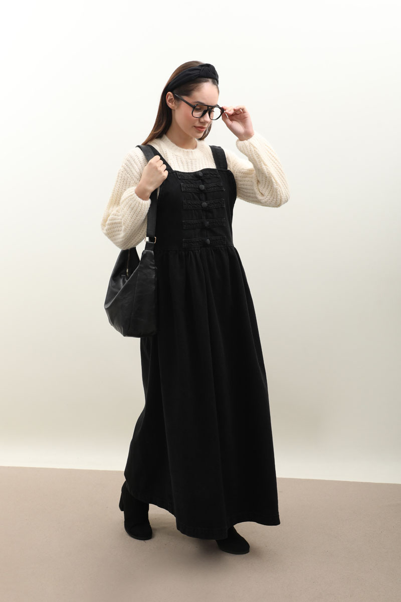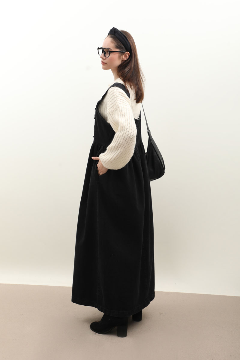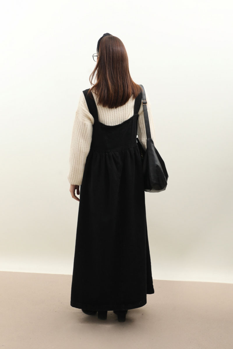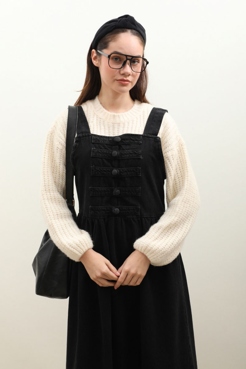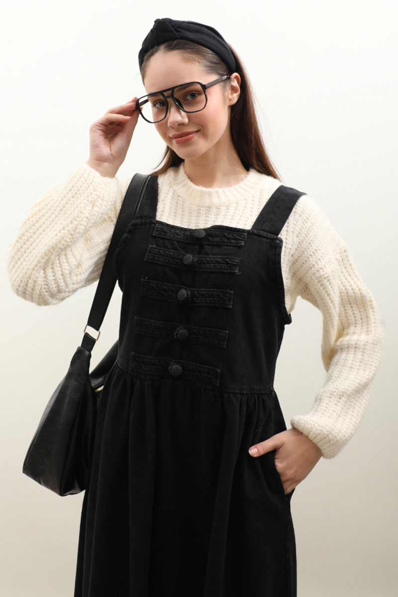 Düğmeli Denim Jile Siyah. Kalın askılıdır, kare yakadır, önden çin düğmelidir, belden büzgülüdür, sırtı kup detaylıdır arka etek iki parçadır, yandan ceplidir, astarsızdır. Günlük kullanım ve özel günlerinizde tercih edebilirsiniz.