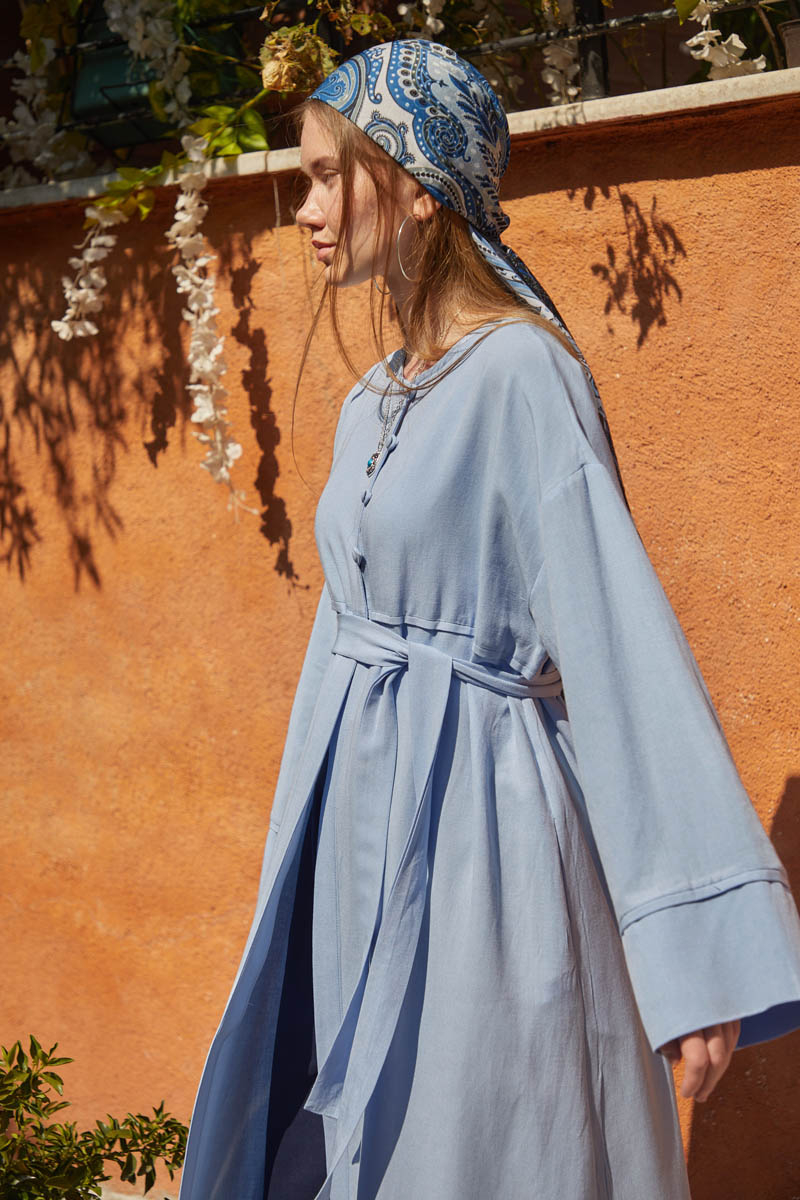 Düğmeli Keten Abaya Bebe Mavisi, modern tasarımı ile geleneksel çizgiyi birleştiren, fonksiyonel ve estetik bir üst giyim ürünüdür. Minimalist ve zamansız tasarımı sayesinde, farklı aksesuar ve giysilerle kolayca kombinlenebilir. Konfor ve gün boyu nefes alabilirlik sunmaktadır.