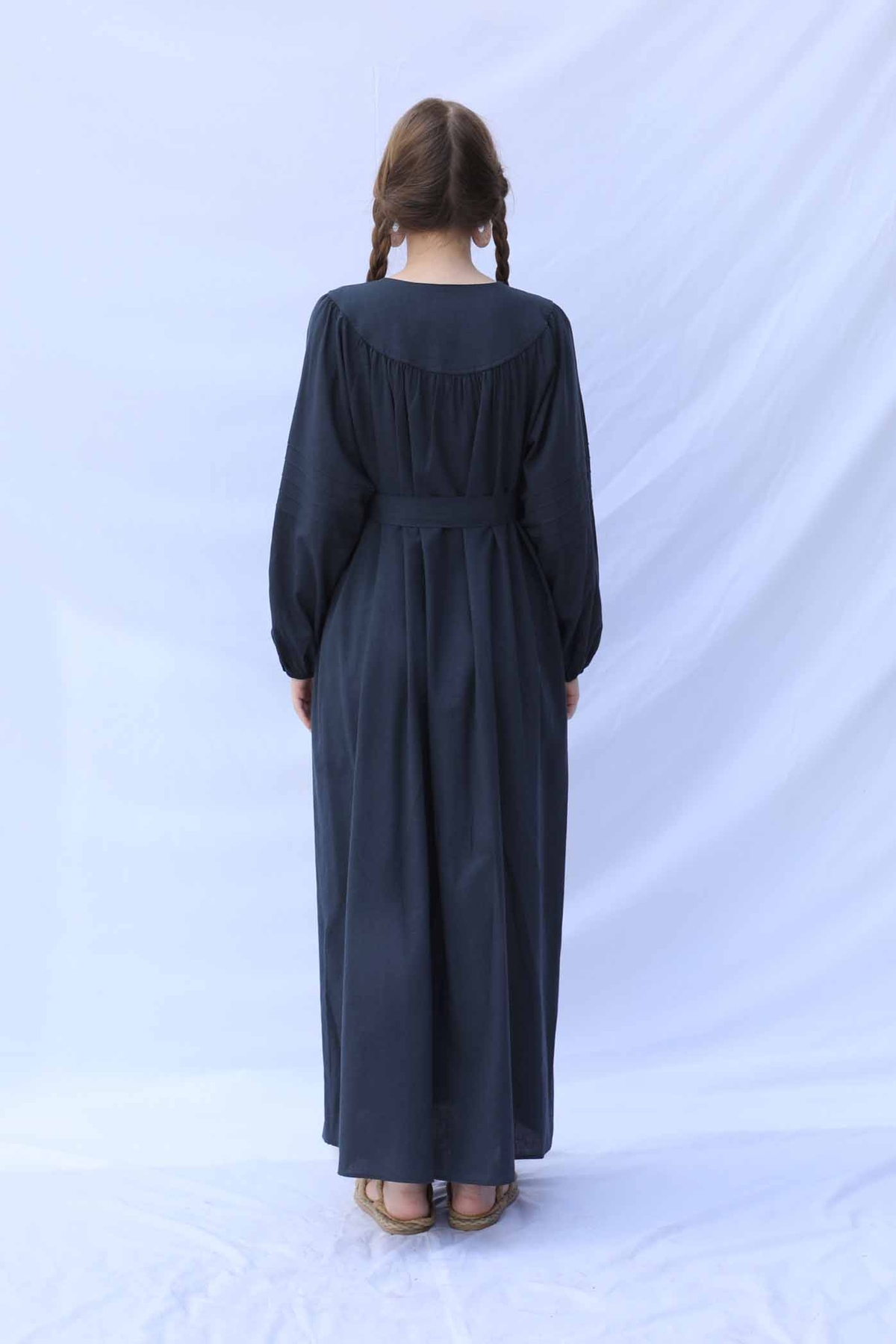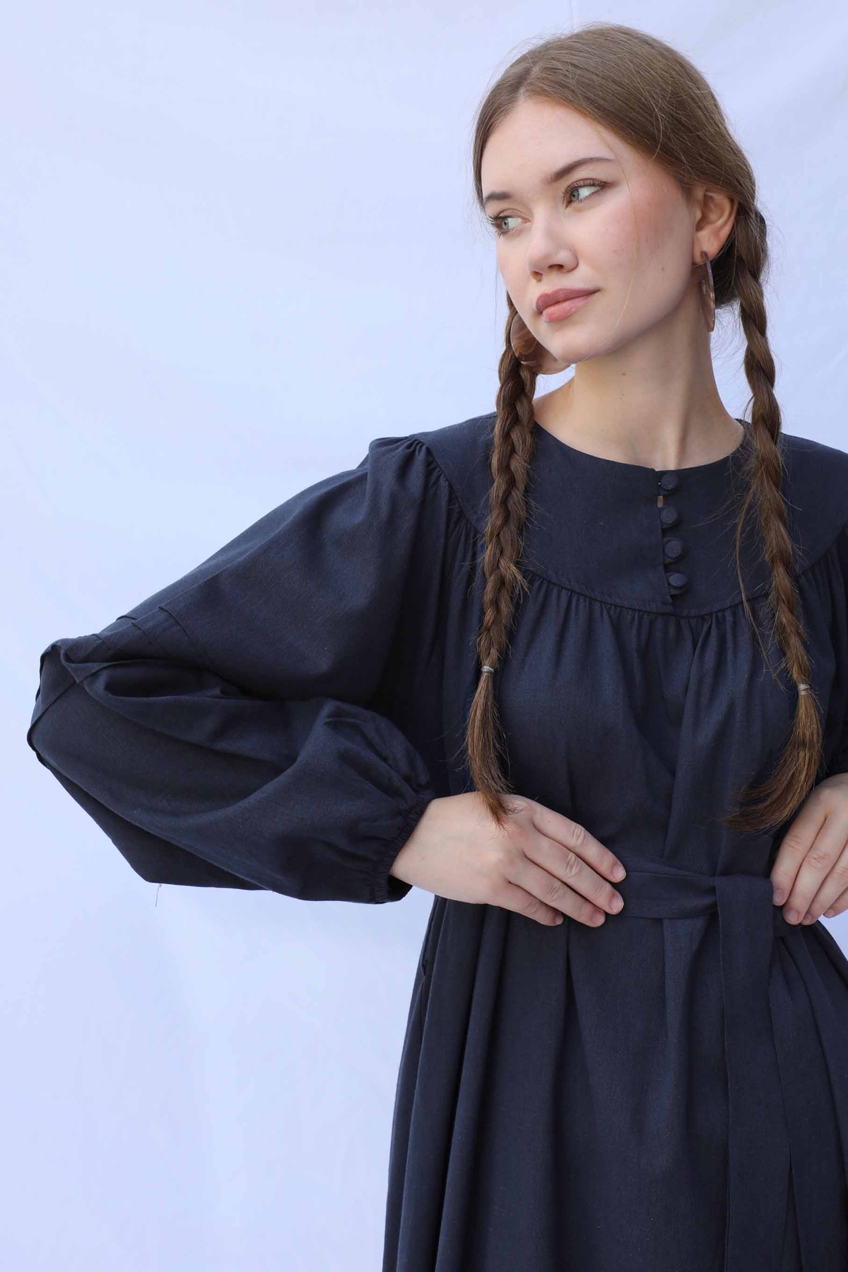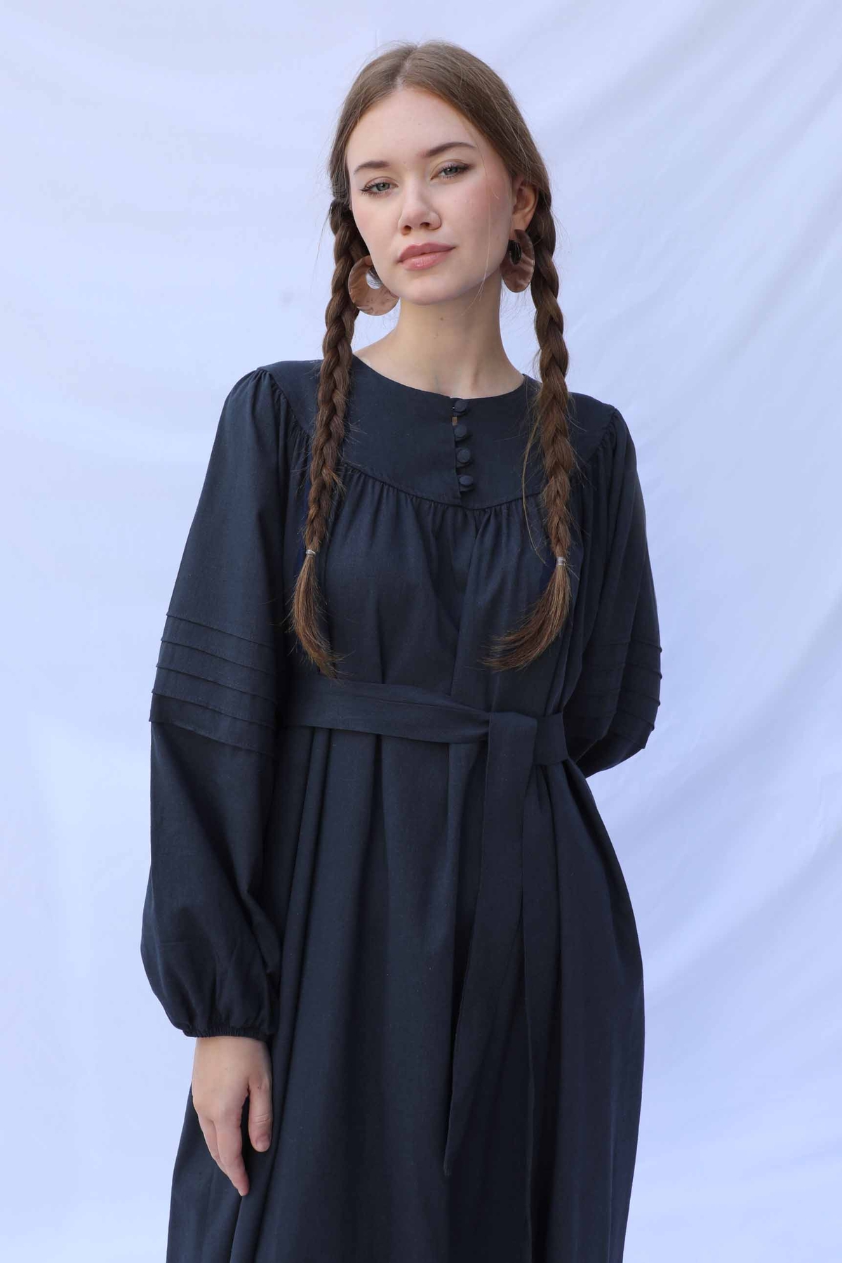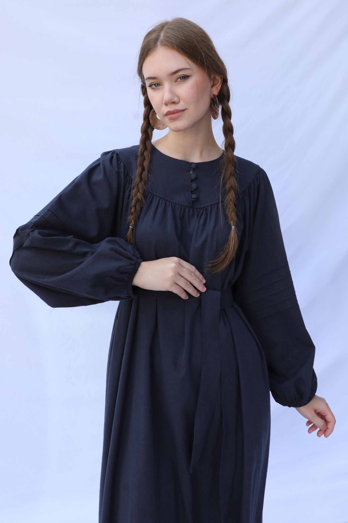 Düğmeli Keten Elbise Lacivert. Yakası robalıdır. Robası birit düğmelidir. Robası büzgülüdür. Balon koldur. Kol kısmında nervür dikişi detayları mevcuttur. Manşeti lastiklidir. Kuşaklıdır.