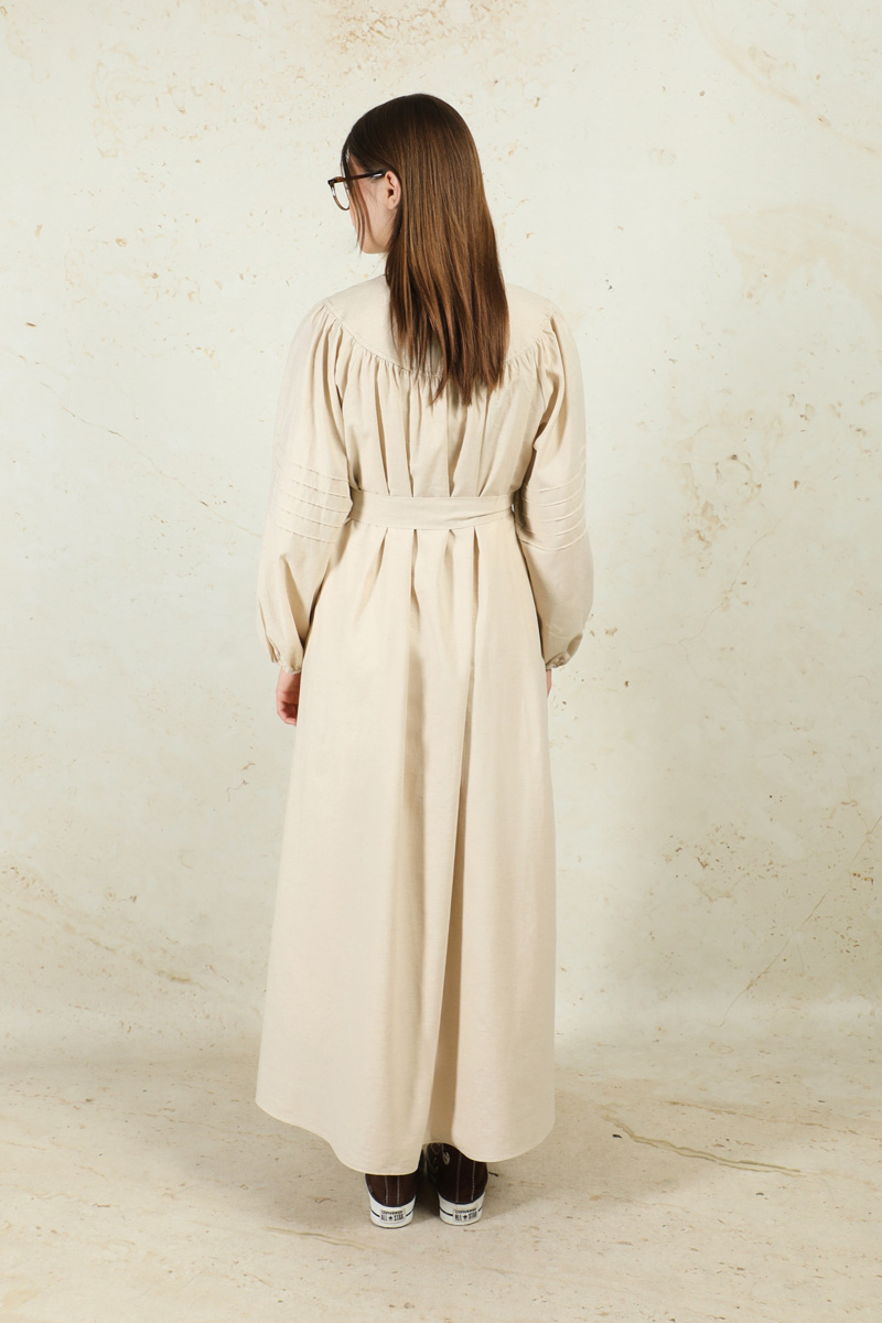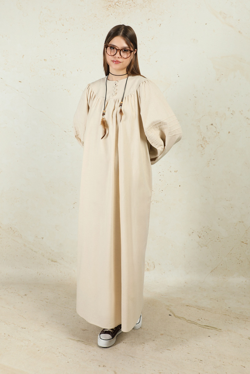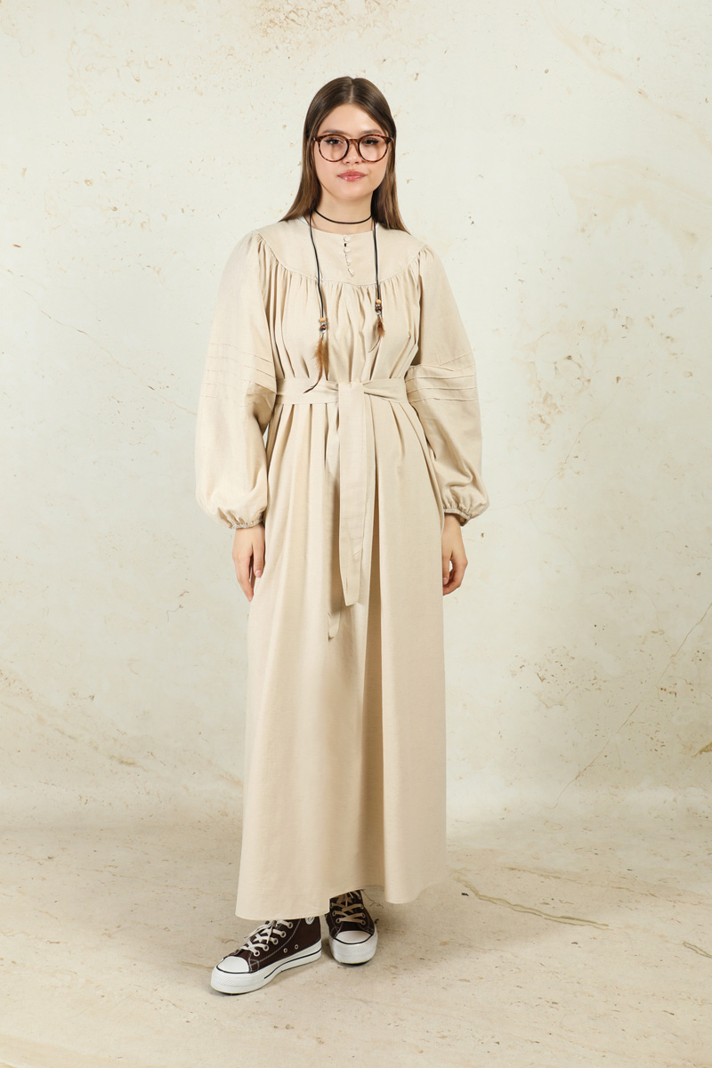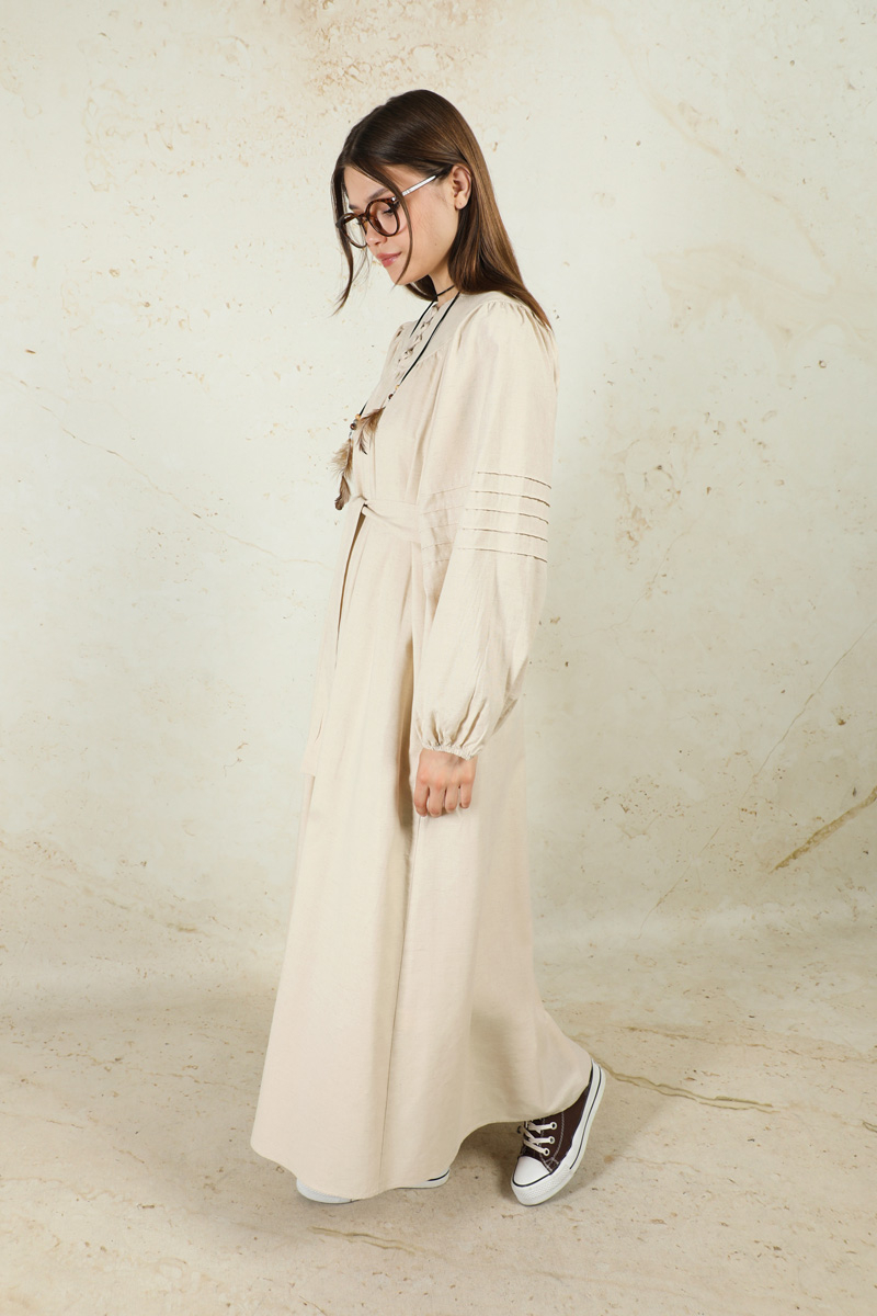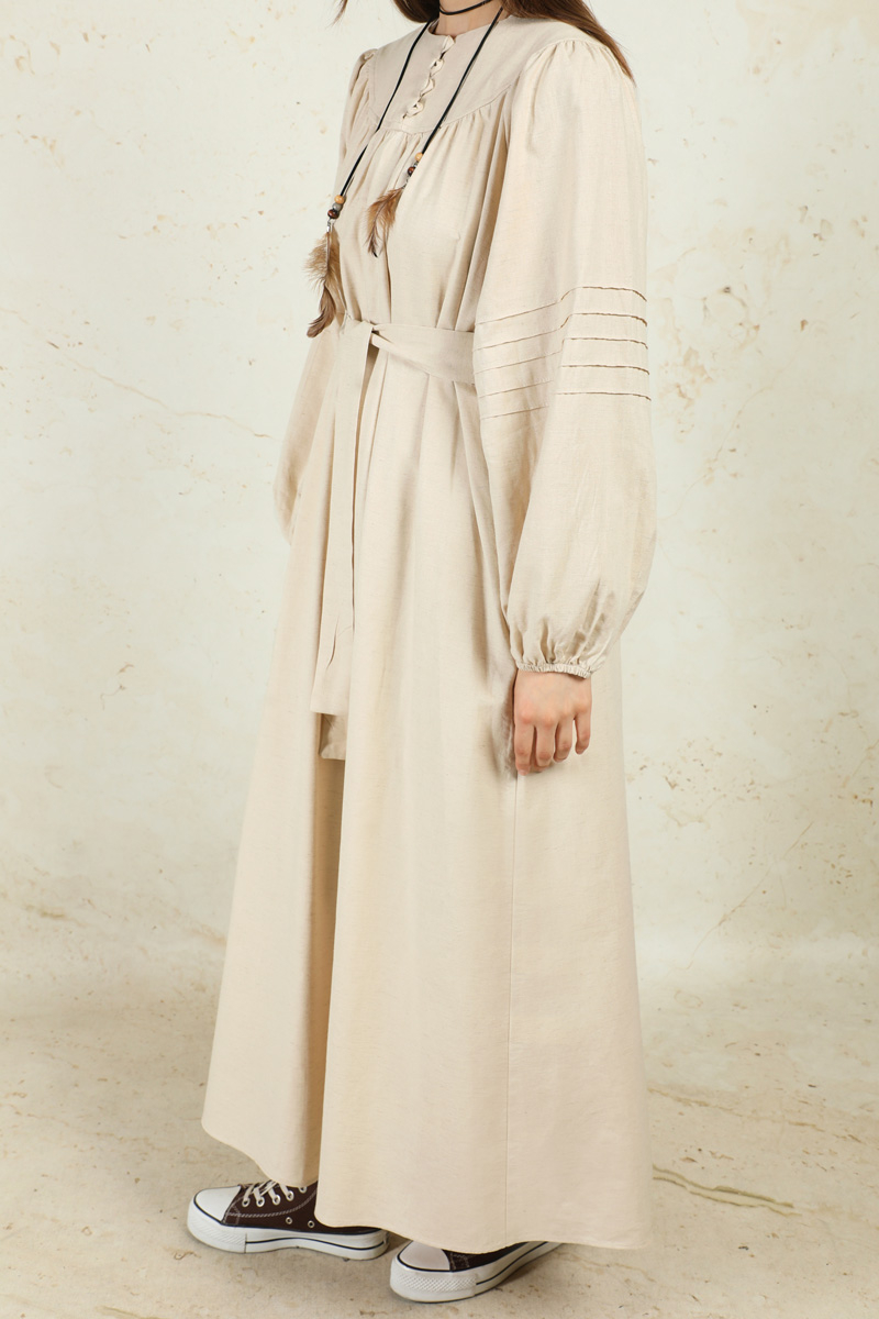 Düğmeli Keten Elbise Taş. Yakası robalıdır. Robası birit düğmelidir. Robası büzgülüdür. Balon koldur. Kol kısmında nervür dikişi detayları mevcuttur. Manşeti lastiklidir. Kuşaklıdır.