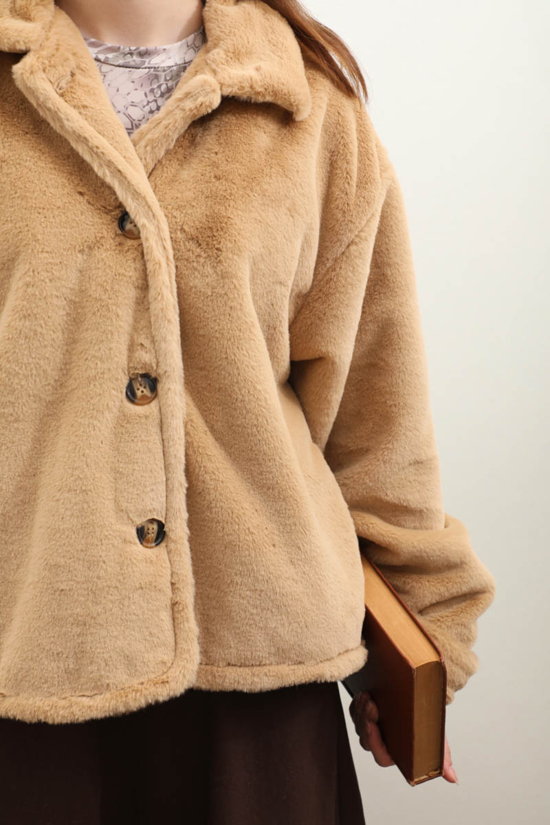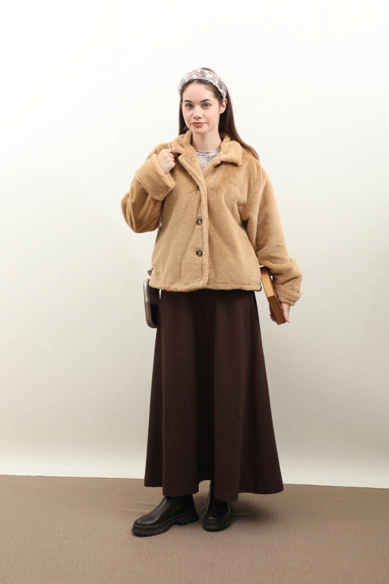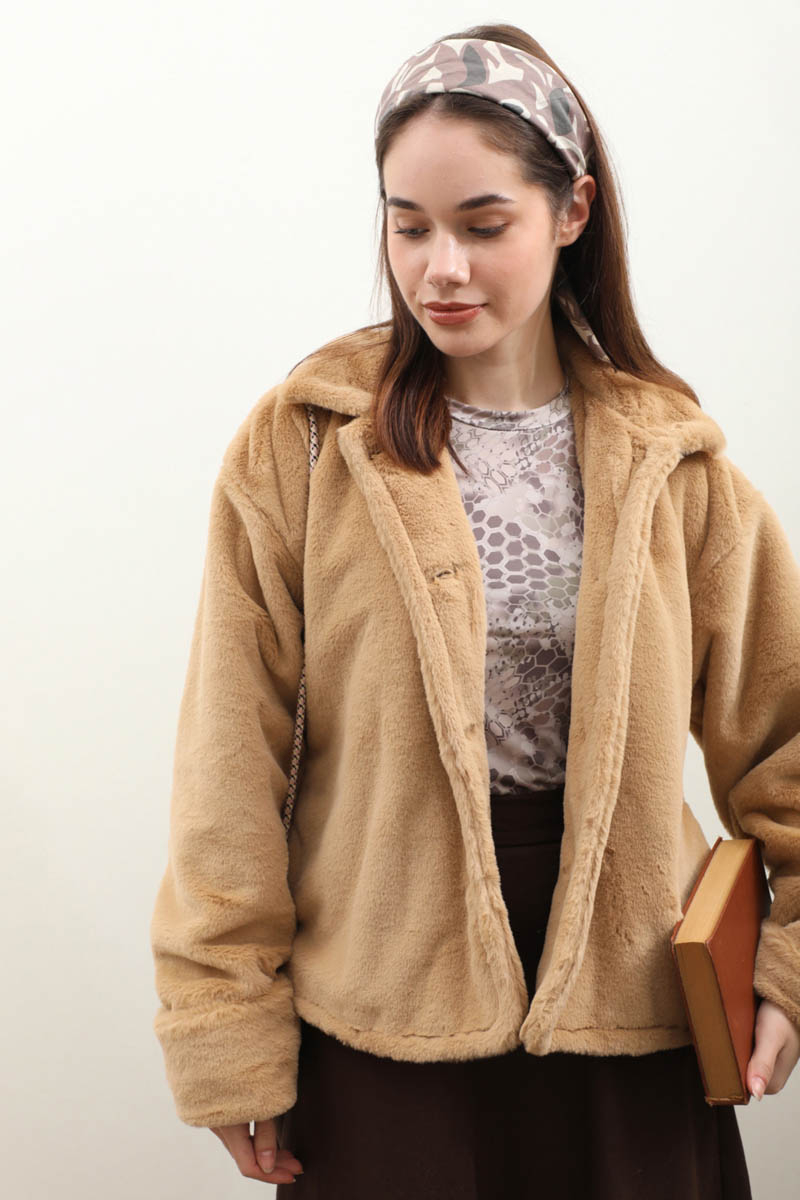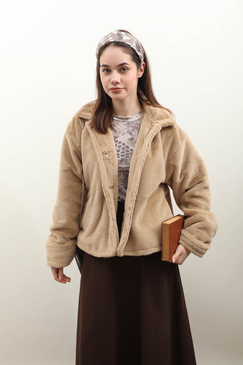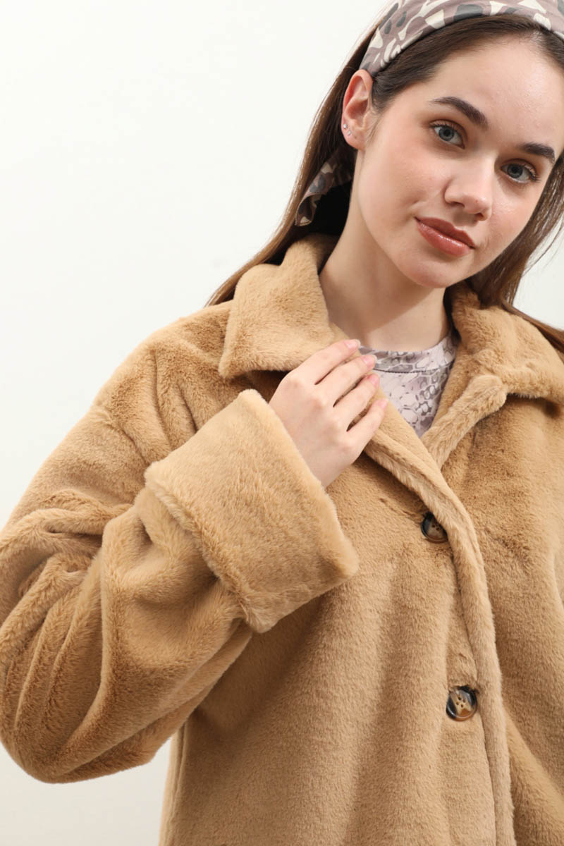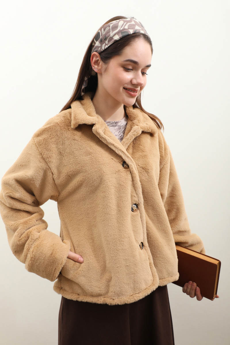 Düğmeli Kısa Kürk Camel. Gömlek yakadır, düşük omuzludur, double kolludur, önden düğmelidir, yandan ceplidir, astarlıdır. Günlük kullanım ve özel günlerinizde tercih edebilirsiniz.
