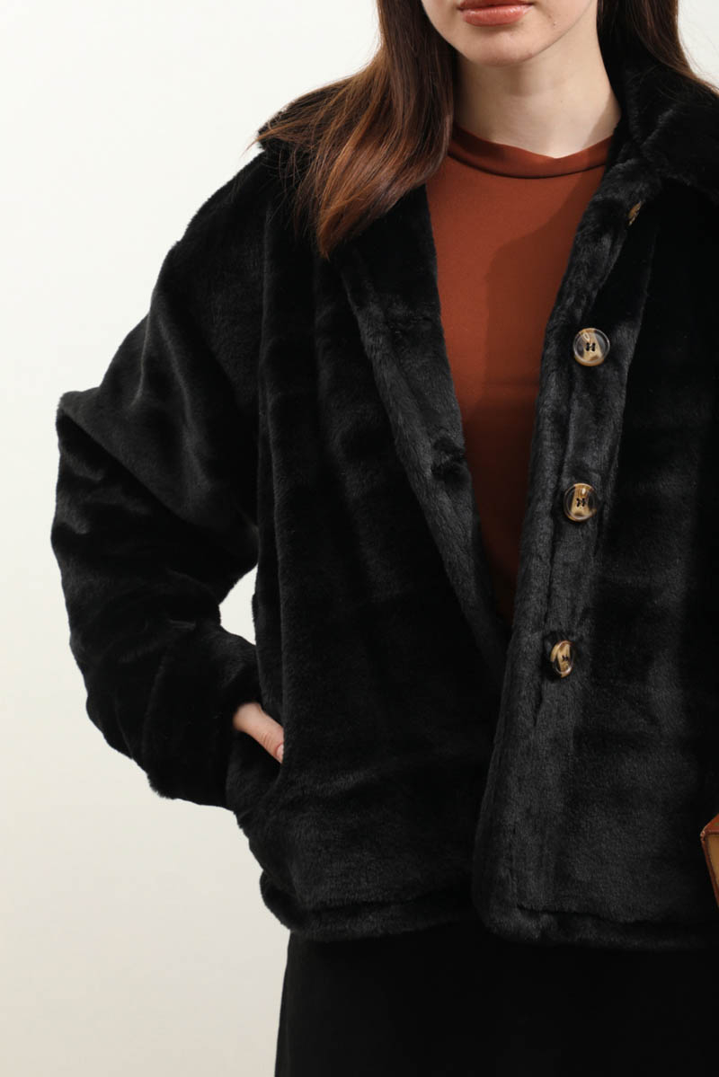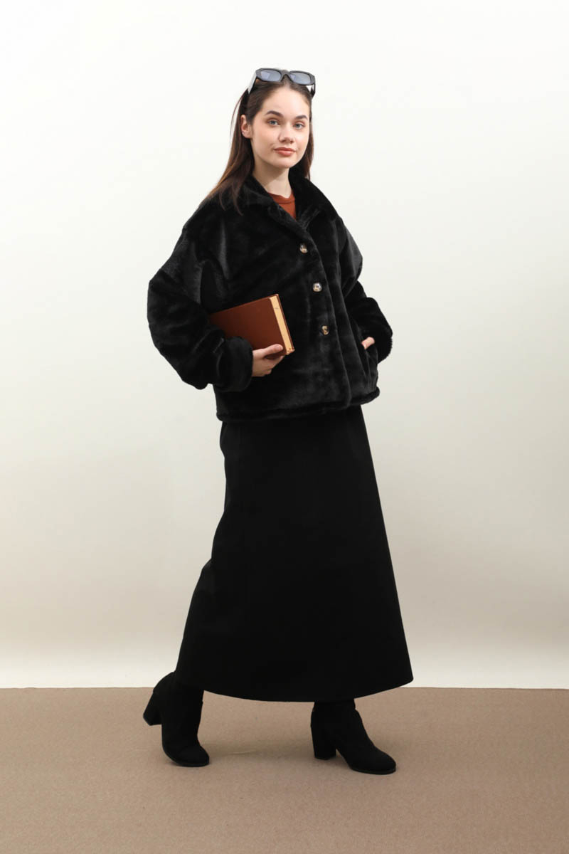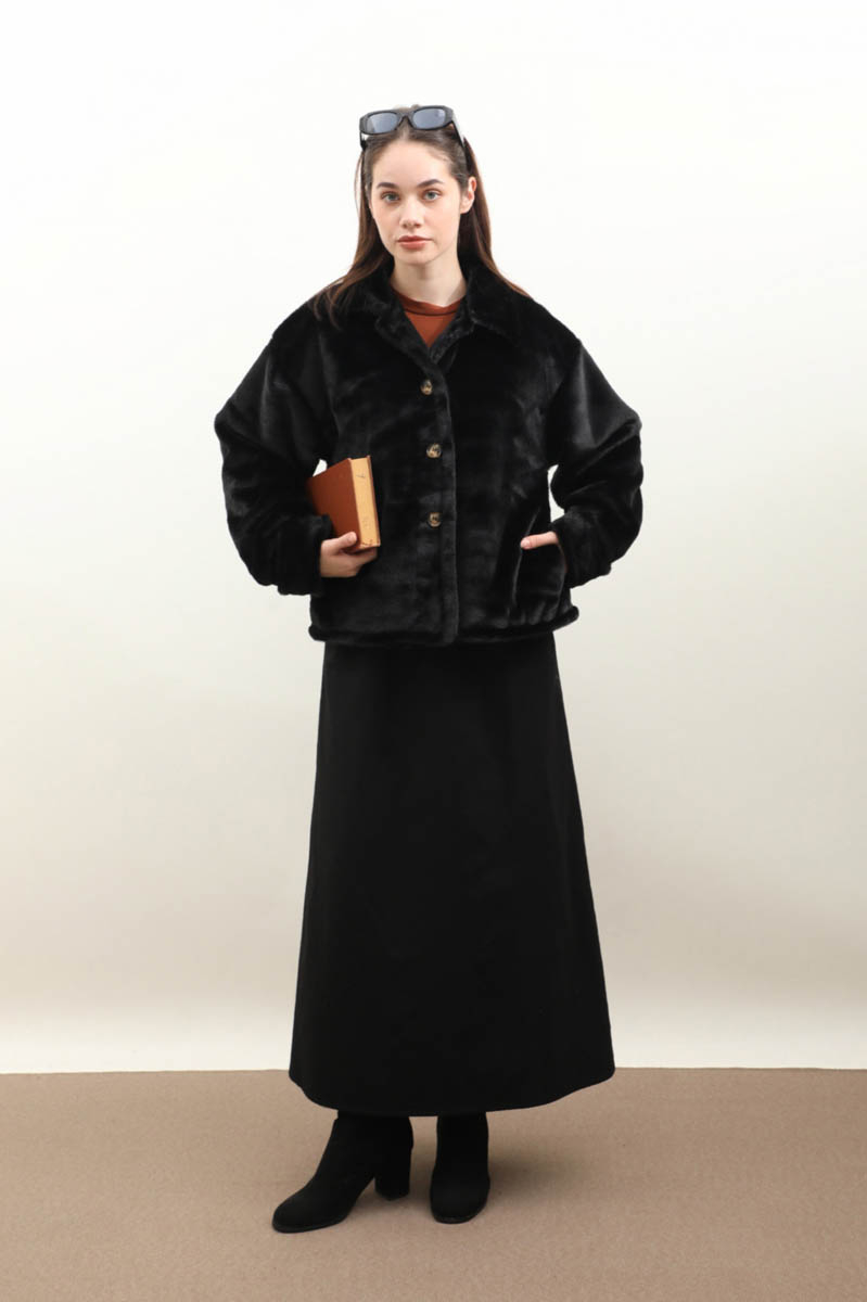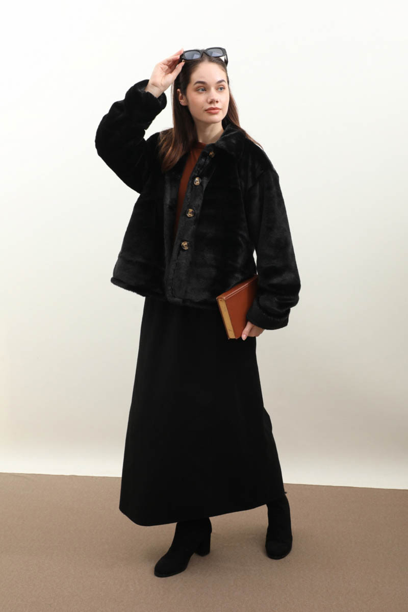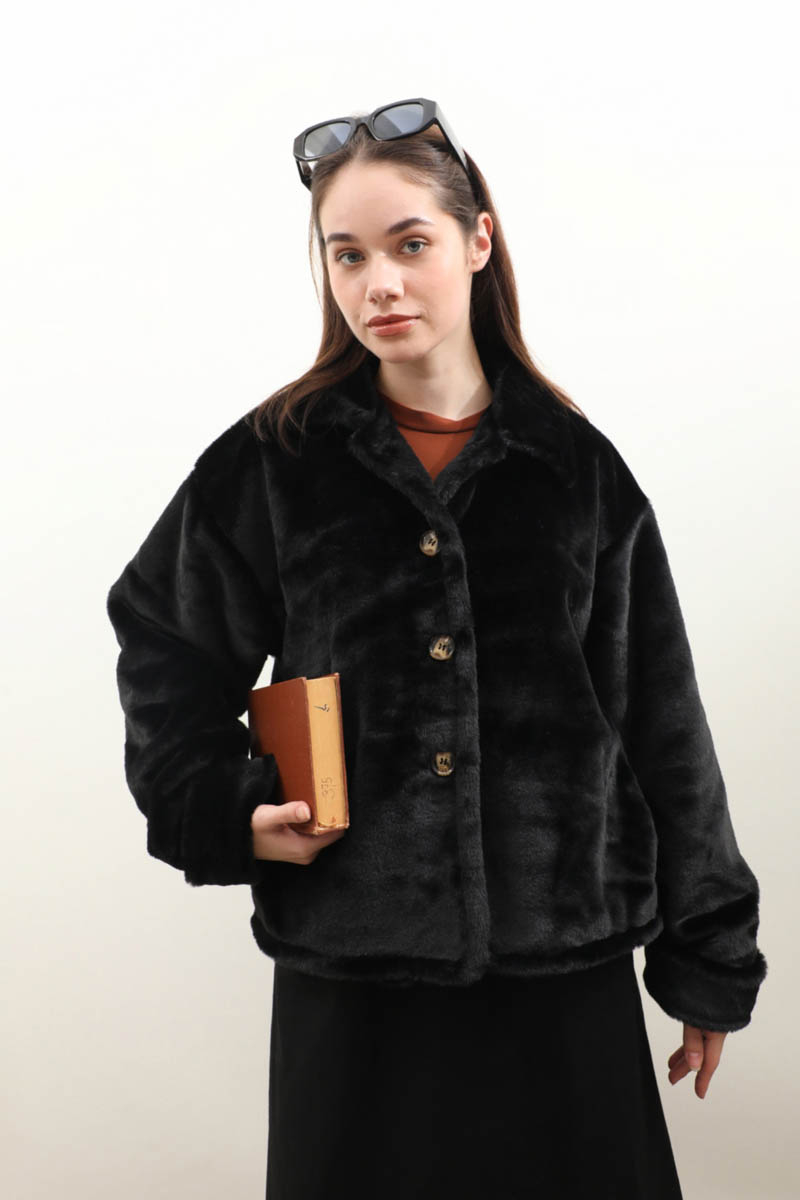 Düğmeli Kısa Kürk Siyah. Gömlek yakadır, düşük omuzludur, double kolludur, önden düğmelidir, yandan ceplidir, astarlıdır. Günlük kullanım ve özel günlerinizde tercih edebilirsiniz.