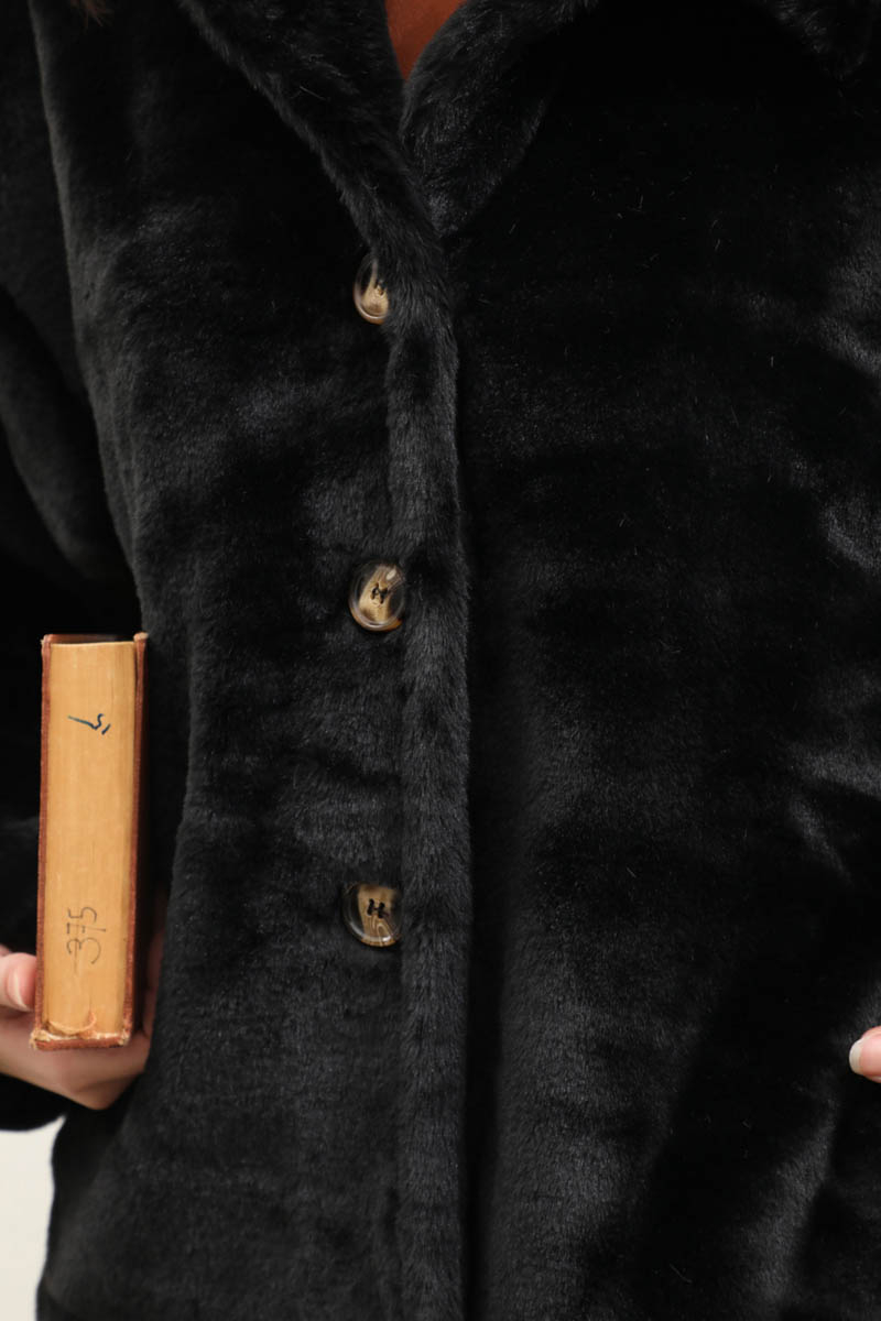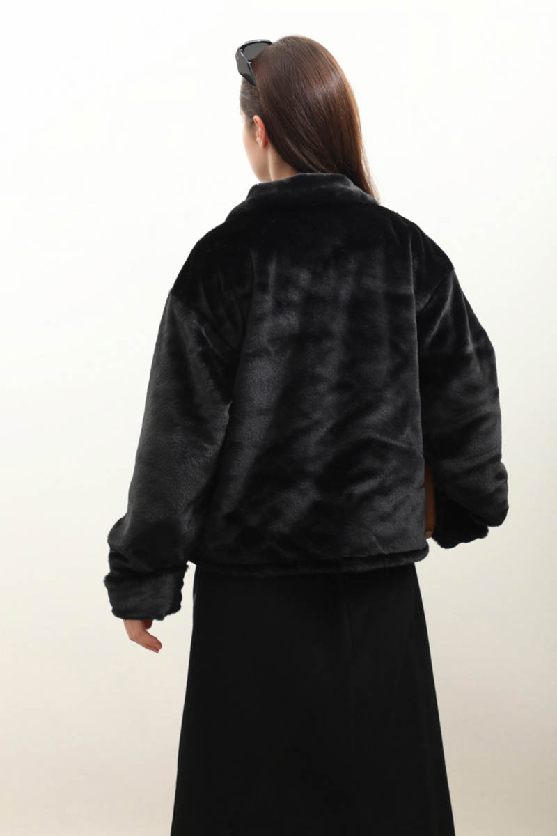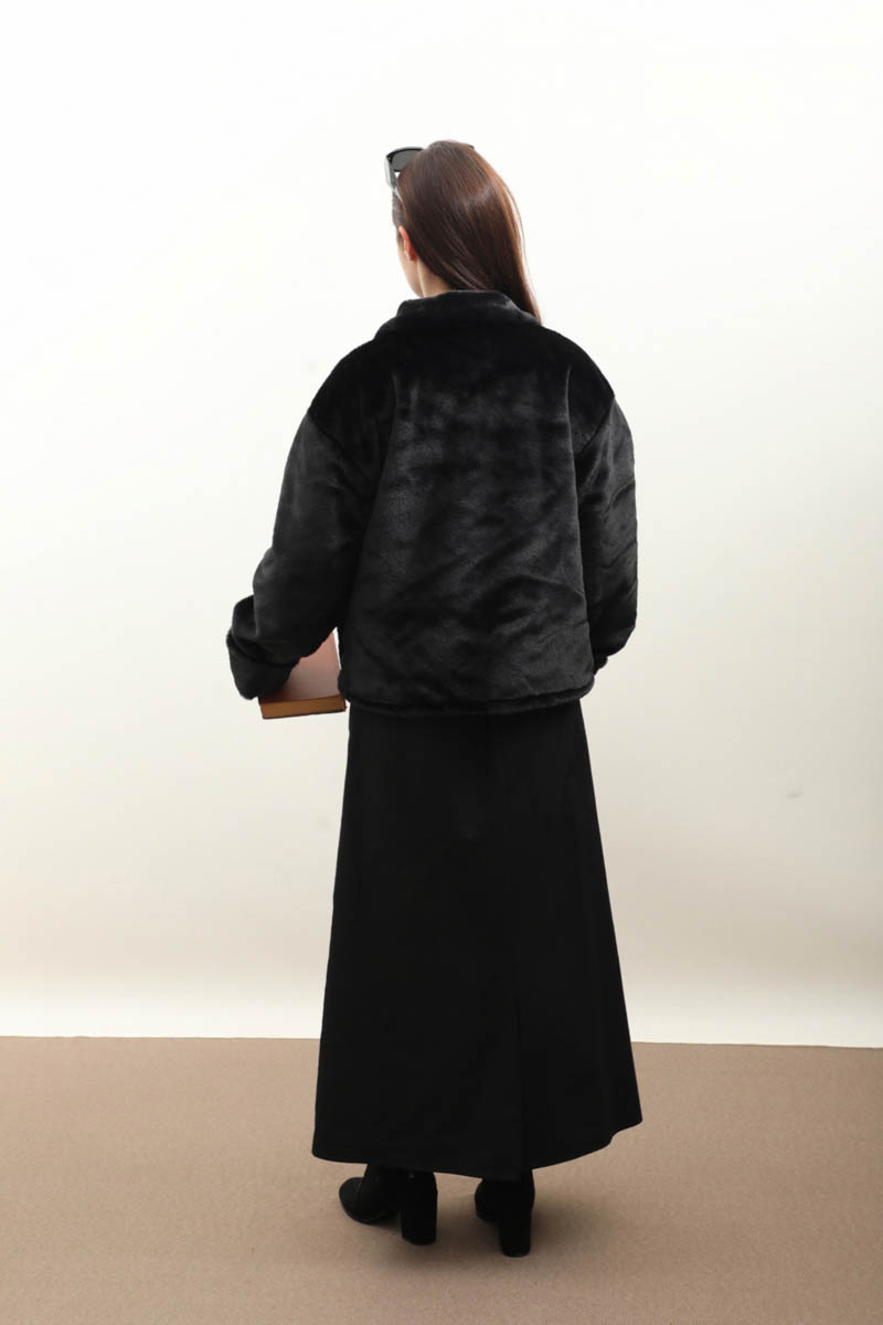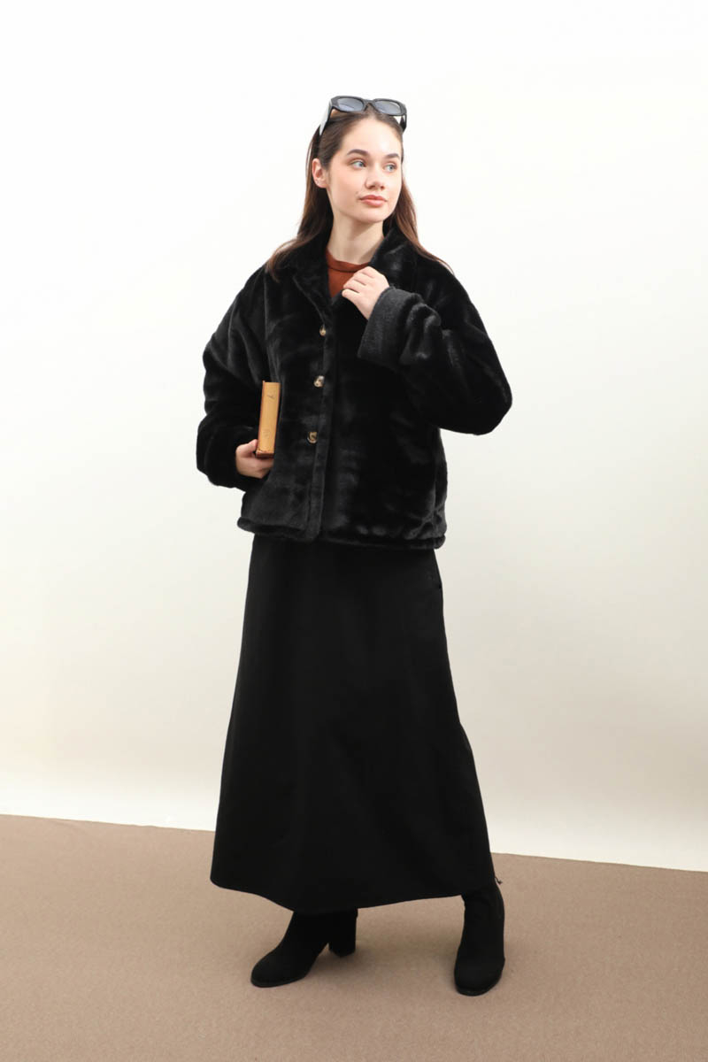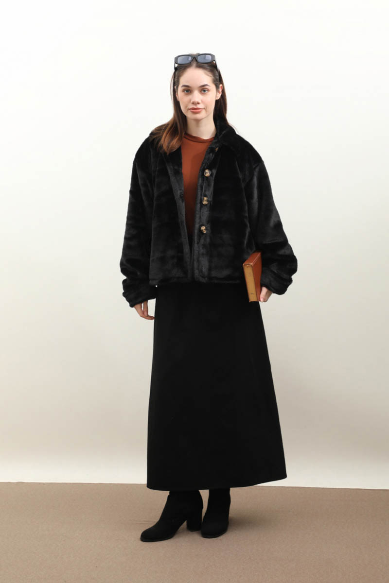 Düğmeli Kısa Kürk Siyah. Gömlek yakadır, düşük omuzludur, double kolludur, önden düğmelidir, yandan ceplidir, astarlıdır. Günlük kullanım ve özel günlerinizde tercih edebilirsiniz.