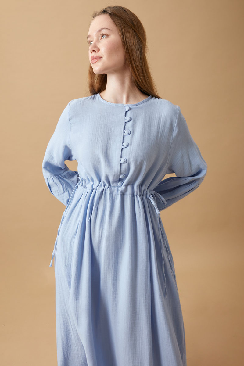 Düğmeli Müslin Elbise Bebe Mavisi, hafif yapısıyla gün boyu konfor sunuyor. %100 pamuk müslin kumaştan üretilen bu parça, nefes alabilir dokusu sayesinde yaz ve bahar aylarında vazgeçilmeziniz olacak.