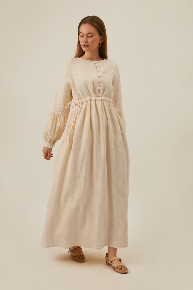 Düğmeli Müslin Elbise Ekru