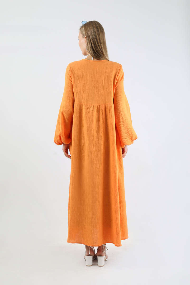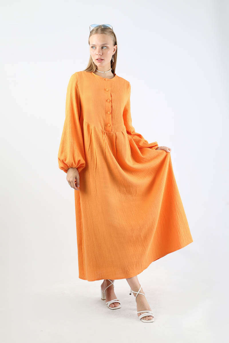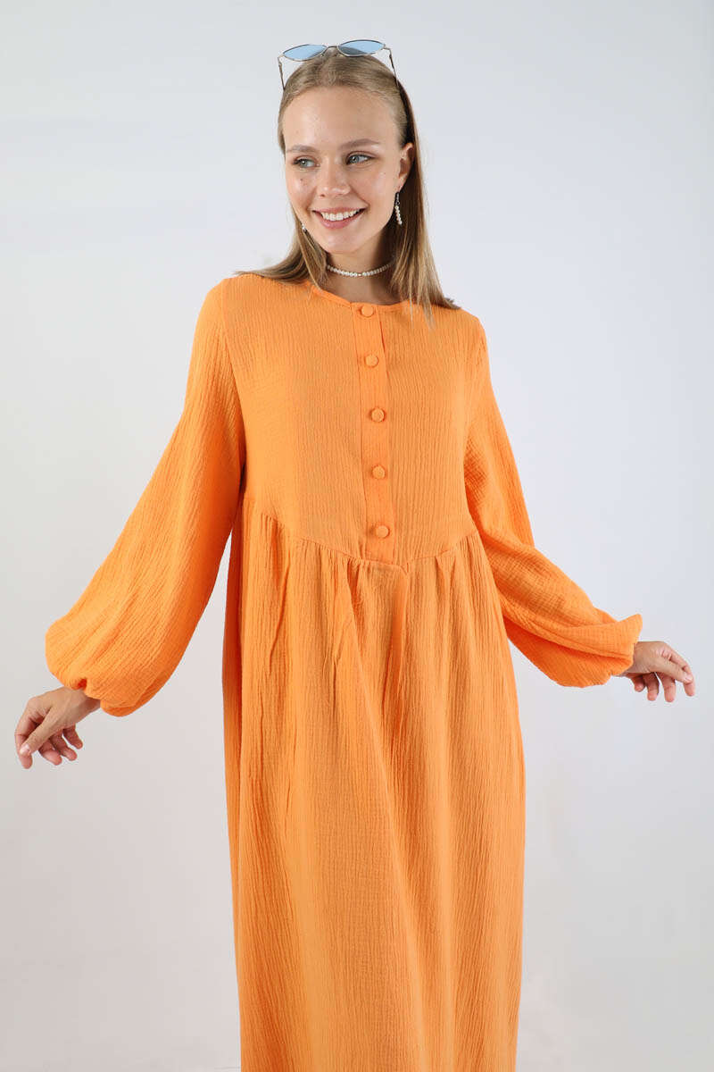 Robası Düğmeli Müslin Elbise Oranj