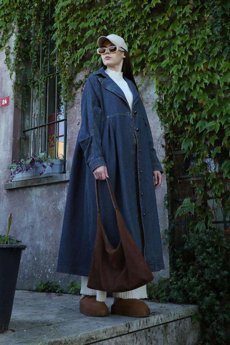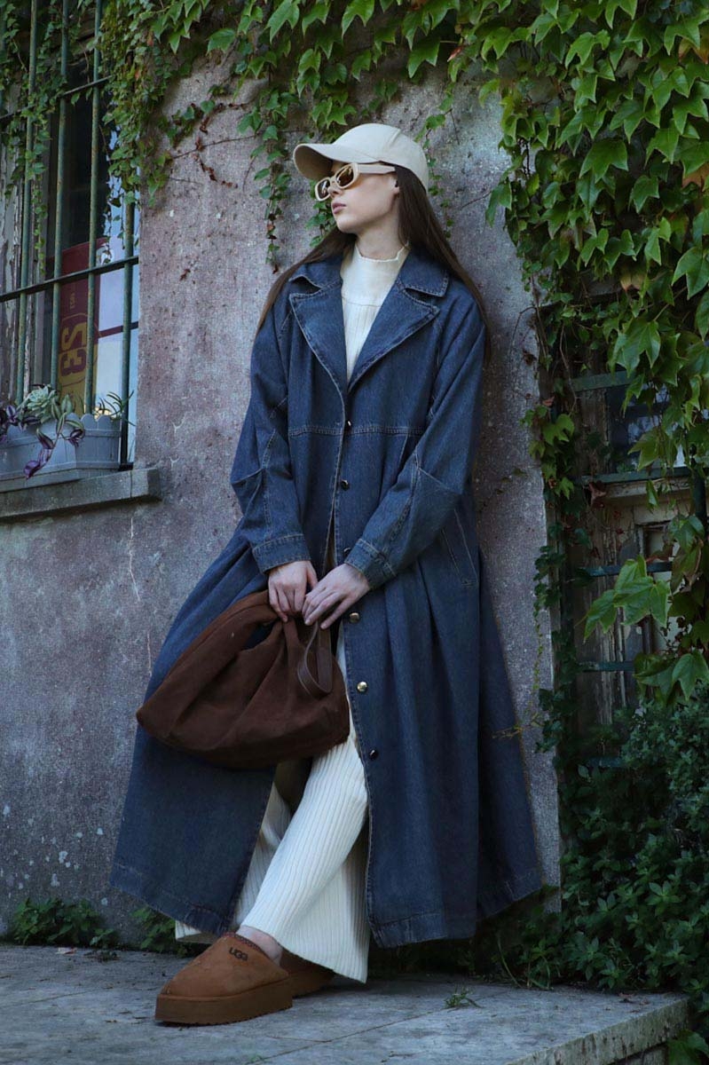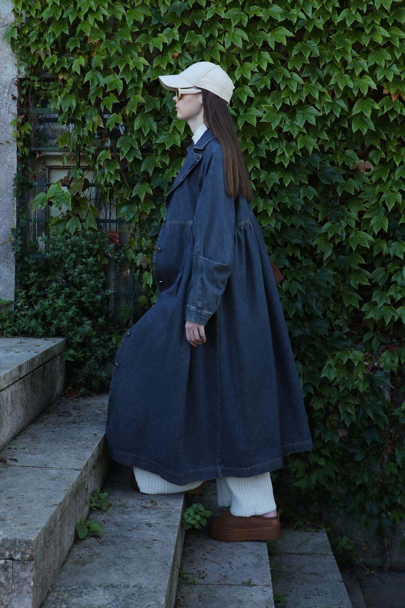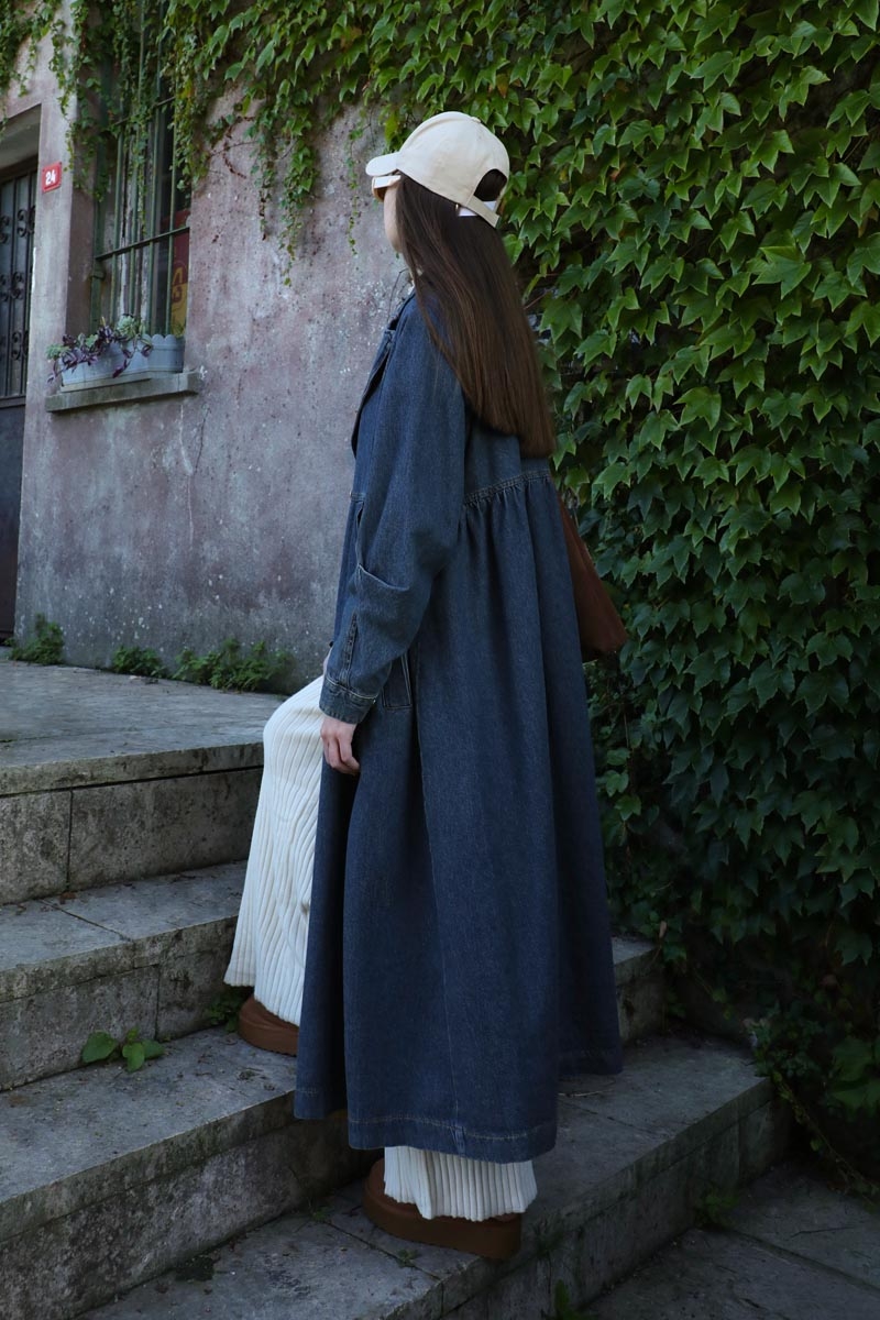 Düğmeli Salaş Denim Trençkot Koyu Mavi