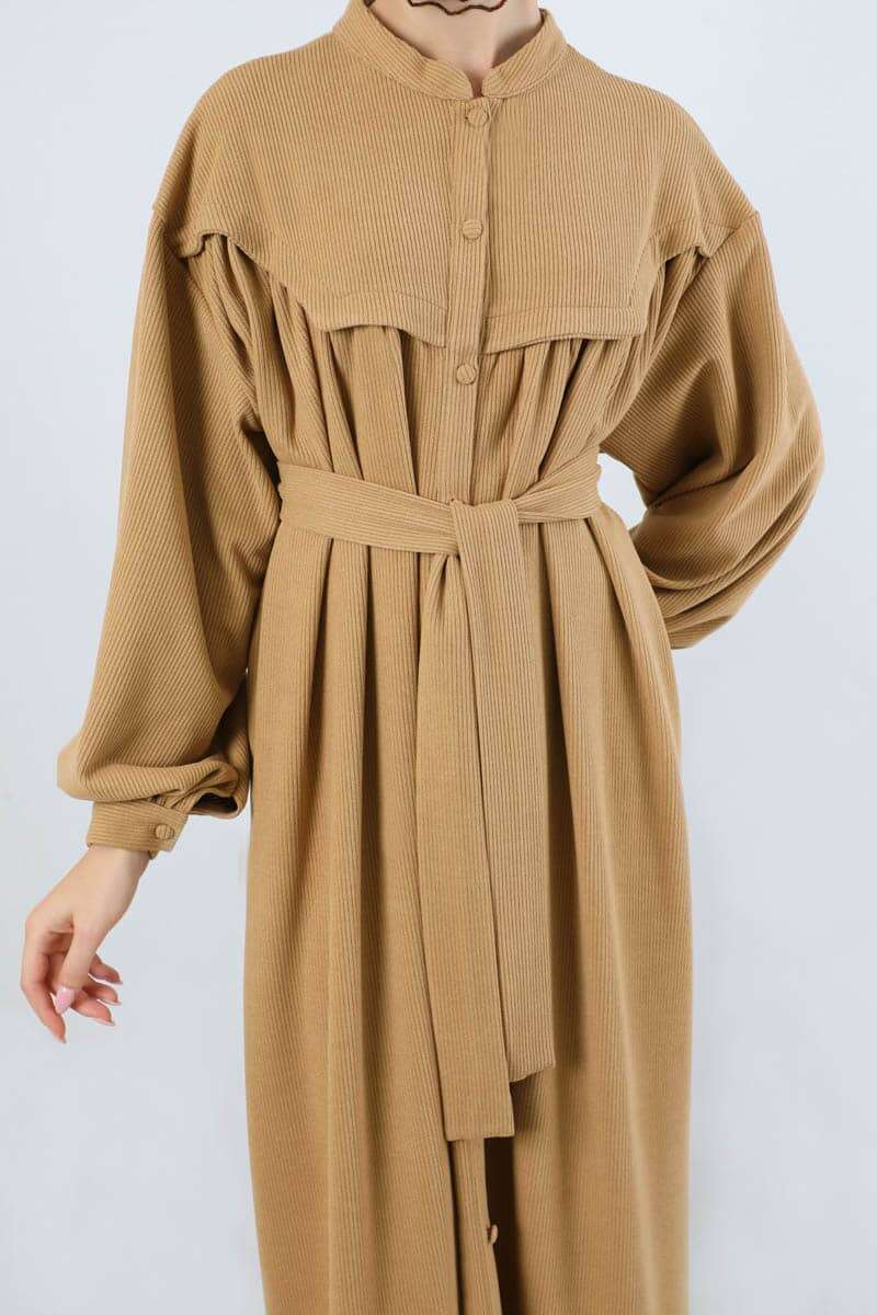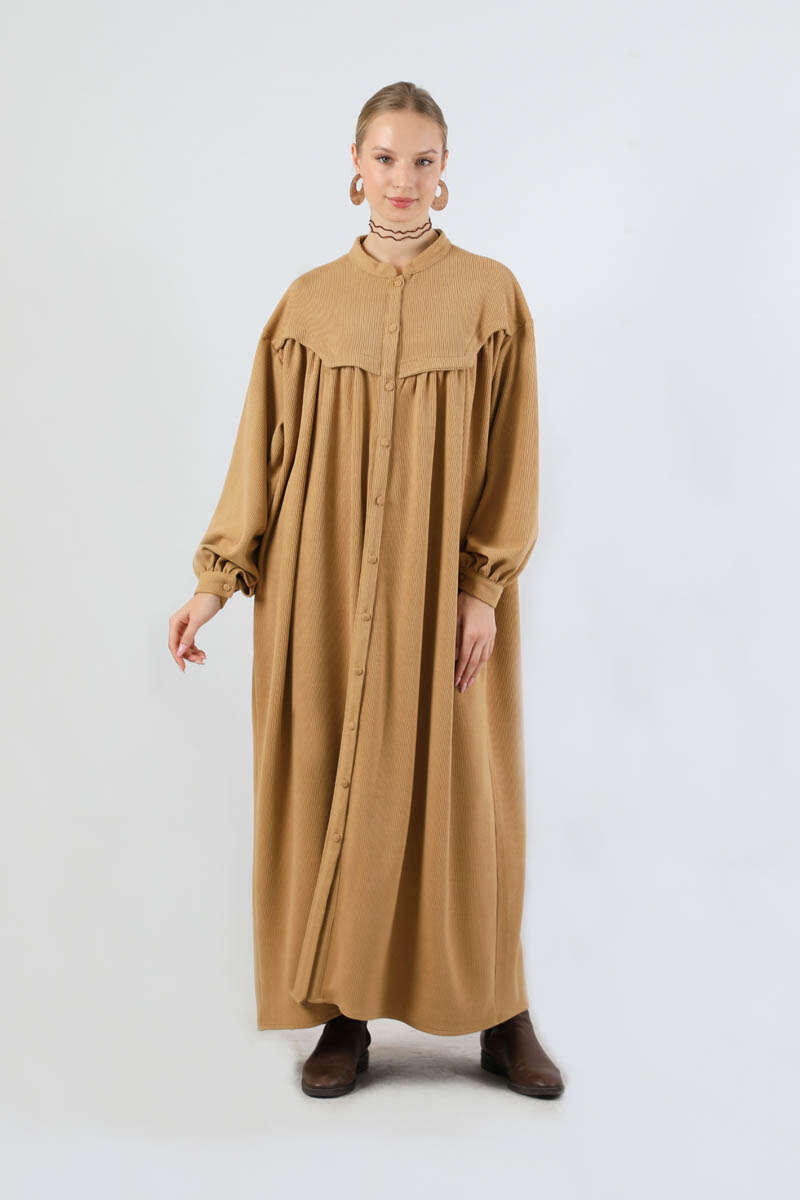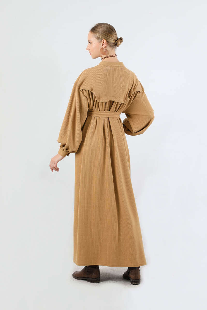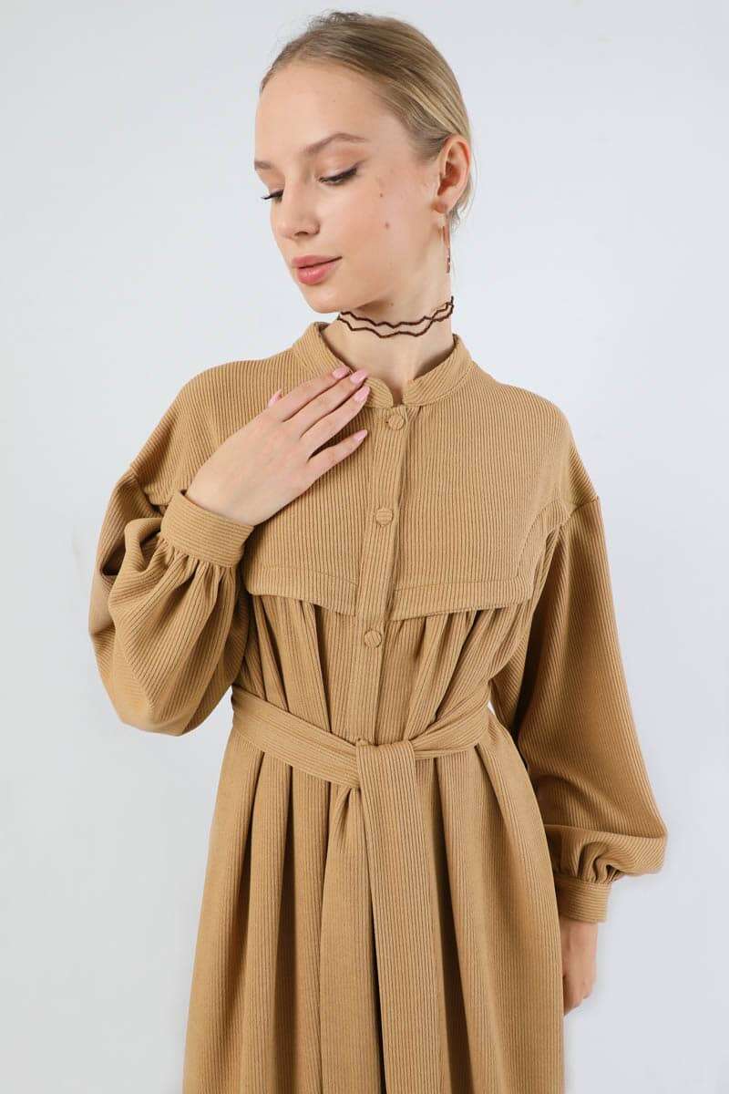 Düğmeli Triko Elbise Camel. Hakim yakalıdır. Ön roba altında büzgü detaylıdır. Düşük kolludur. Kaplama düğmelidir. Kuşaklıdır. Günlük kullanım ve özel günlerinizde tercih edebilirsiniz.