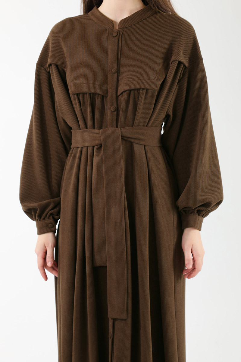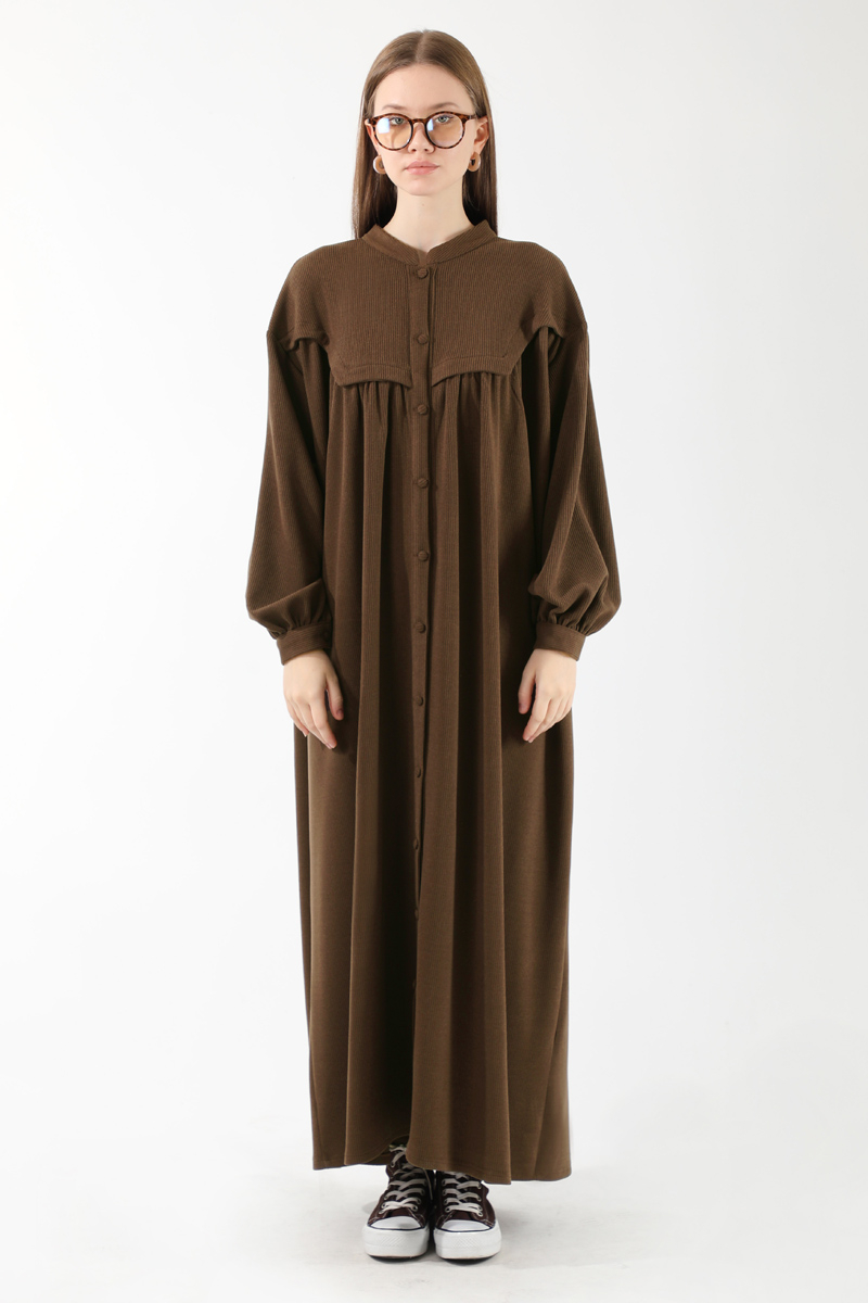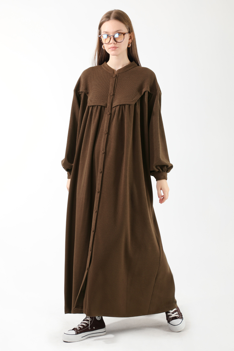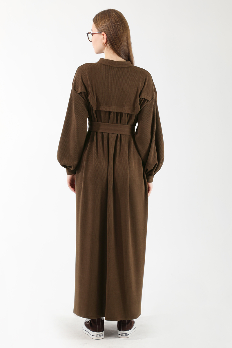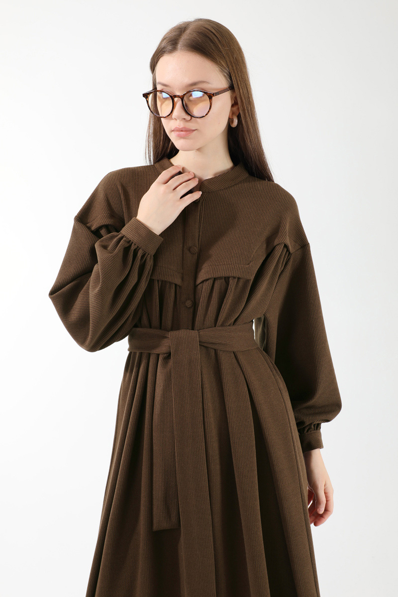Düğmeli Triko Elbise Kahverengi. Hakim yakalıdır. Ön roba altında büzgü detaylıdır. Düşük kolludur. Kaplama düğmelidir. Kuşaklıdır. Günlük kullanım ve özel günlerinizde tercih edebilirsiniz.