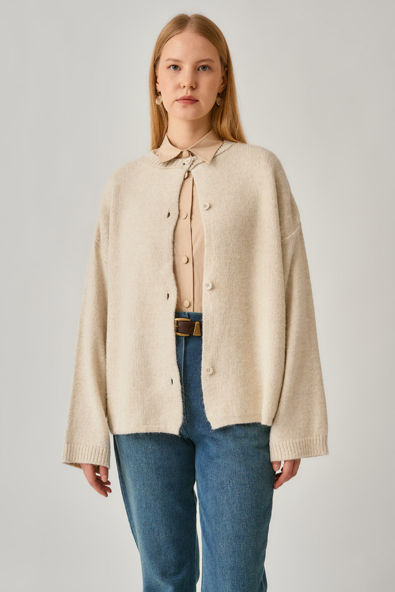 Düğmeli Triko Hırka Ekru, zamansız tasarımıyla hem günlük hem de şık kombinlerde rahatlıkla kullanılabilir. Yuvarlak yaka formu ve önden düğmeli yapısıyla klasik bir görünüm sunarken, oversize kesimi konforlu bir kullanım sağlar. Yumuşak triko dokusu soğuk günlerde sıcak tutar ve farklı parçalarla kolayca kombinlenebilir.