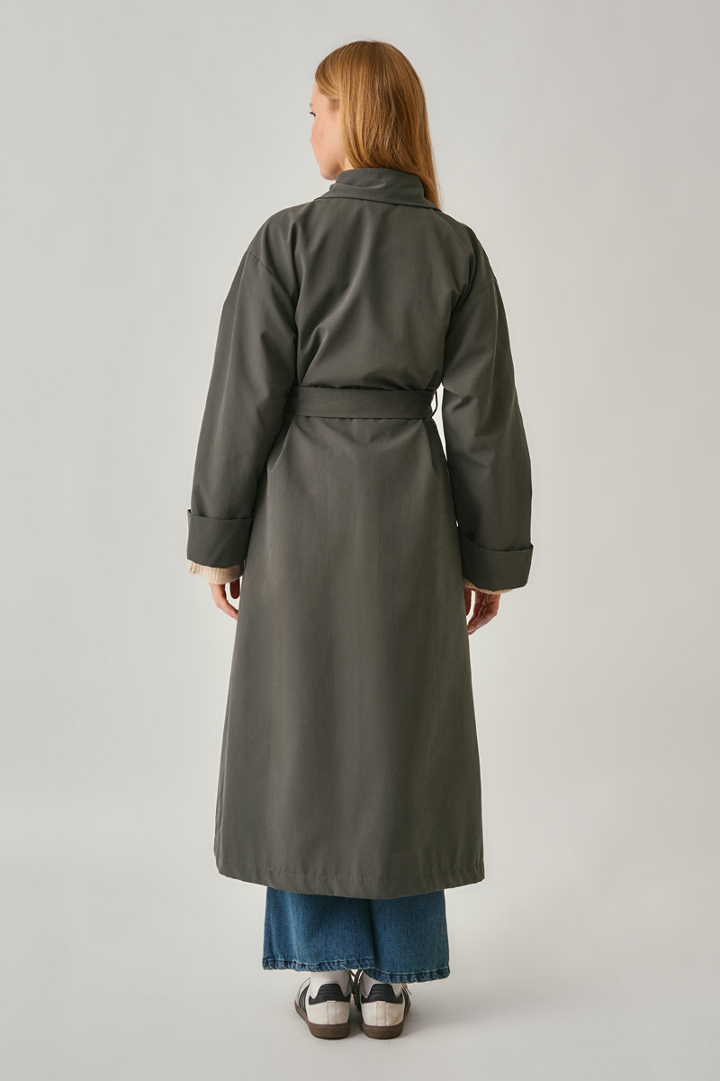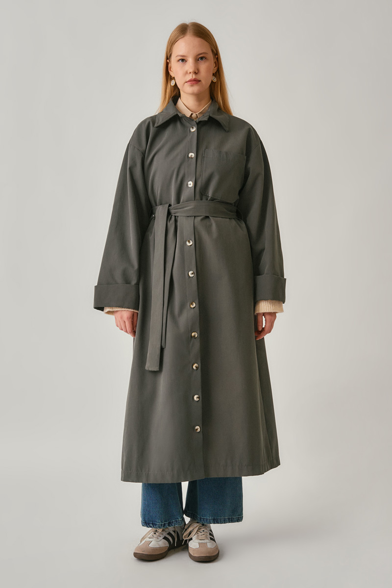 Düğmeli Uzun Trençkot Antrasit