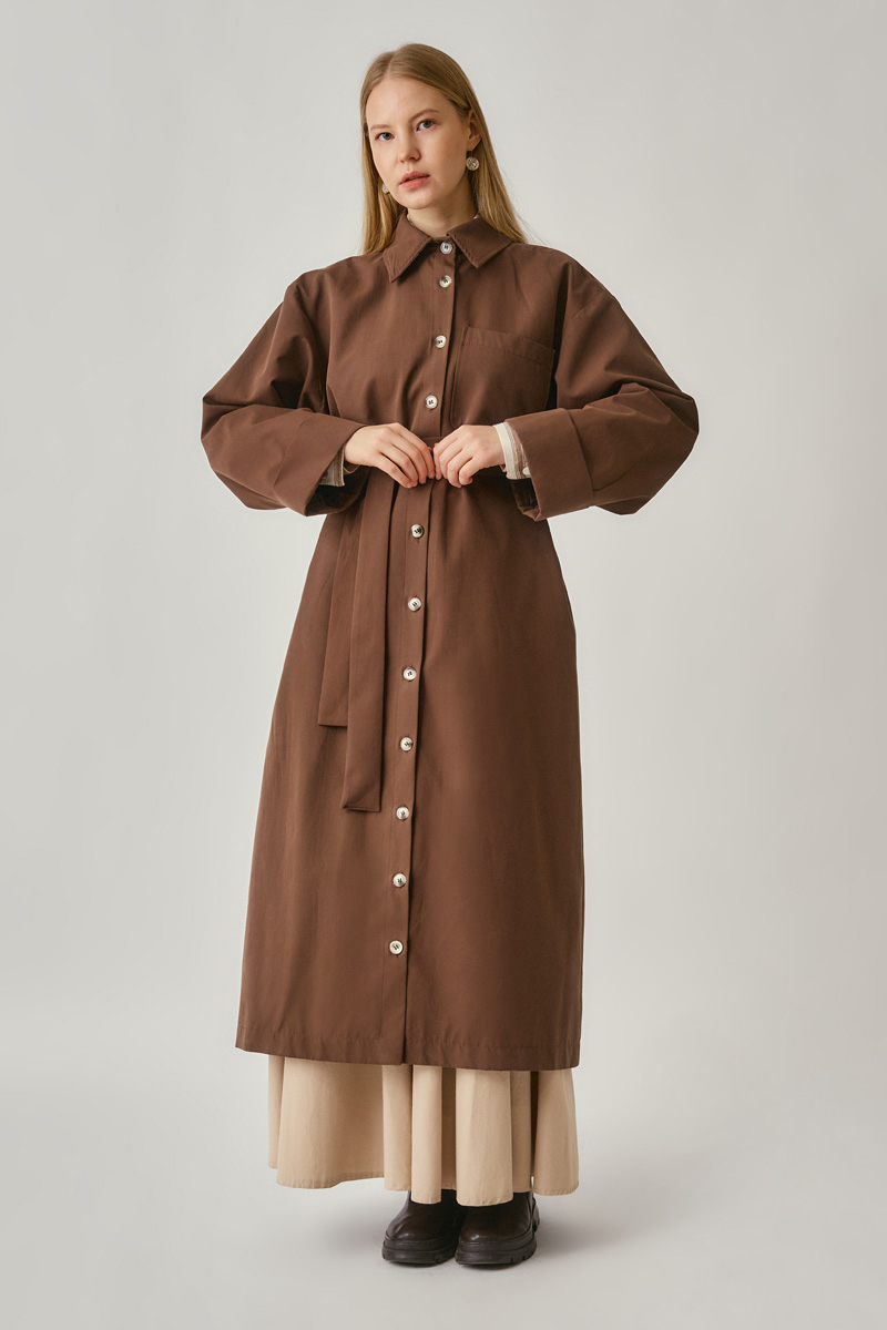 Düğmeli Uzun Trençkot Kahverengi, sade çizgileri ve zamansız tasarımıyla her sezon gardırobunuzun en değerli parçalarından biri olmaya aday. Düğmeli ön tasarımı ve düz formu ile klasik trençkot görünümünü korurken, bel kısmındaki bağlama detayı sayesinde silueti şekillendirir ve feminen bir duruş kazandırır. Uzun boyu, mevsim geçişlerinde maksimum koruma ve konfor sunarken günlük stilinize şık bir dokunuş katmak için ideal bir parçadır.