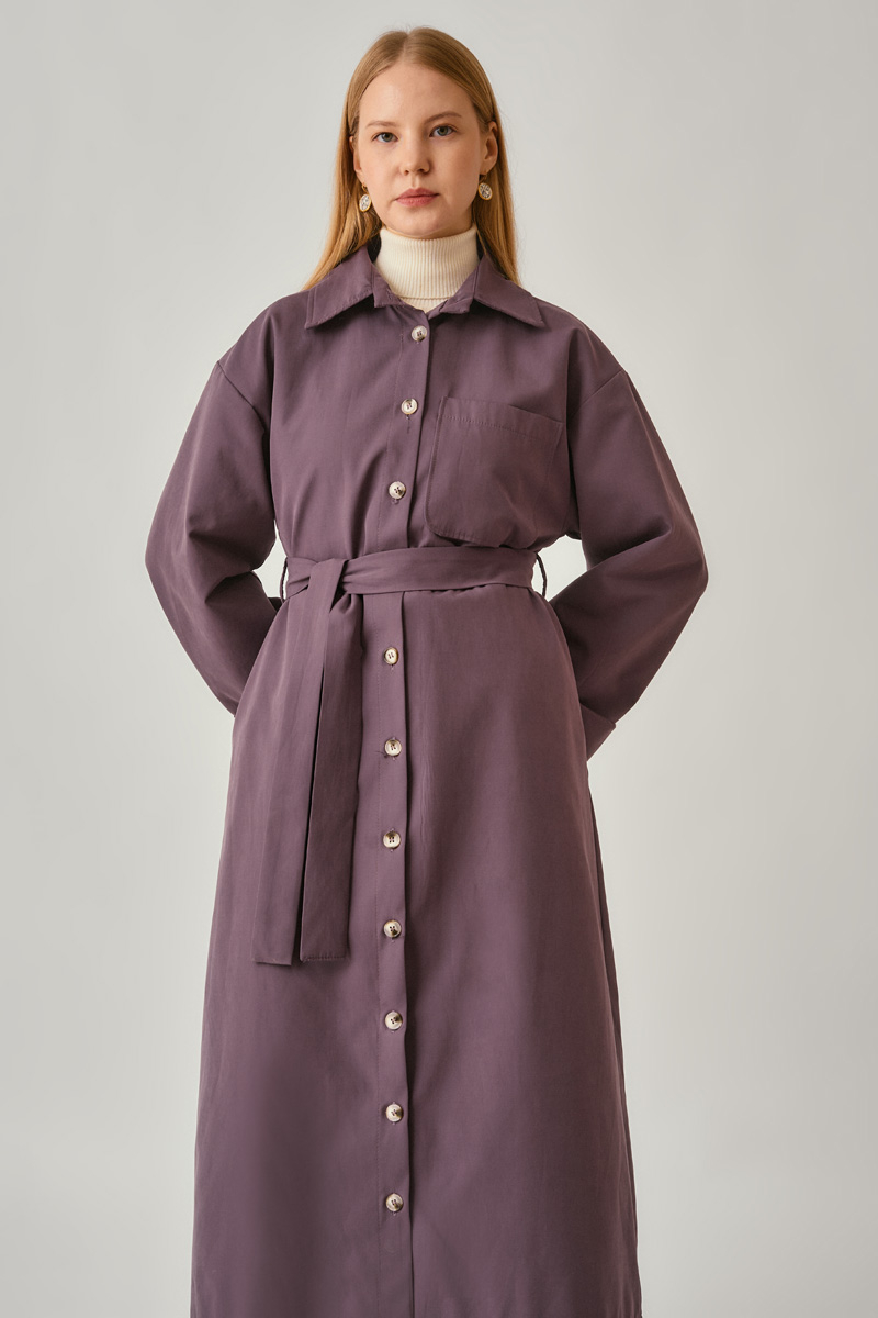 Düğmeli Uzun Trençkot Koyu Mürdüm
