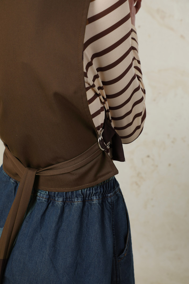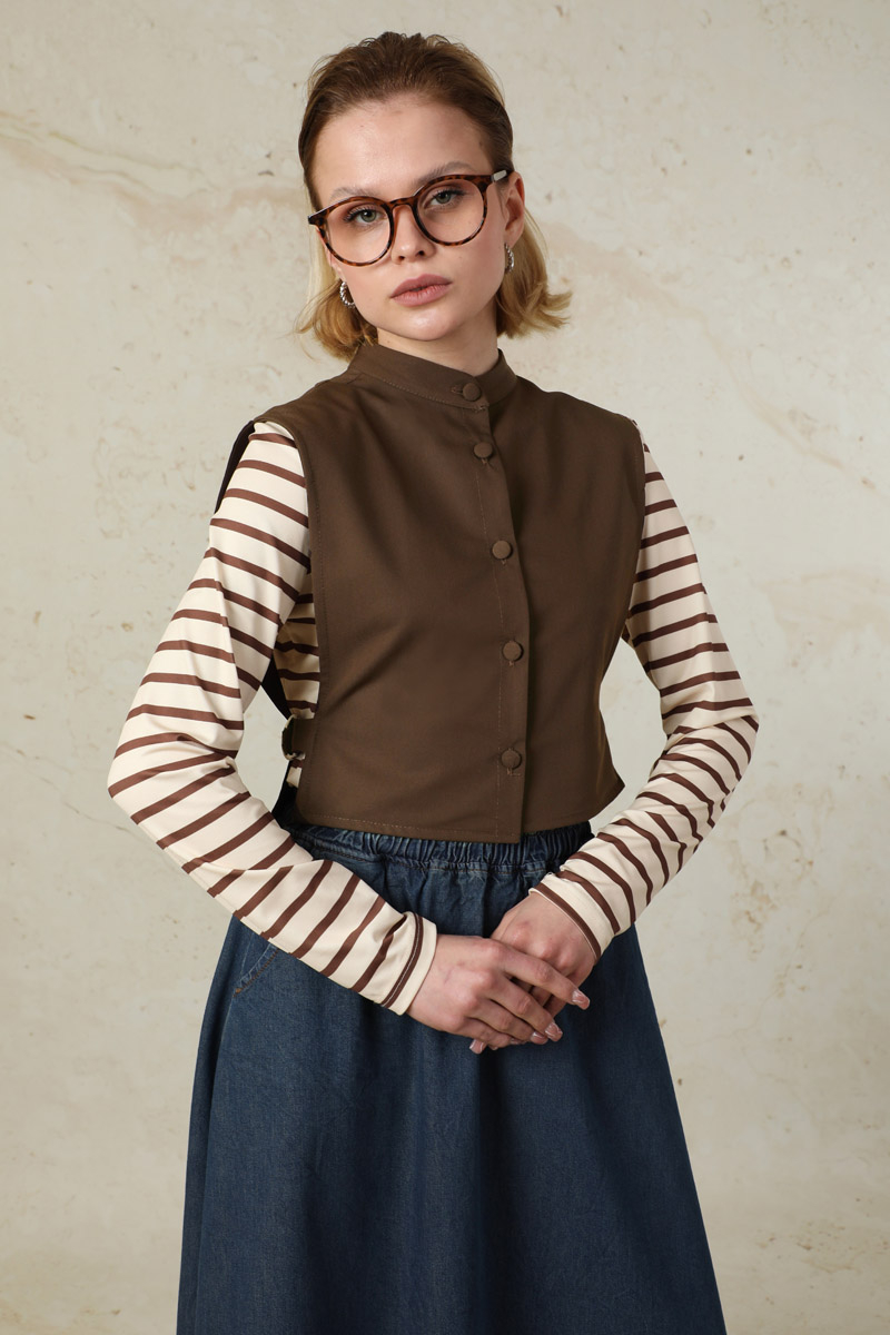 Düğmeli Yelek Kahverengi. Hakim yakalıdır. Önü düğmelidir. Yandan ayarlanabilir metal toka detaylıdır. Elbise ve etek üstüne kombinlenebilir ve özel günlerinizde tercih edebilirsiniz.