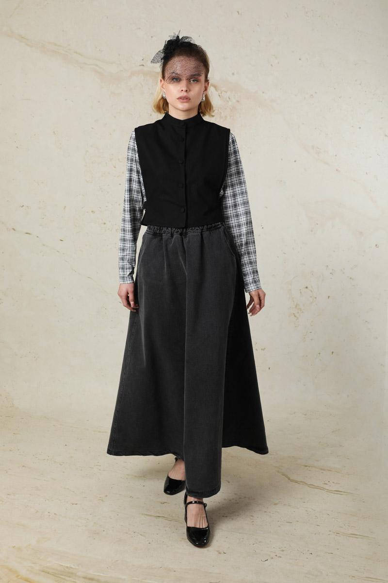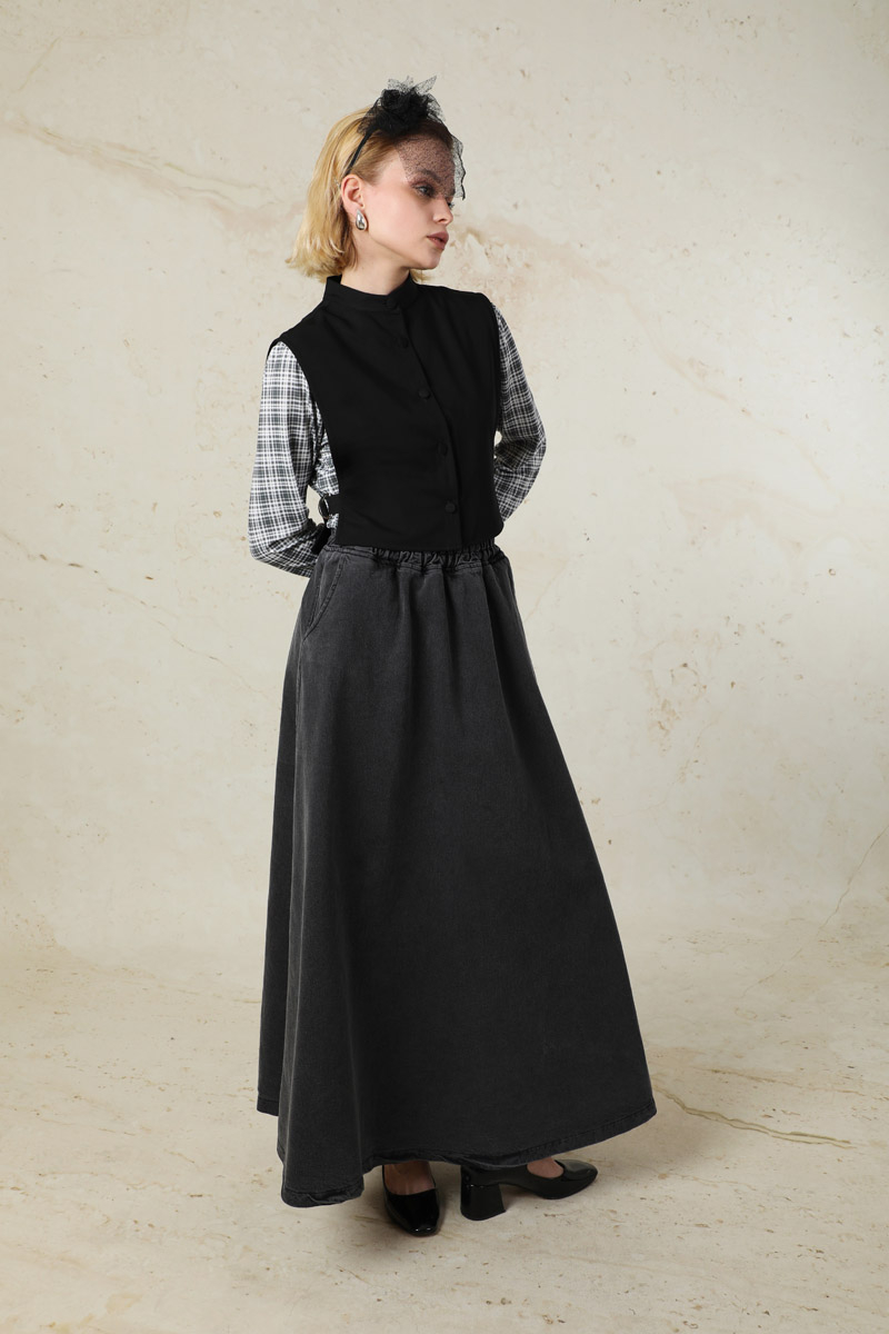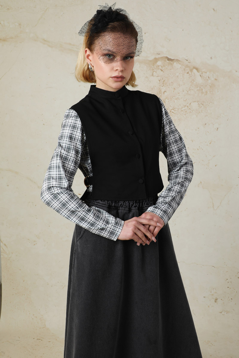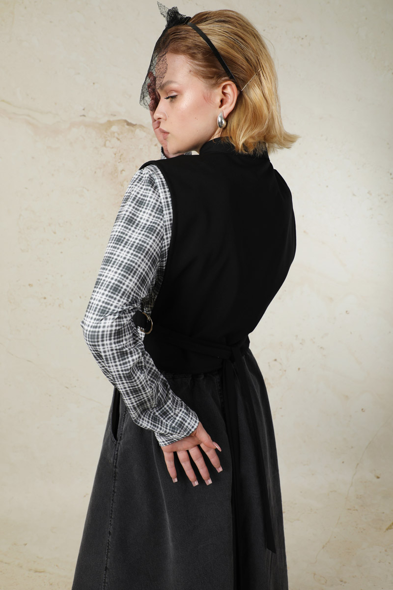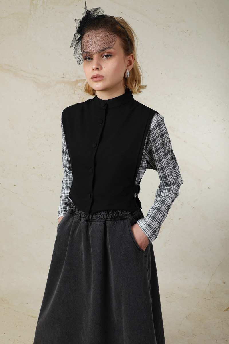 Düğmeli Yelek Siyah. Hakim yakalıdır. Önü düğmelidir. Yandan ayarlanabilir metal toka detaylıdır. Elbise ve etek üstüne kombinlenebilir ve özel günlerinizde tercih edebilirsiniz.
