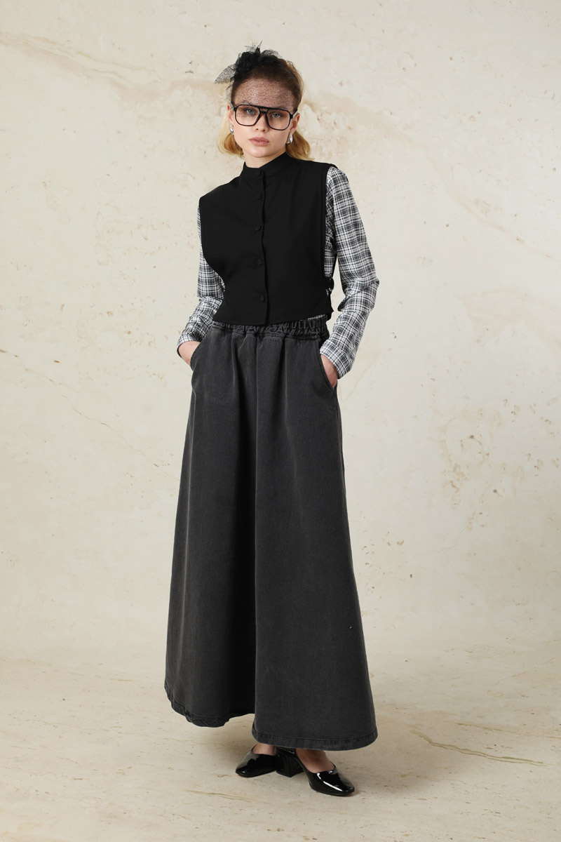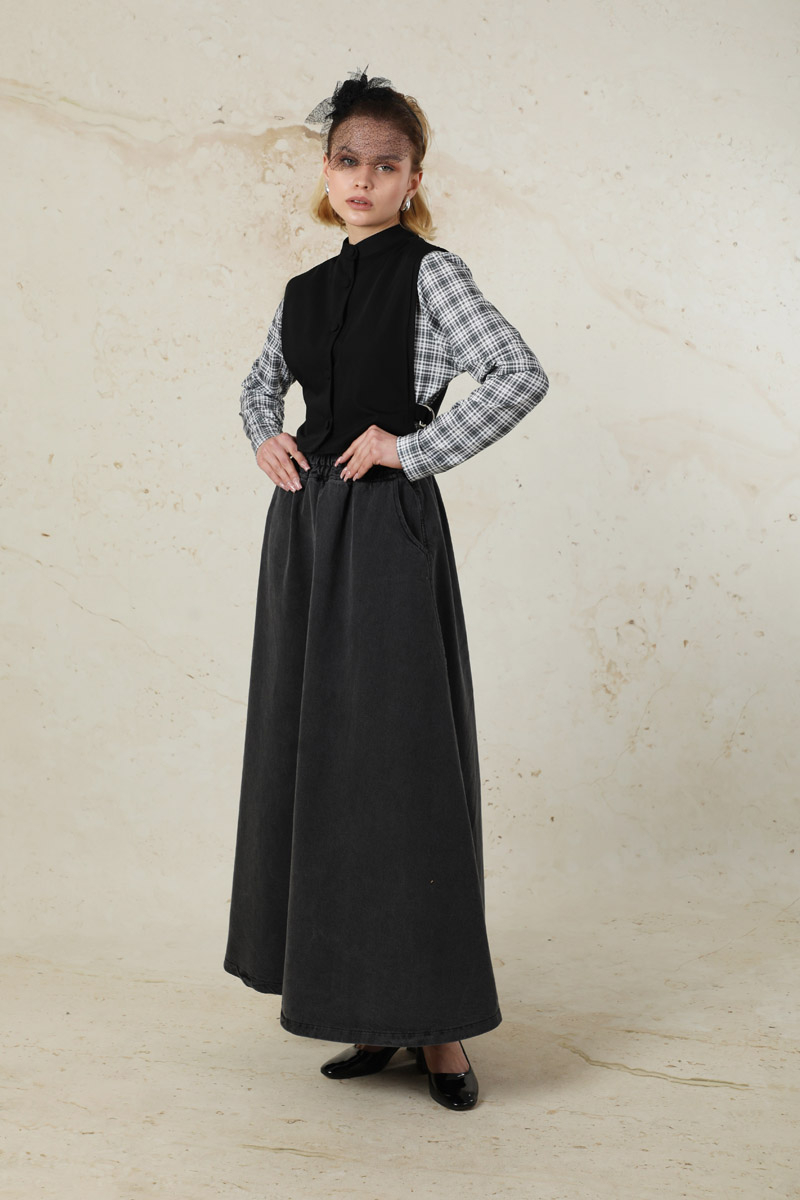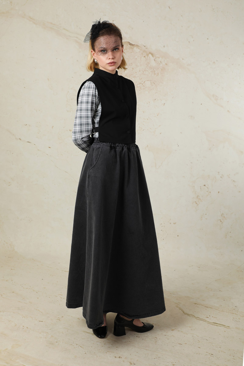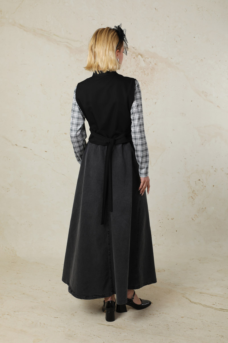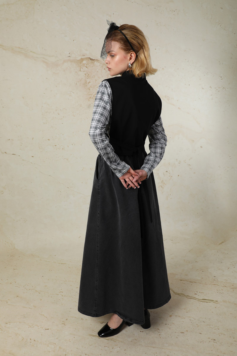 Düğmeli Yelek Siyah. Hakim yakalıdır. Önü düğmelidir. Yandan ayarlanabilir metal toka detaylıdır. Elbise ve etek üstüne kombinlenebilir ve özel günlerinizde tercih edebilirsiniz.