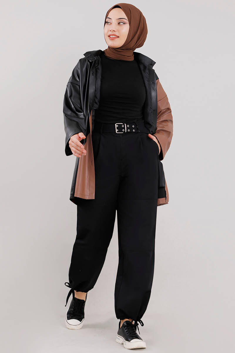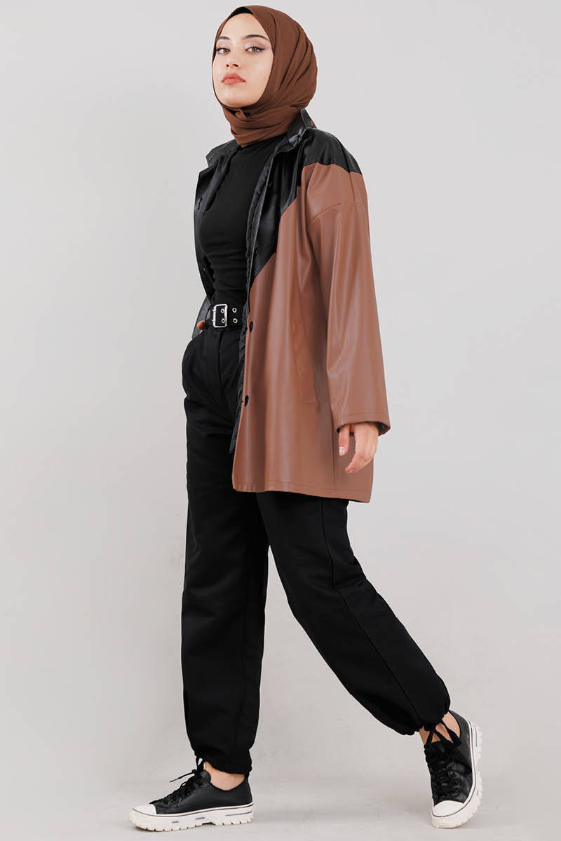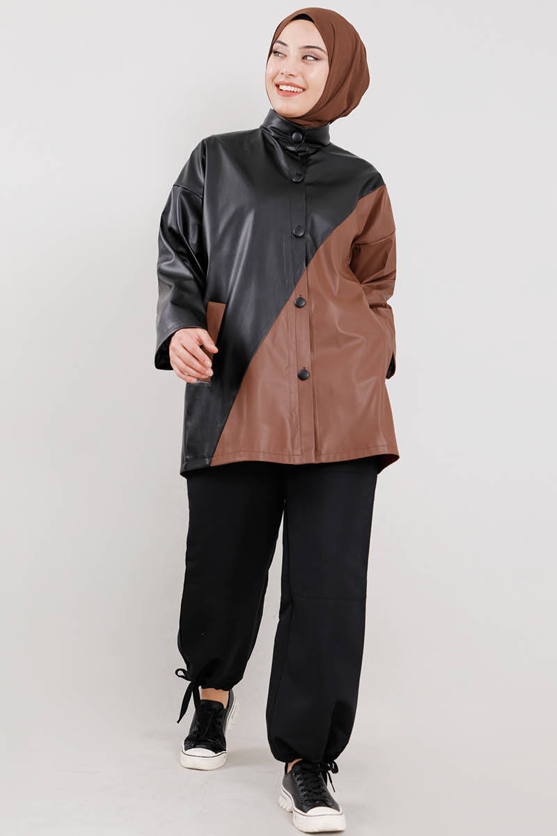 Dominant collar, two-tone, low shoulder, button fastening in the front. It is lined.