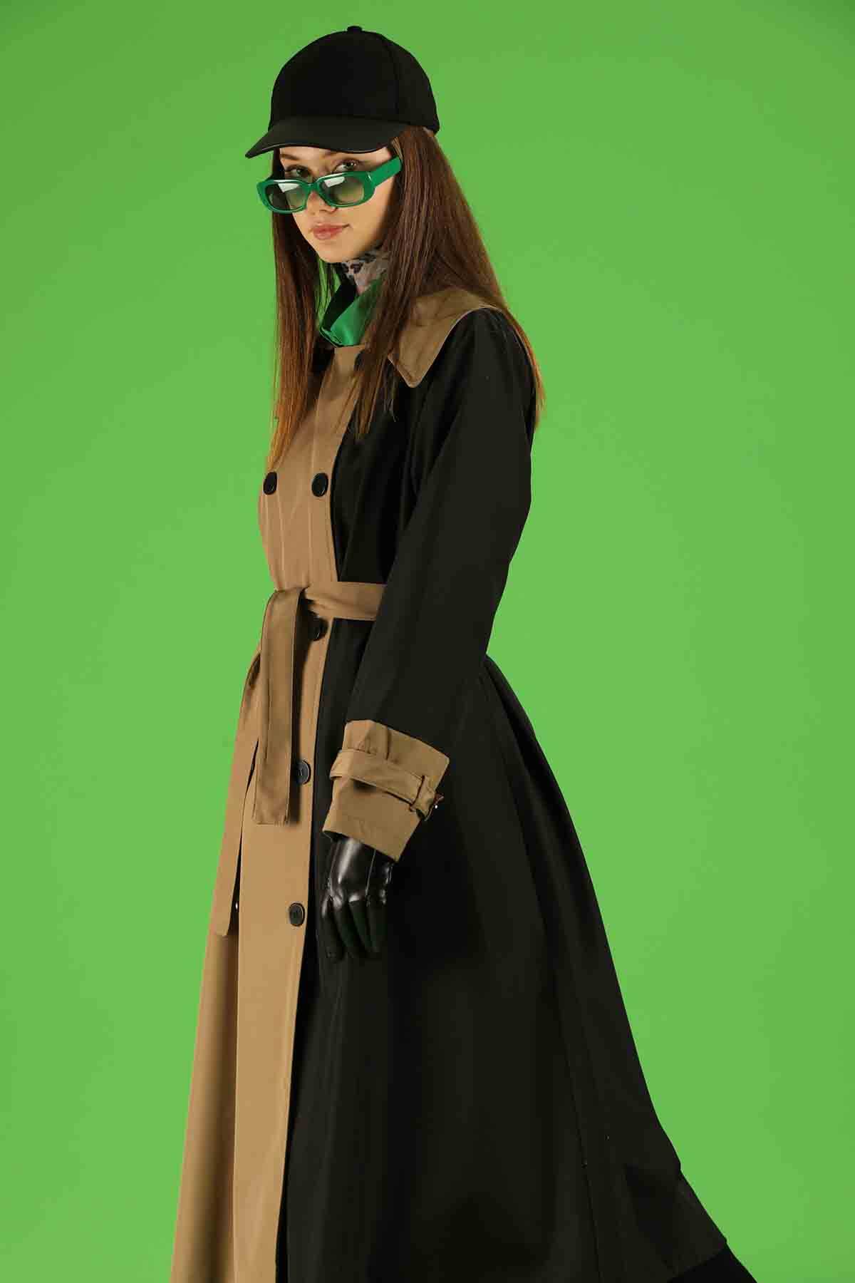 İngiliz yaka, manşetleri kemerli, çift renkli belden kemerli, kruvaze kapama, astarsız. Oversize kalıptır.