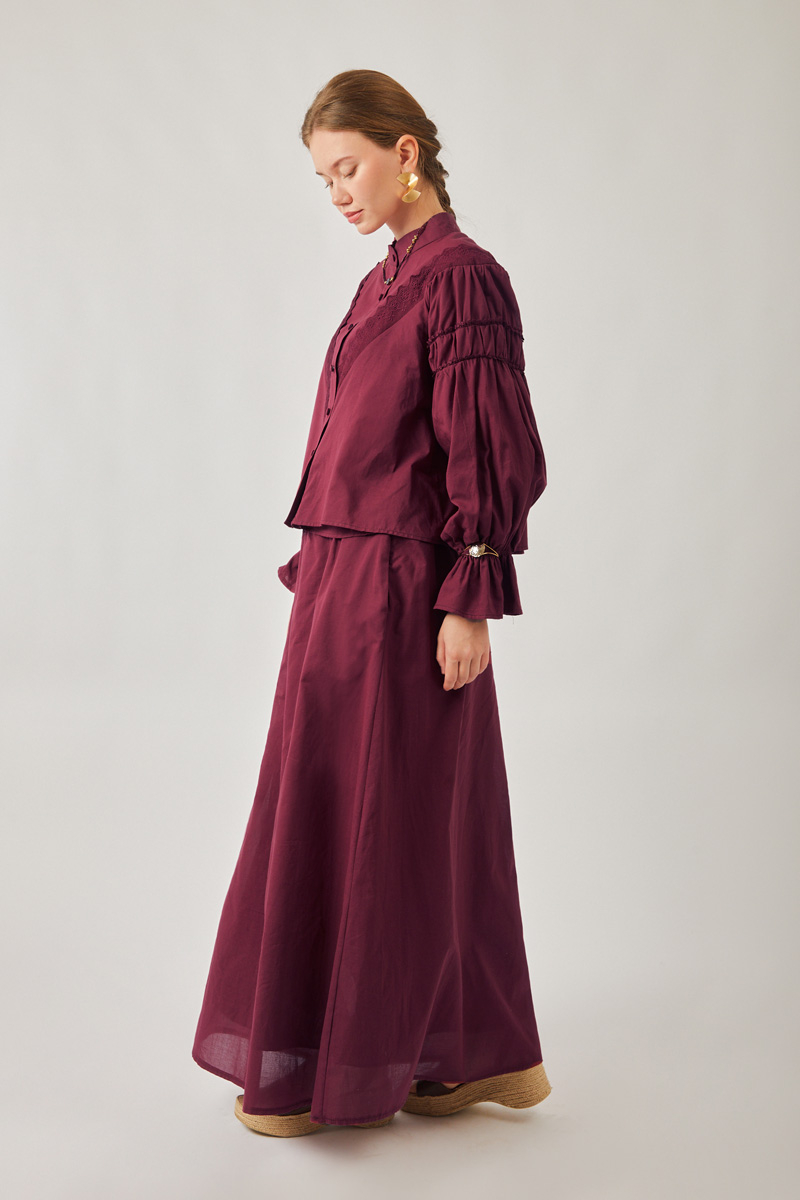 Duru Lace Shirt Burgundy offers an elegant and stylish look. With its buttoned front and collared design, it has a classic cut, while the puff sleeves and frilled cuffs add a modern touch. The lace embroidery extending from the shoulders to the front emphasizes the sophisticated stance of the shirt.