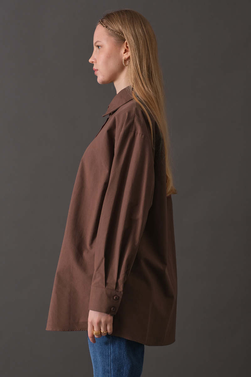 Düşük Kol Düğmeli Gömlek Kahverengi