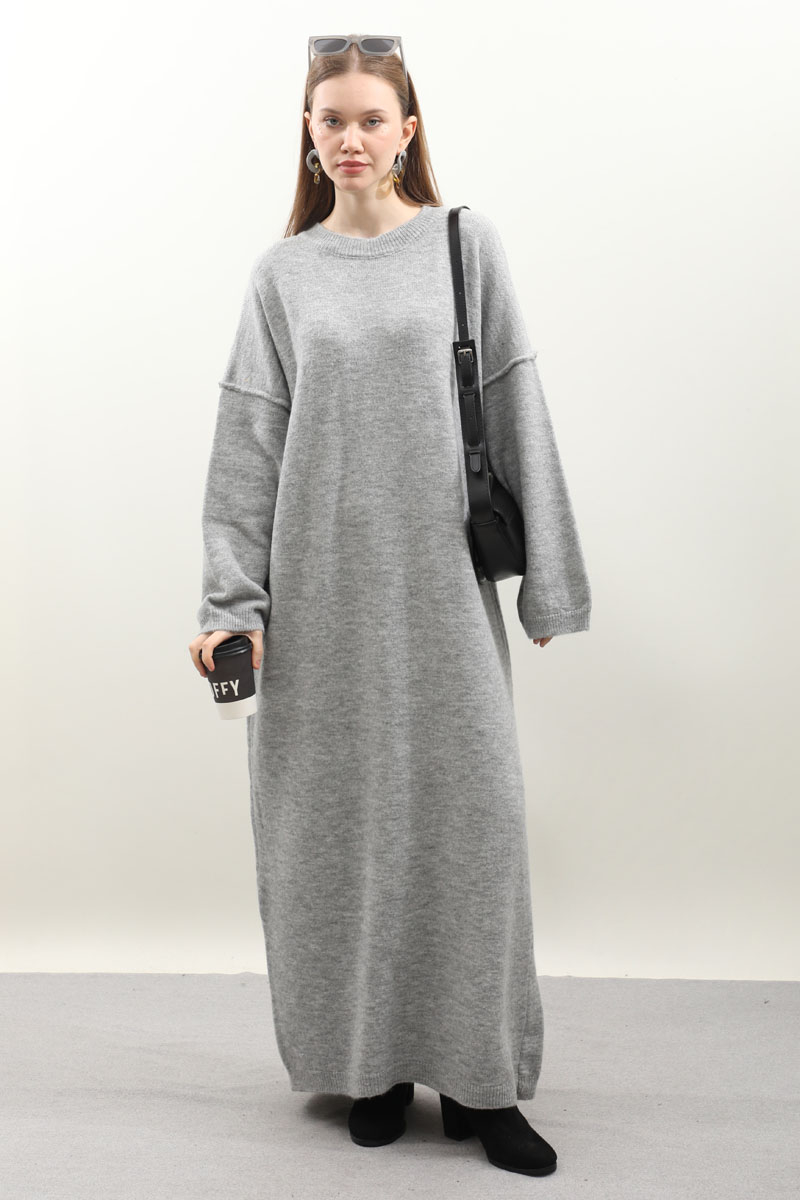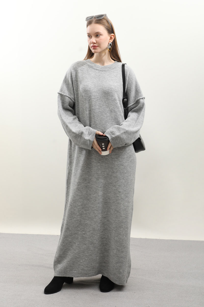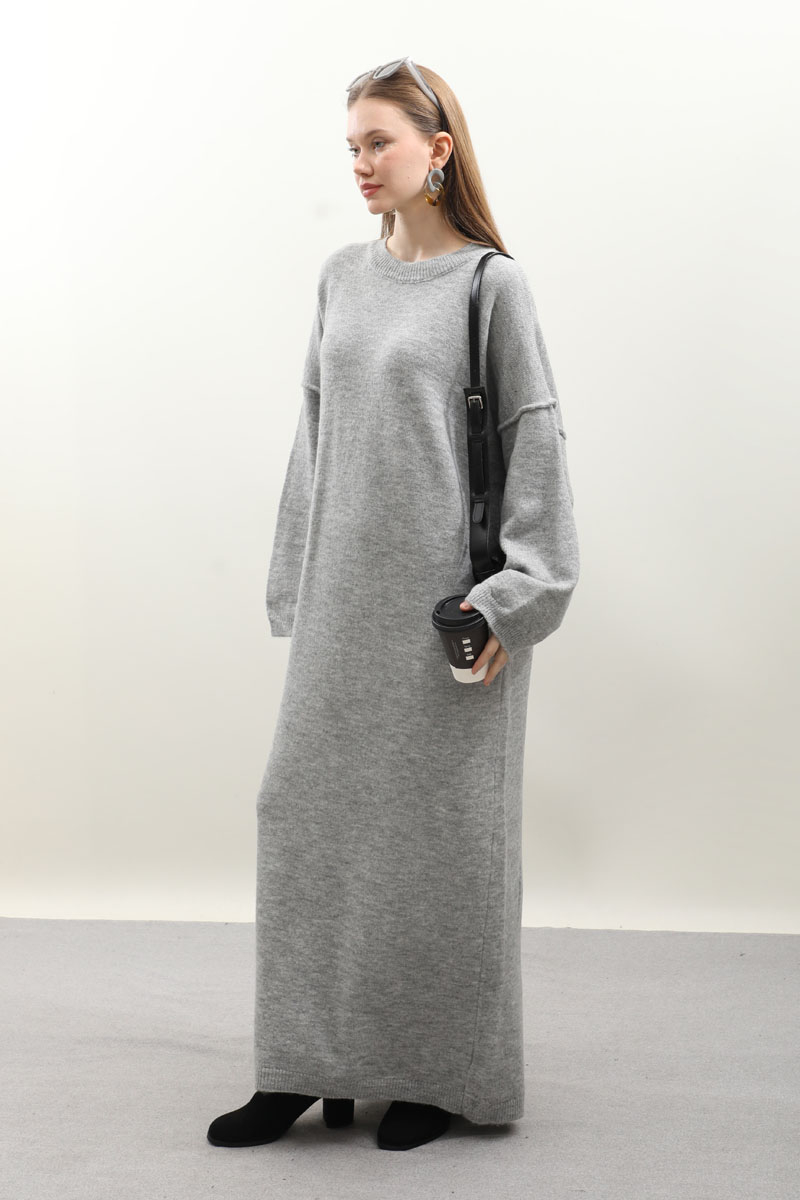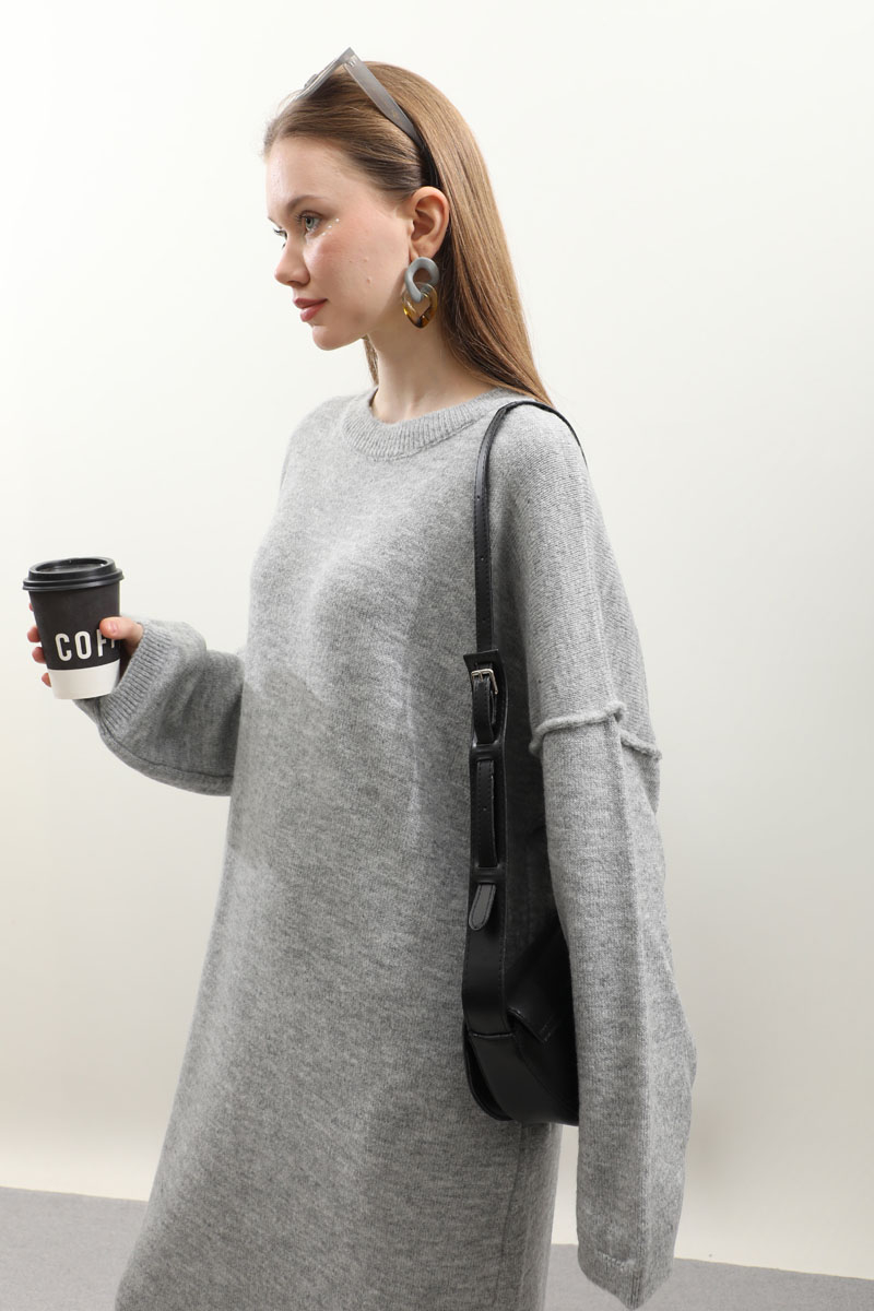 Düşük Omuz Triko Elbise Gri