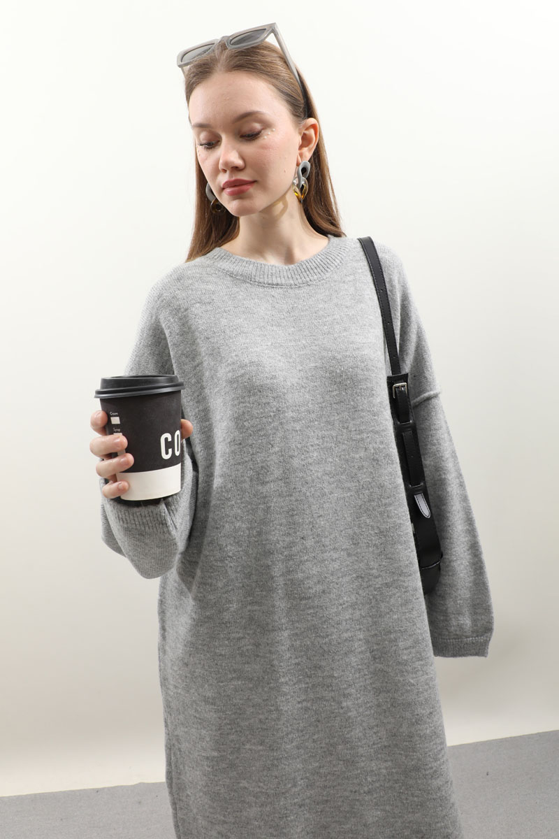 Düşük Omuz Triko Elbise Gri. bisiklet yakadır, önden, düşük omuzludur, omuzdan dikiş detaylıdır, yaka, etek ucu ve manşetleri ribanalıdır, cepsizdir, astarsızdır. Günlük kullanım için uygundur.