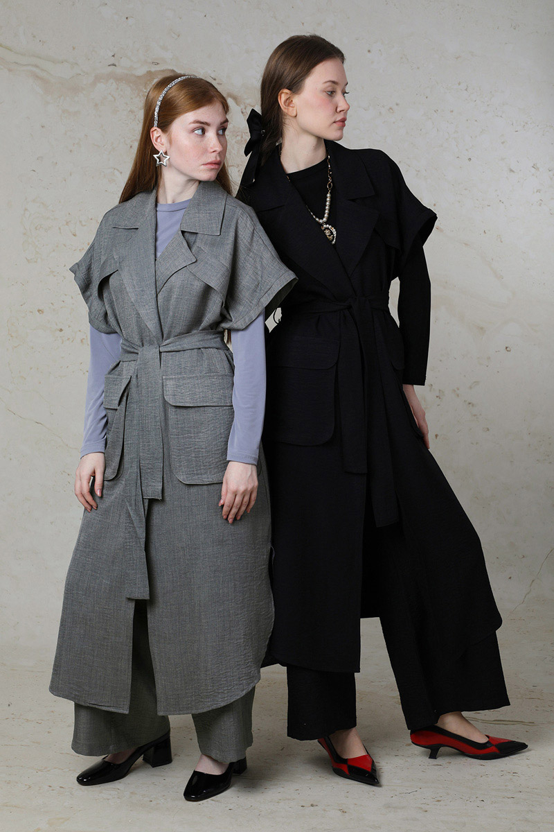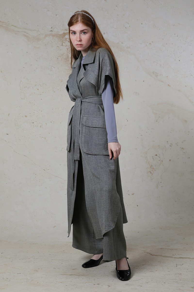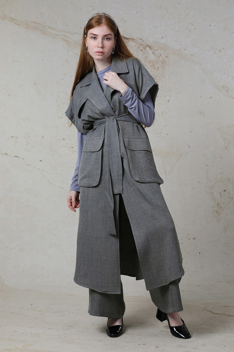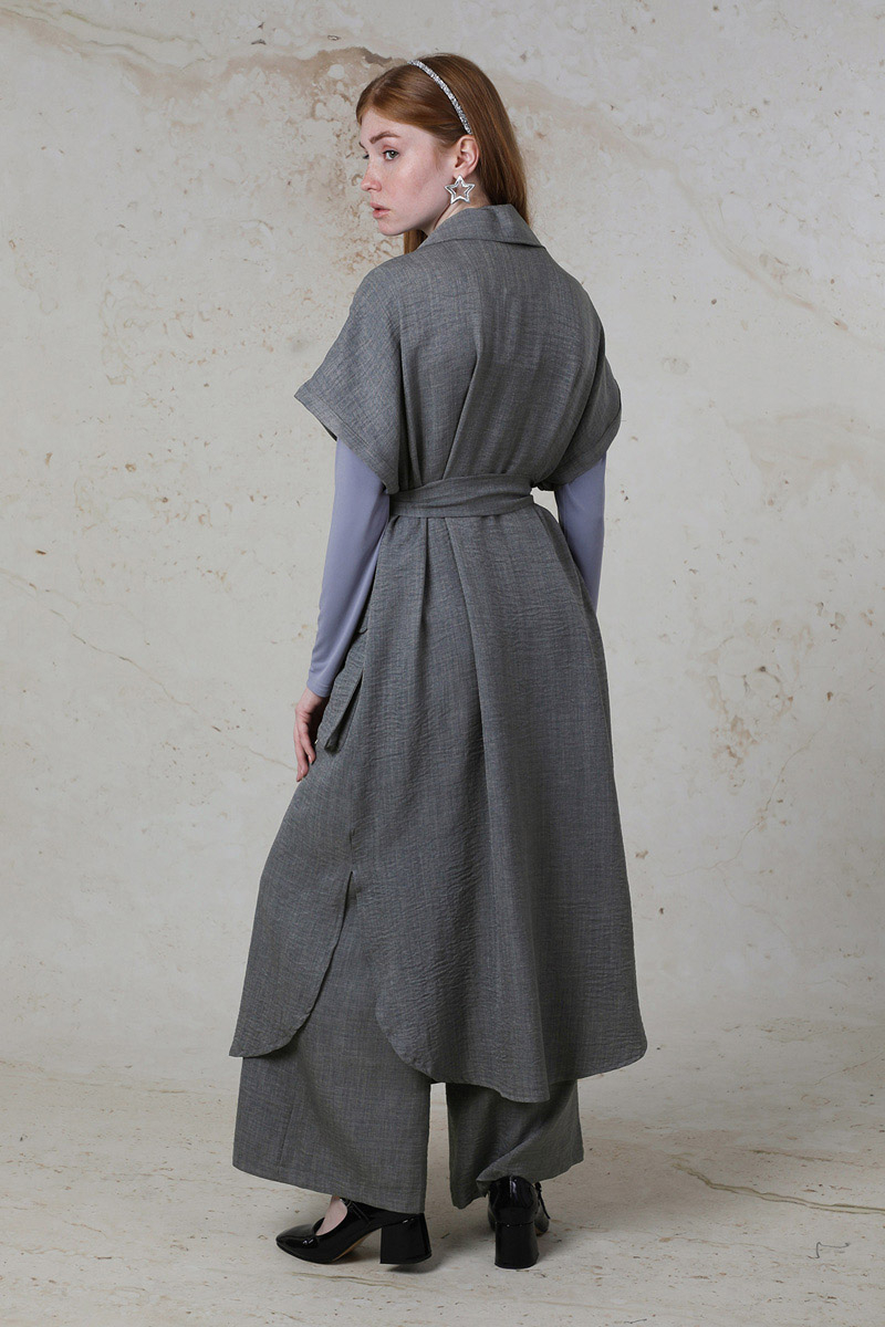 Cepli Yelek Takım Gri. Yelek Düşük omuzludur. Süs cepleri mevcuttur. Yelek yandan yırtmaç detaylıdır. Körüklü aktif cepleri mevcuttur. Pantolon beli lastiklidir. Yandan ceplidir. Günlük kullanım ve özel günlerinizde tercih edebilirsiniz.