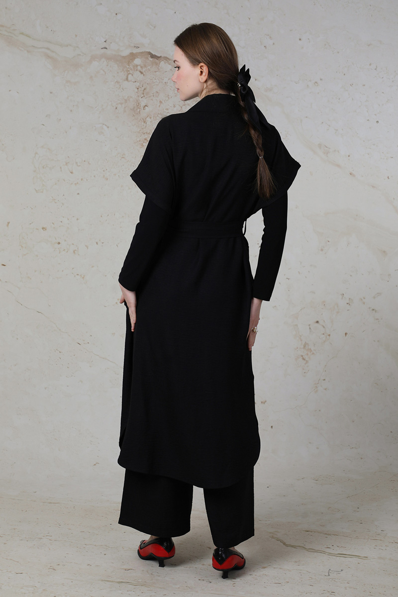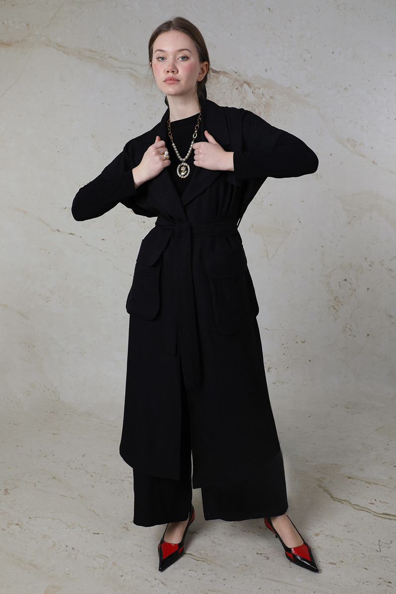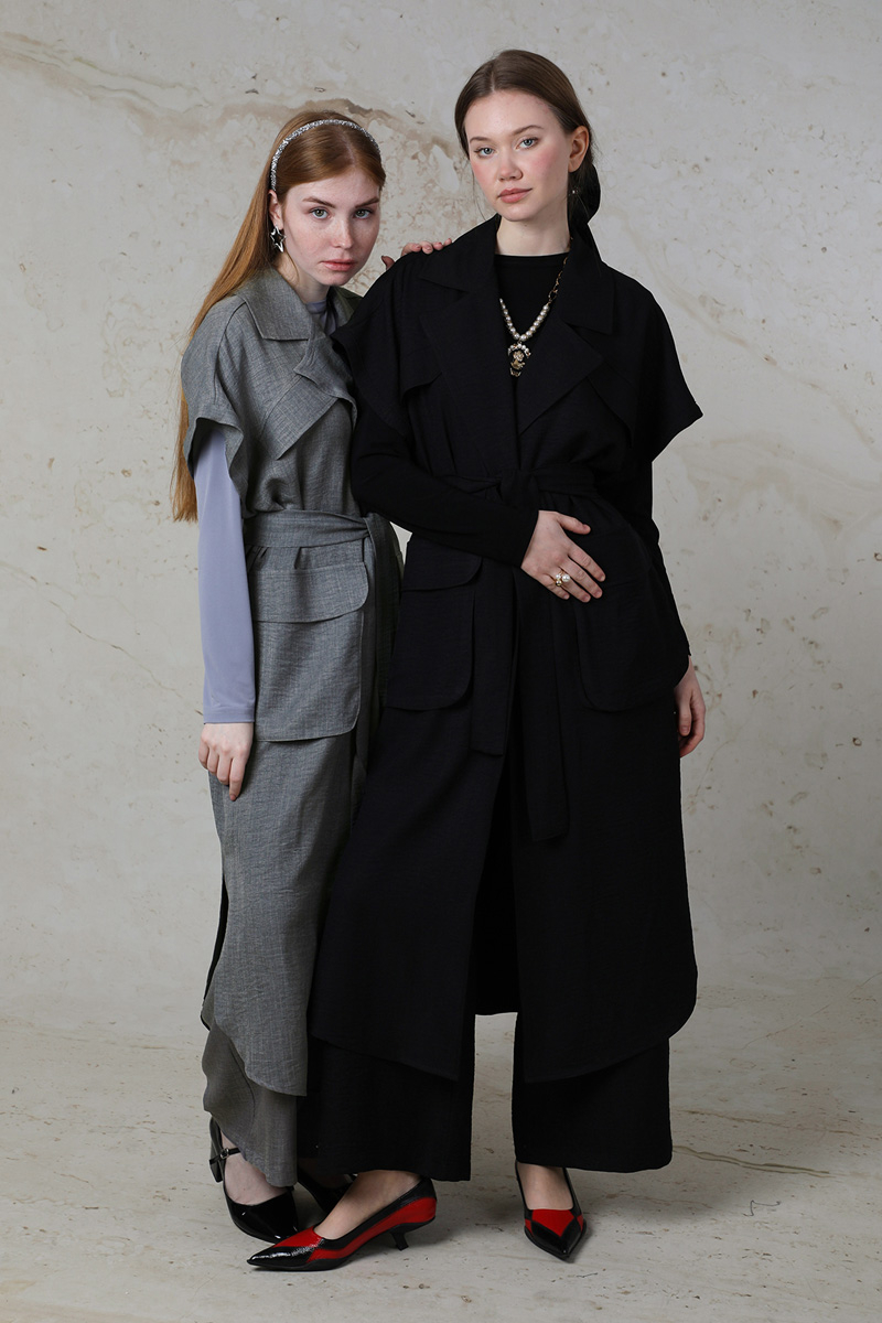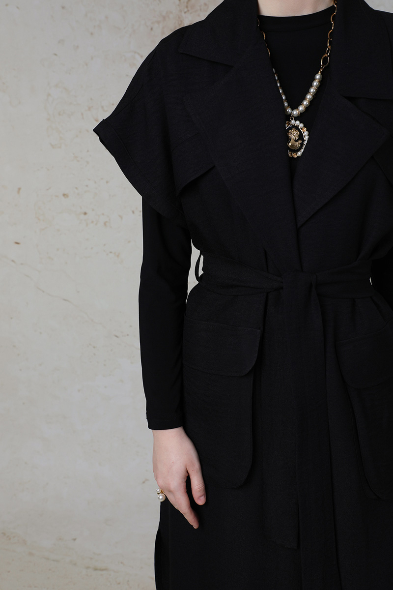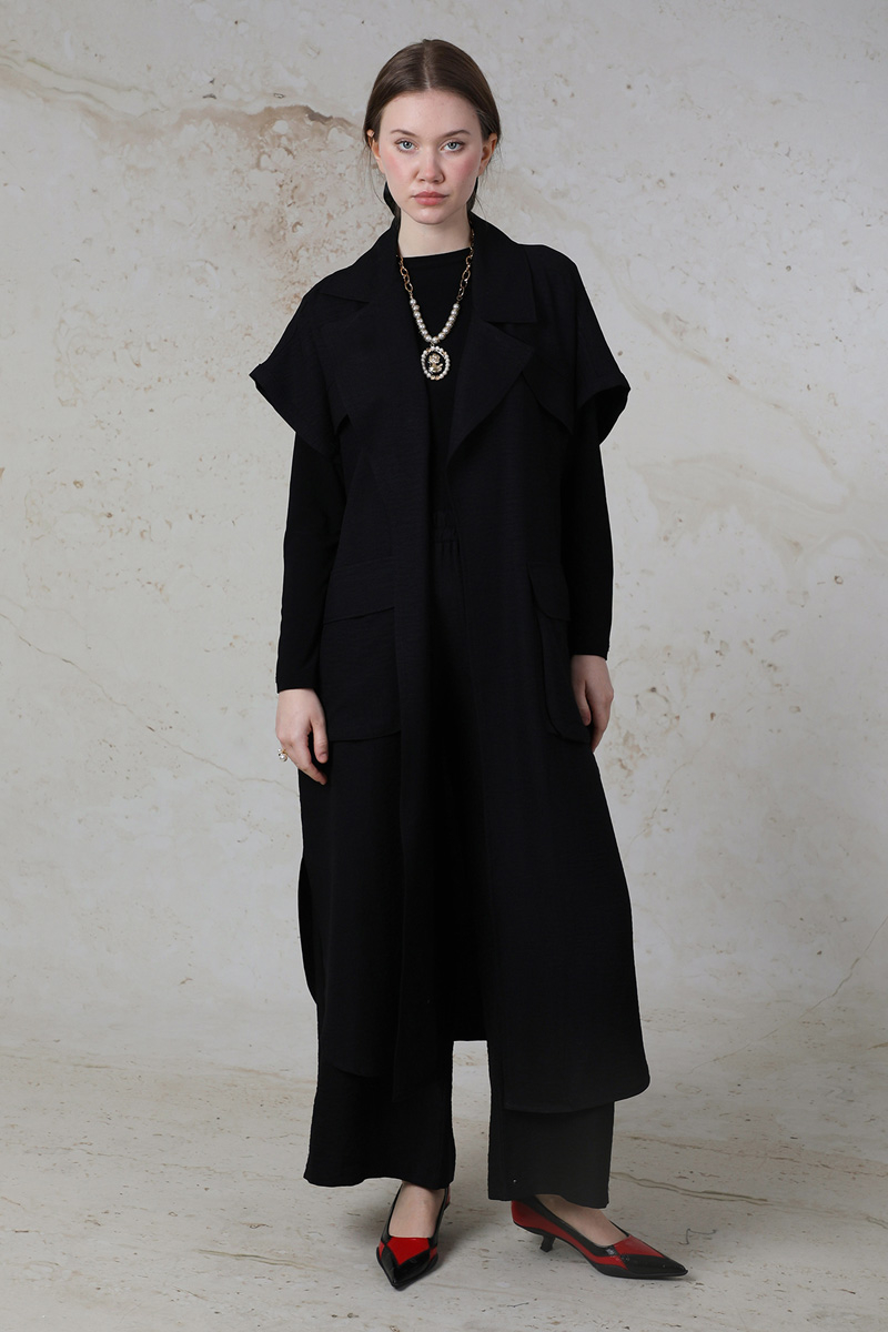 Cepli Yelek Takım Siyah. Yelek Düşük omuzludur. Süs cepleri mevcuttur. Yelek yandan yırtmaç detaylıdır. Körüklü aktif cepleri mevcuttur. Pantolon beli lastiklidir. Yandan ceplidir. Günlük kullanım ve özel günlerinizde tercih edebilirsiniz.
