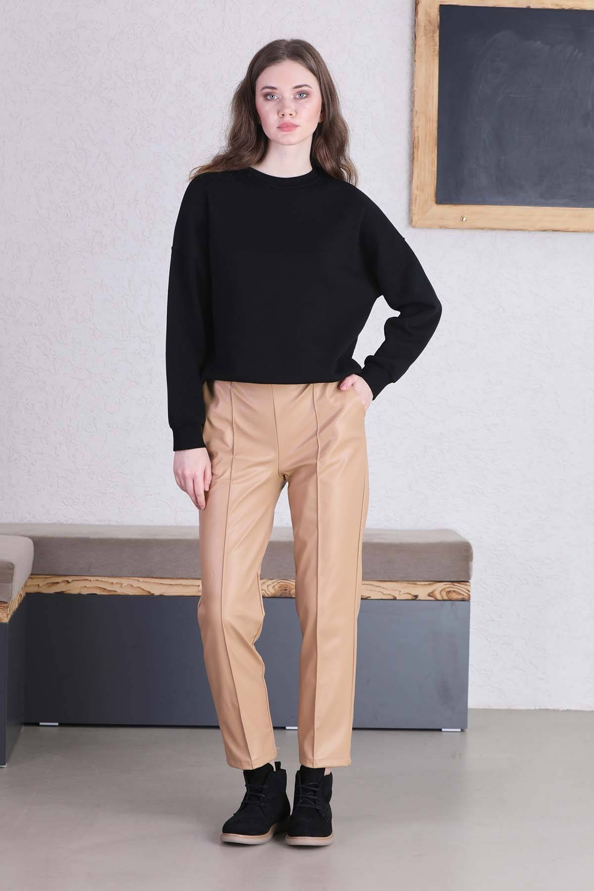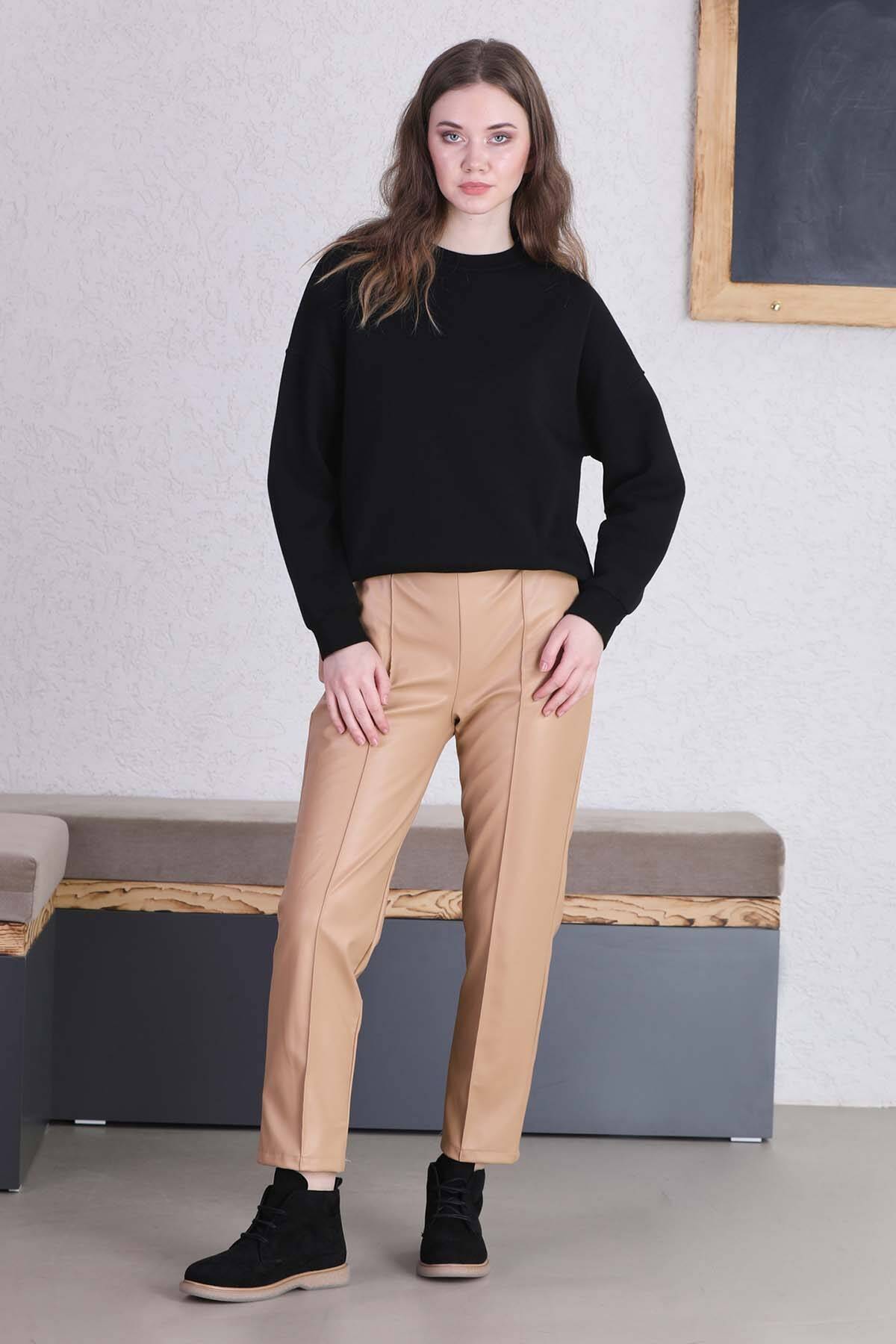 Düz Paça Deri Pantolon Bej. Bel önden düğmeli yandan lastikli. Ön kısmında dikş detayı mevcuttur. Yandan cepli.