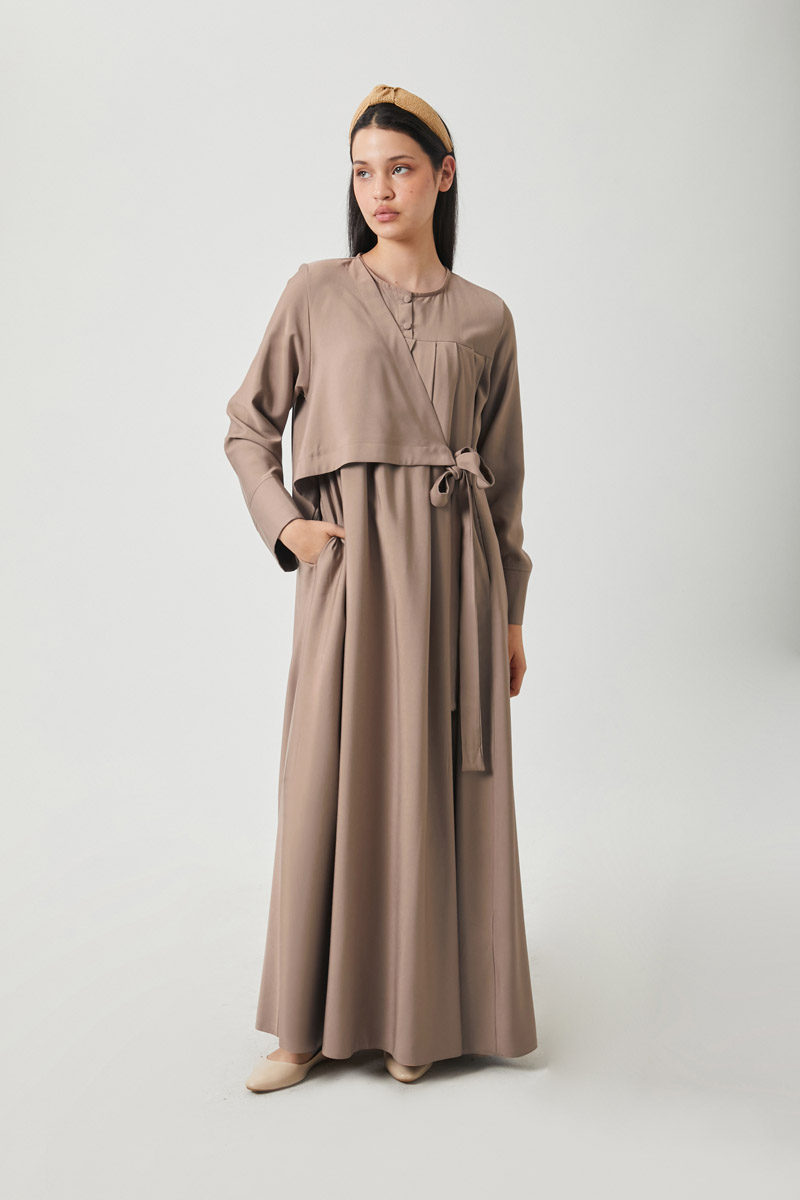 It has a crew neckline with button detail at the front neckline. Features thick cuffs, front and back pleats, front aller detail with side tie, side pockets, and is unlined. Suitable for daily wear.