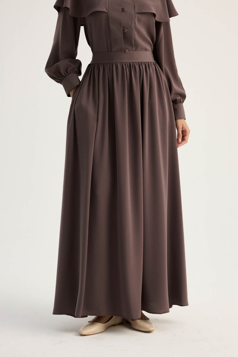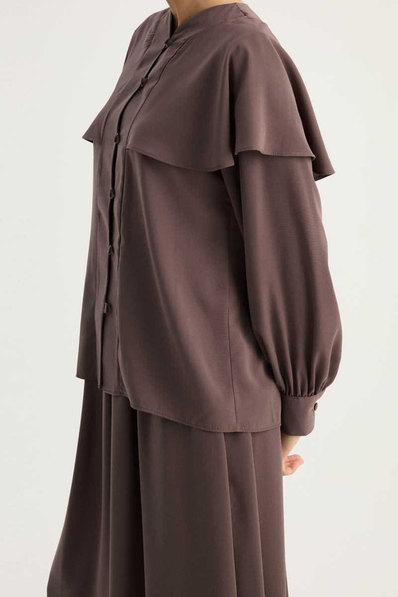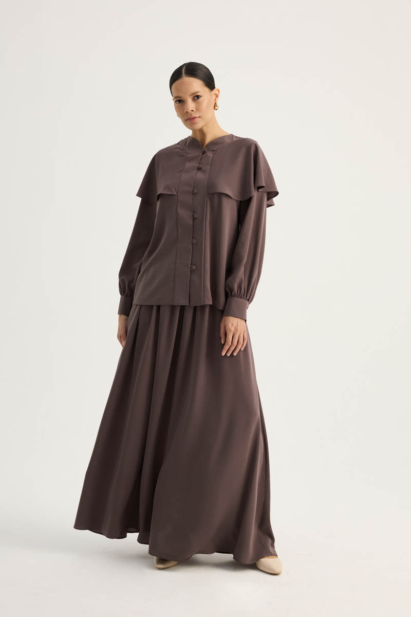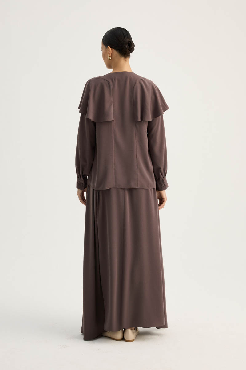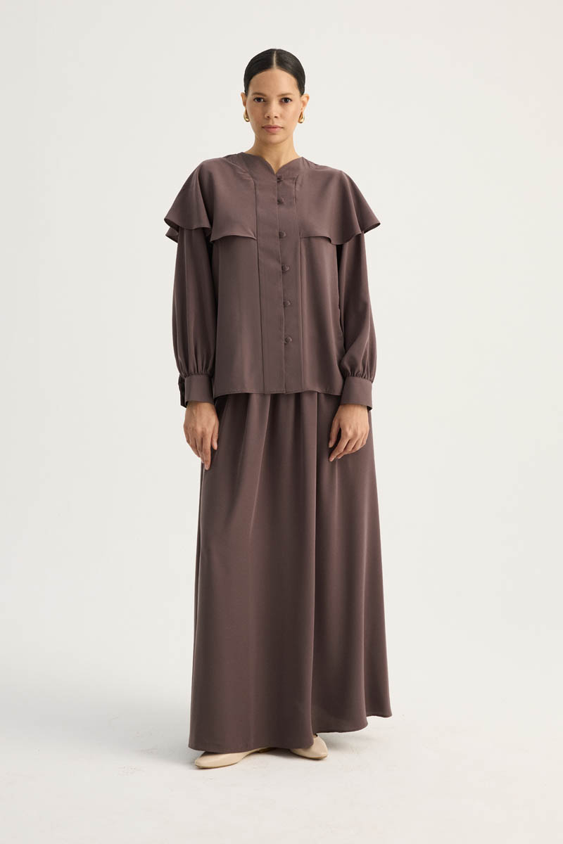 Efil Etek Takım Kahverengi. V yakadır, önden biye düğmelidir, omuzları volanlıdır, bilekten büzgü detaylı ve manşetlidir, etek arkadan lastiklidir, önden düzdür, yandan fermuarlıdır, etek yandan ceplidir, etek kloş kalıptır.