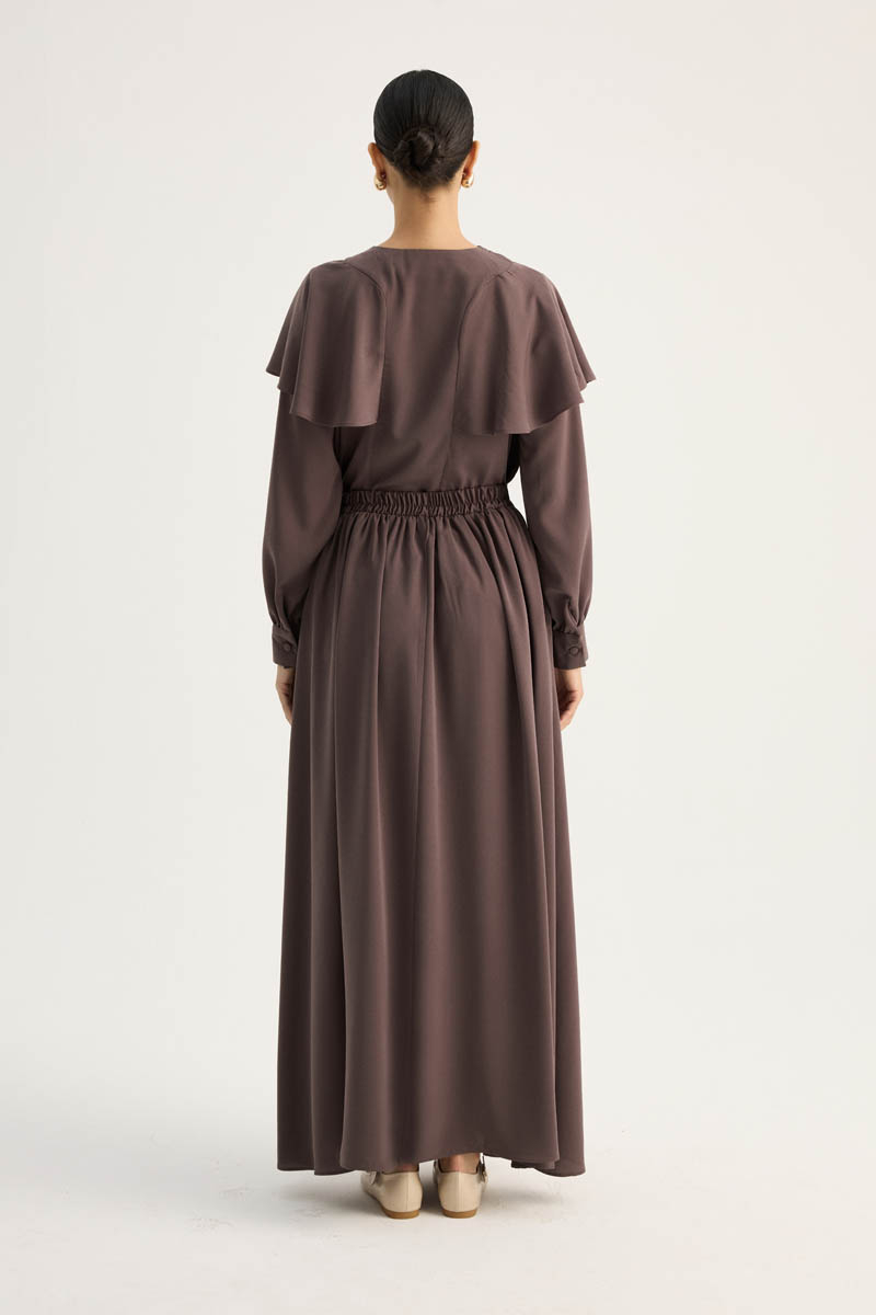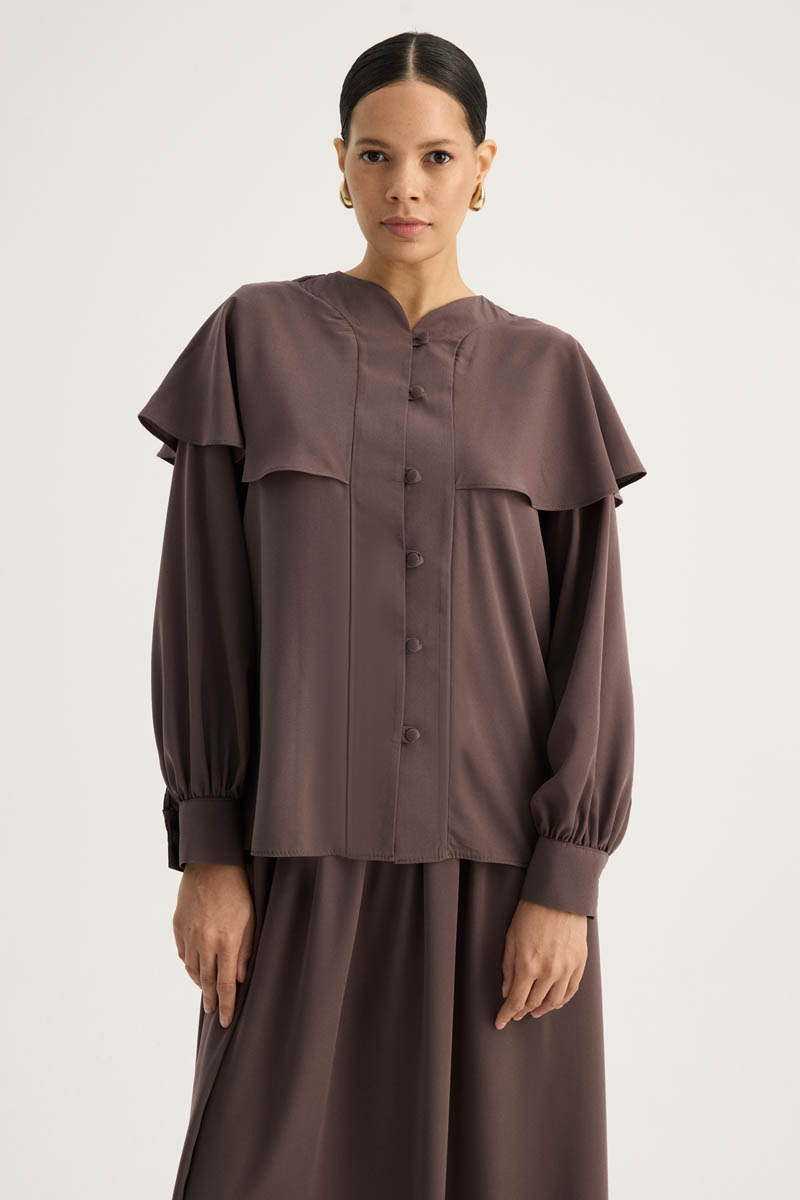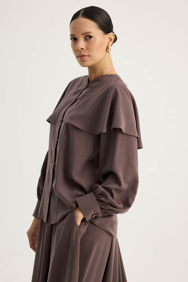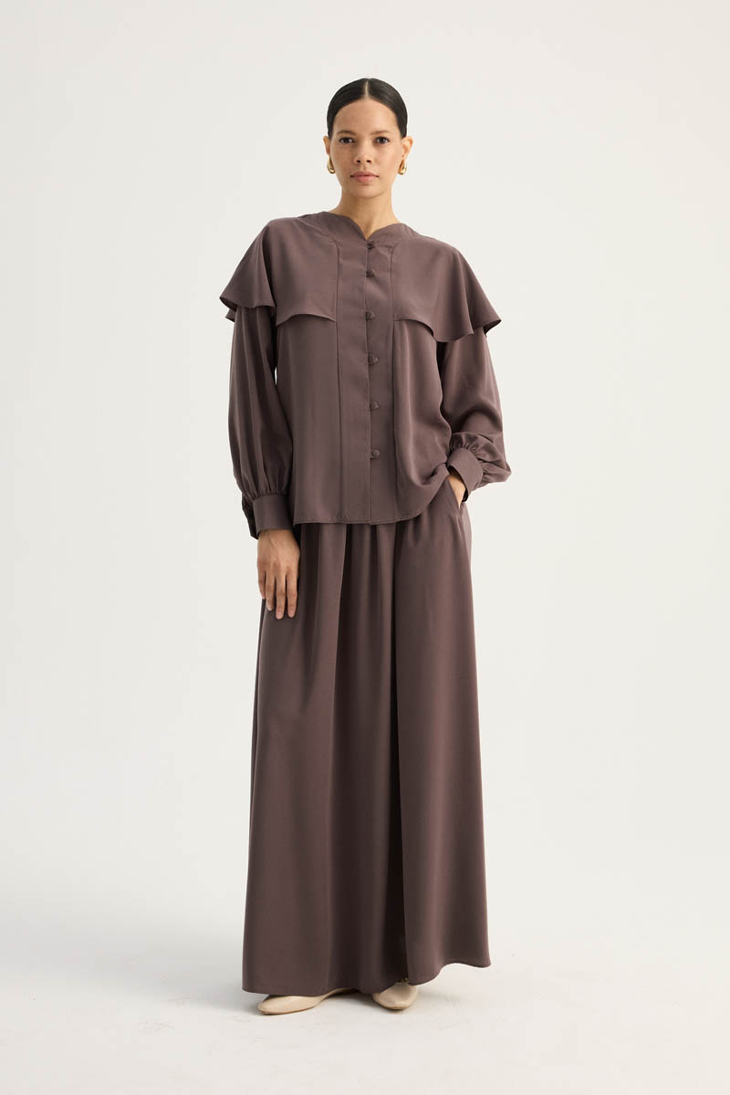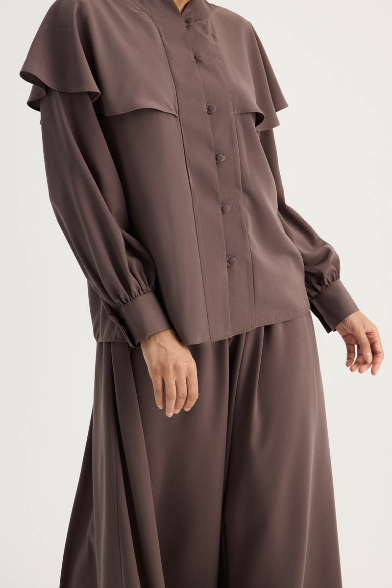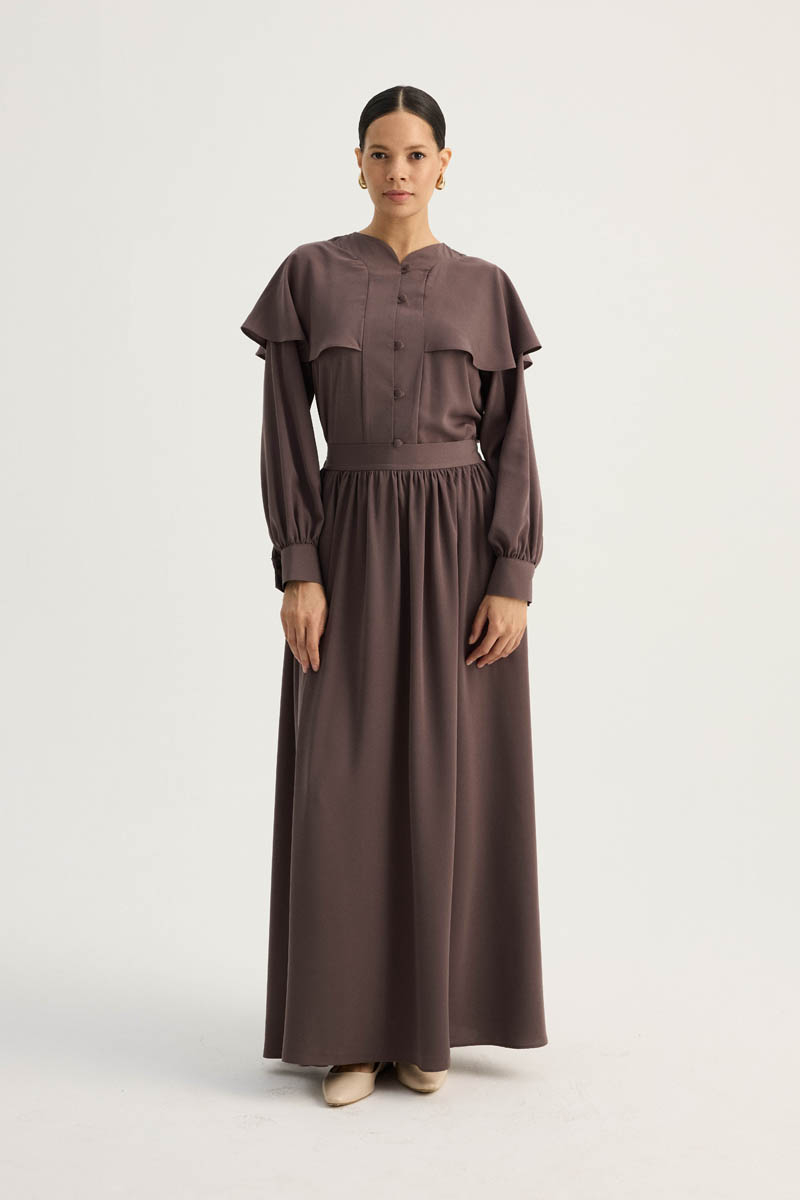 Efil Etek Takım Kahverengi. V yakadır, önden biye düğmelidir, omuzları volanlıdır, bilekten büzgü detaylı ve manşetlidir, etek arkadan lastiklidir, önden düzdür, yandan fermuarlıdır, etek yandan ceplidir, etek kloş kalıptır.